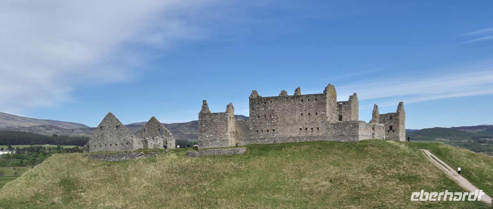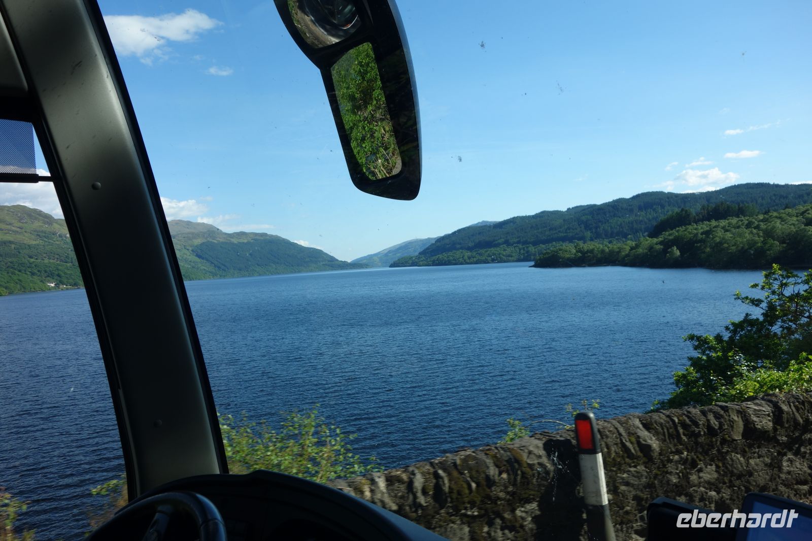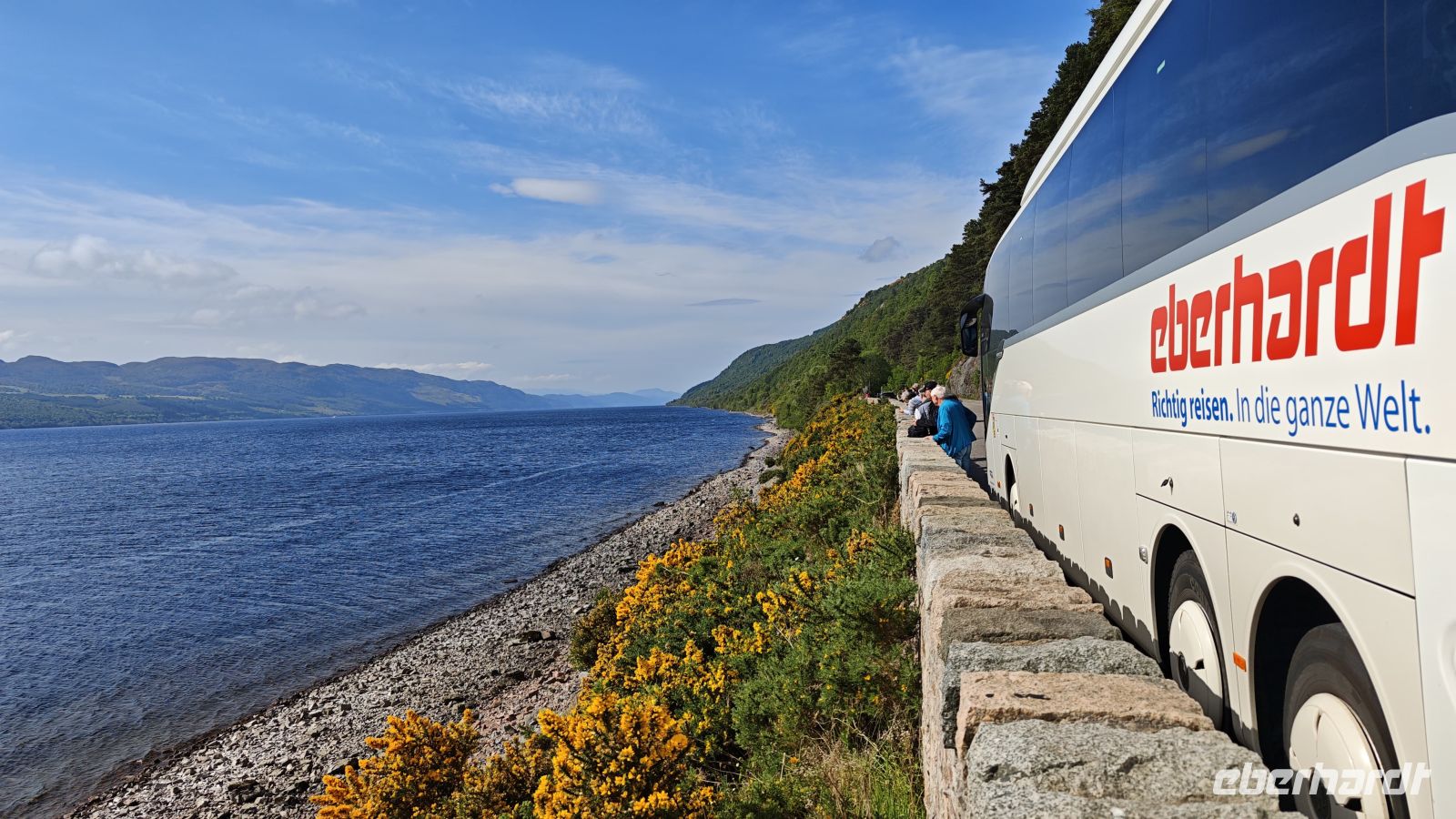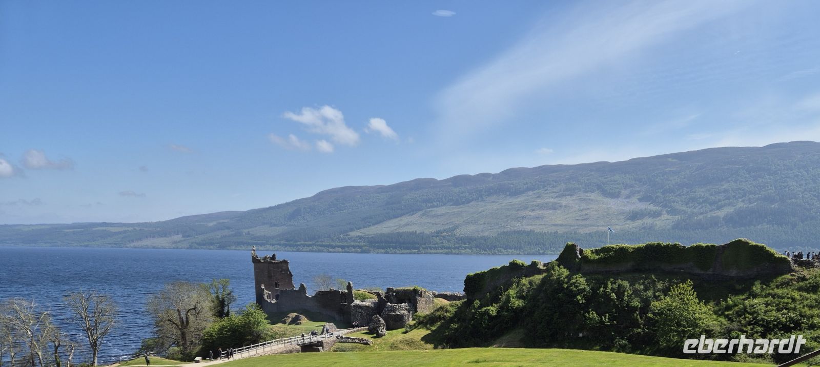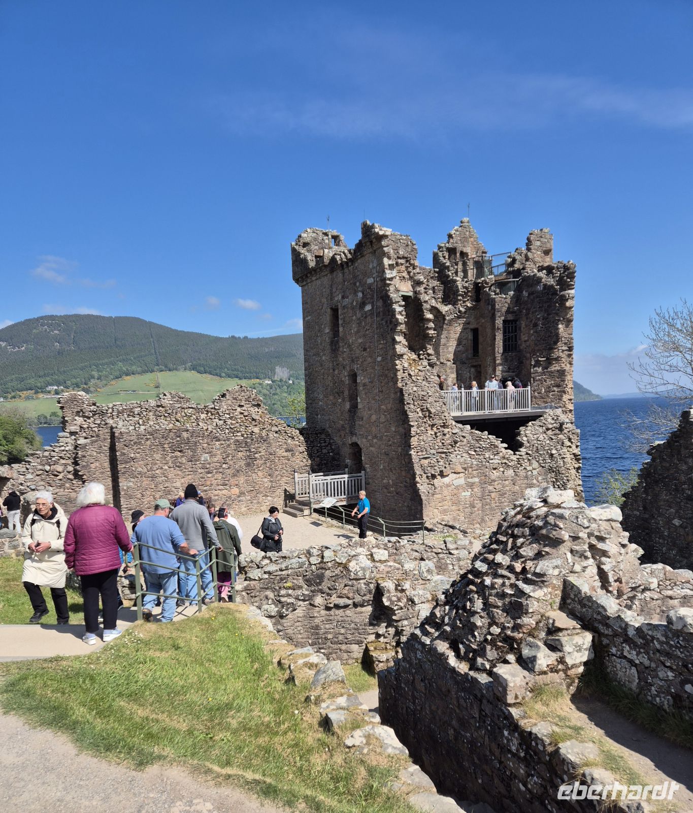 Abschied von unserem Hotel und passieren erneut die heimliche Hauptstadt Inverness und folgen dem Westufer Flusses mit dem Namen -Ness - und des gleichnamigen bekanntesten Sees des Landes dem Loch Ness. Das schöne Wetter macht einen Fotostop zur Pflicht bevor wir das Clansman Hotel erreichen von wo unsere Schifffahrt über den See zur Ruine des legendären Urquhart Castles beginnt. Dort folgt ein 1,5 stündiger Aufenthalt mit der Möglichkeit alle Ecken und Verstecke in der Burg zu inspizieren - dazu gehören auch Kriegsmaschinen und diverse Nachbildungen von anderen "Gerätschaften" mit dem Zweck die Burgmauern zu zerstören. Ein Sovenirladen- mit dem üblichen Sortiment, eine Cafeteria zur Stärkung und ein Videofilm zur Geschichte der Burg erwarten uns.