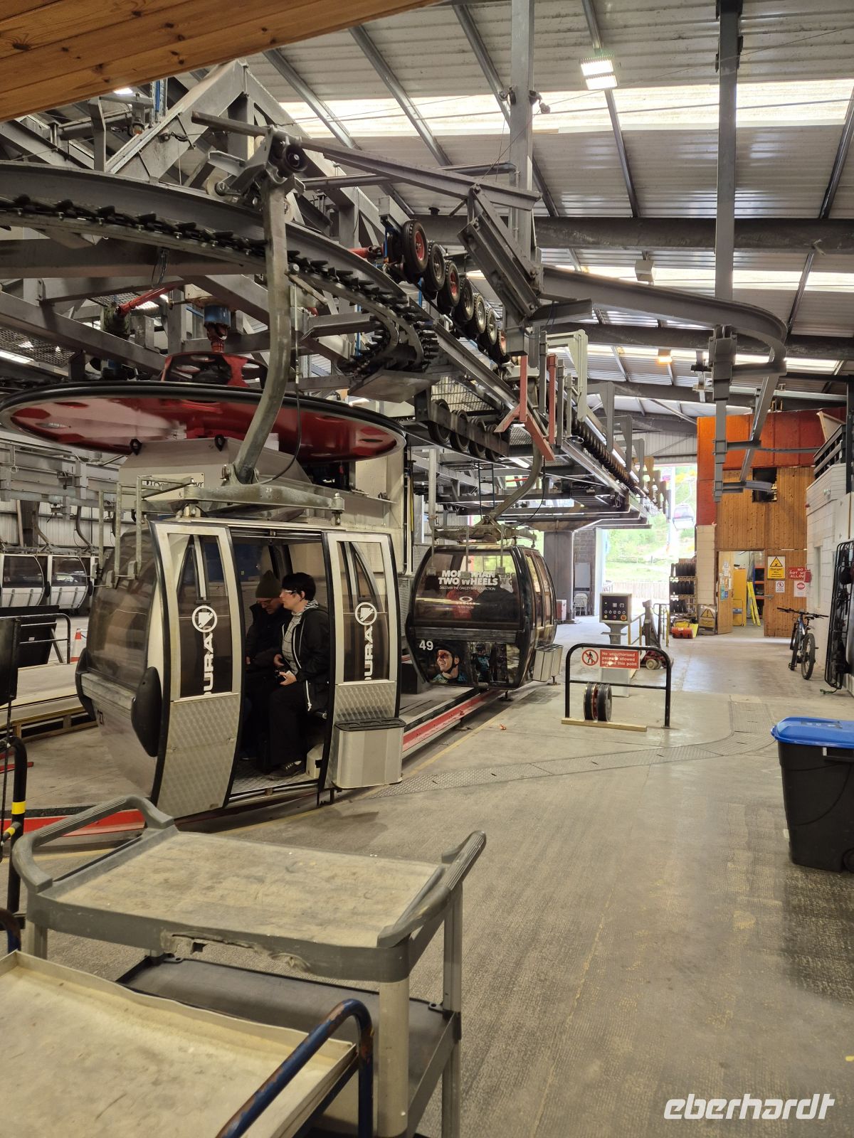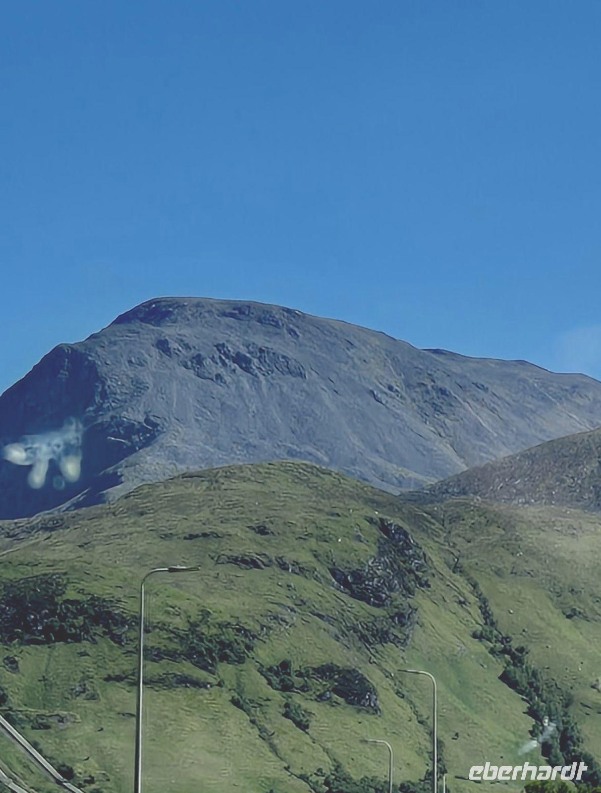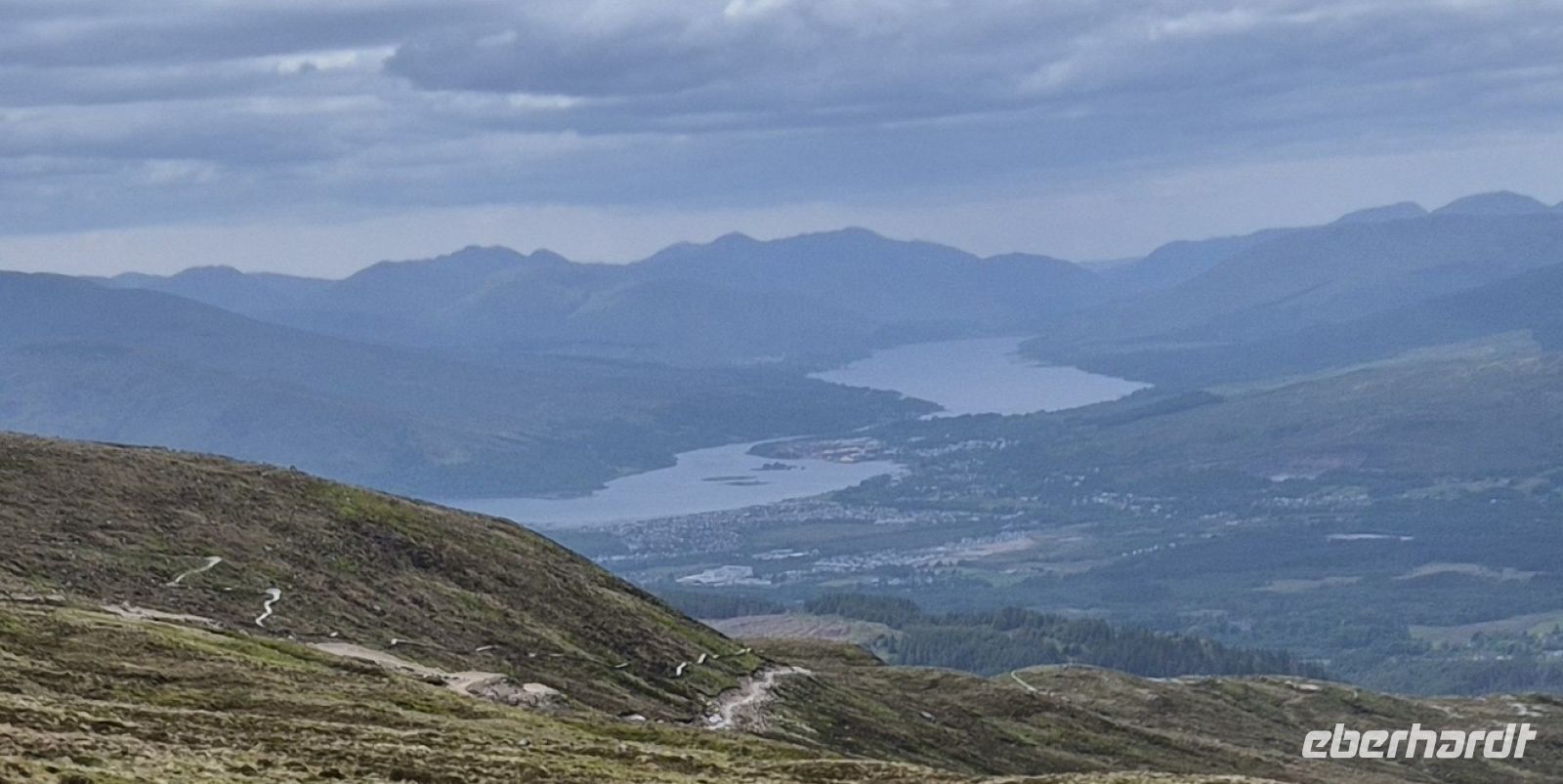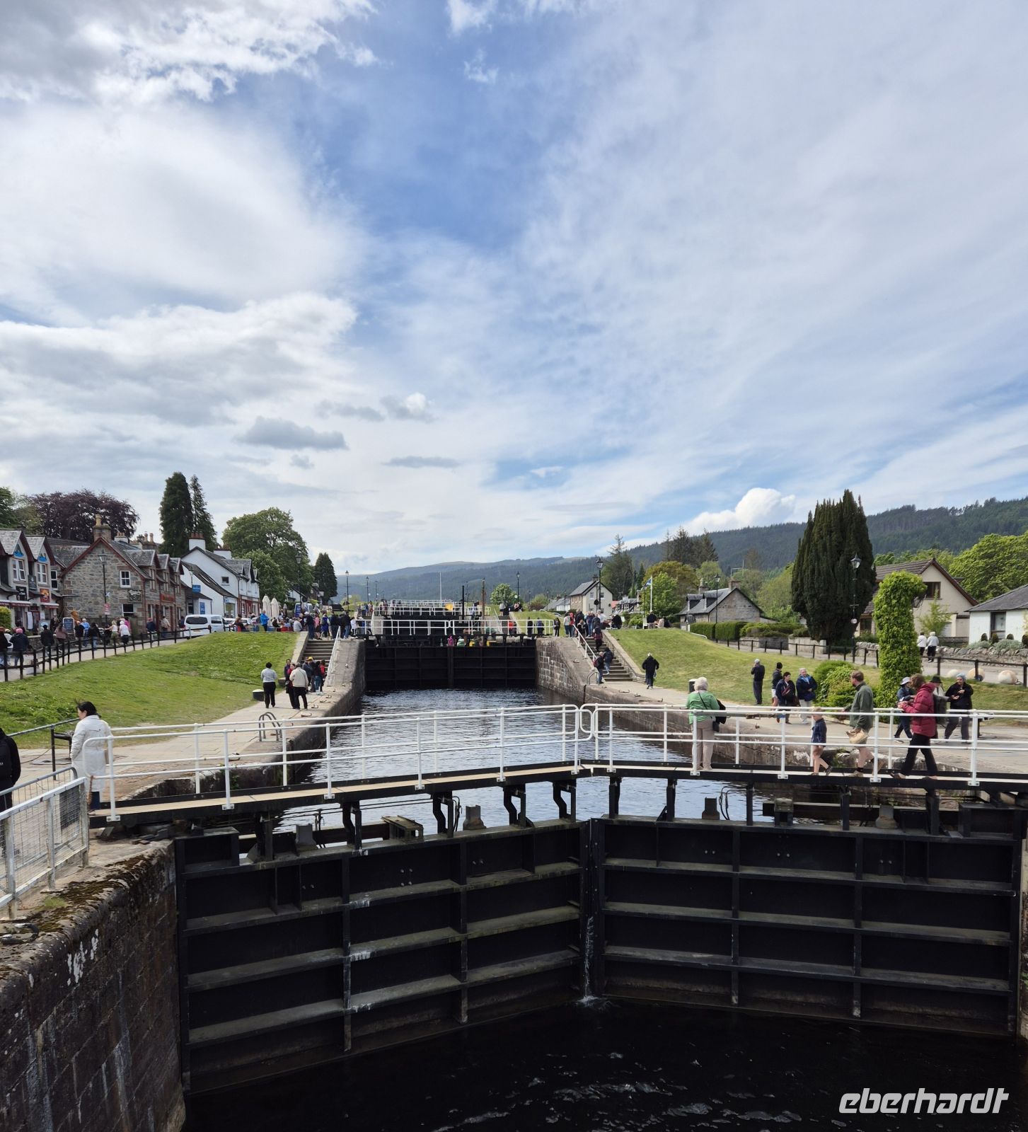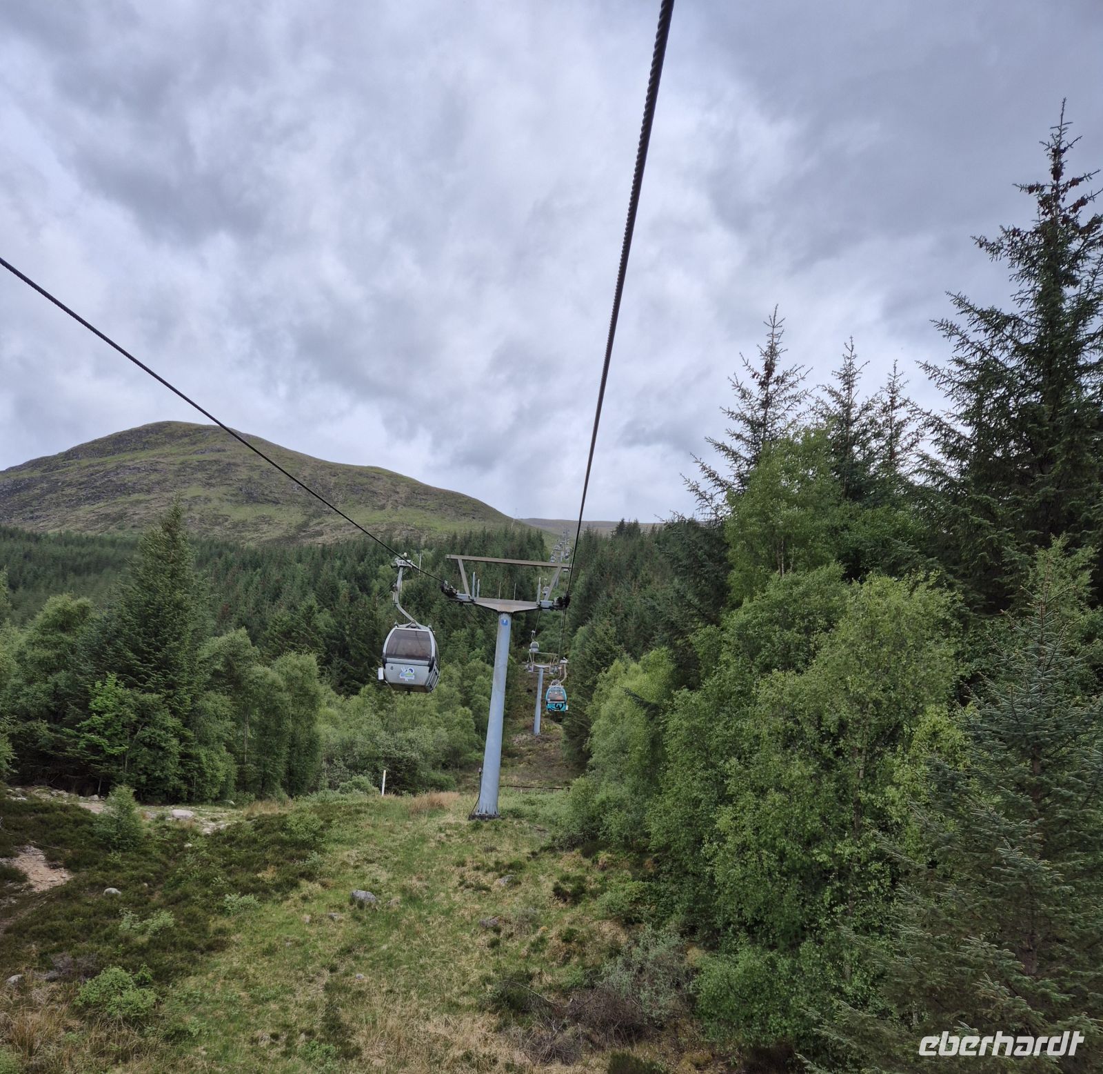 Leicht gestärkt mit den Produkten der Cafeteria folgen wir weiter der lanschaftlich schönen Westuferstraße nur unterbrochen von einem längeren Fotostop bei Fort Augustus. Wie der Name sagt ein ehemaliges Fort plus einem früheren Kloster sind die Namensgeber aber unser Interesse gilt vor allem den Schleusentreppen wo- Glück für uns – tatsächlich einige Segeljachten die Treppen "erklimmen"…leider drängt die Zeit sehr….denn der letzte Programmpunkt des Tages ist die Auffahrt mit der einzigen Kabinenseilbahn Großbritanniens droht zu scheitern- die letzte Abfahrt ist verpflichtend für uns….wir schaffen es in den Gipfelbereich mit der heute – etwas verschleierten- Aussicht zu kommen. Aus Zeitgründen können leider die weiteren Möglichkeiten für einen Rundgang auf dem Aonach Mor - sehr komplizierte Aussprache - nicht wahrgenommen werden. Eine kleine Wanderung würde noch bessere Aussichtsmöglichkeiten auf die Berge und Seen bieten…aber die letzte Abfahrt ist bindend.