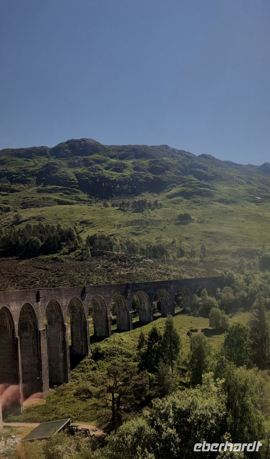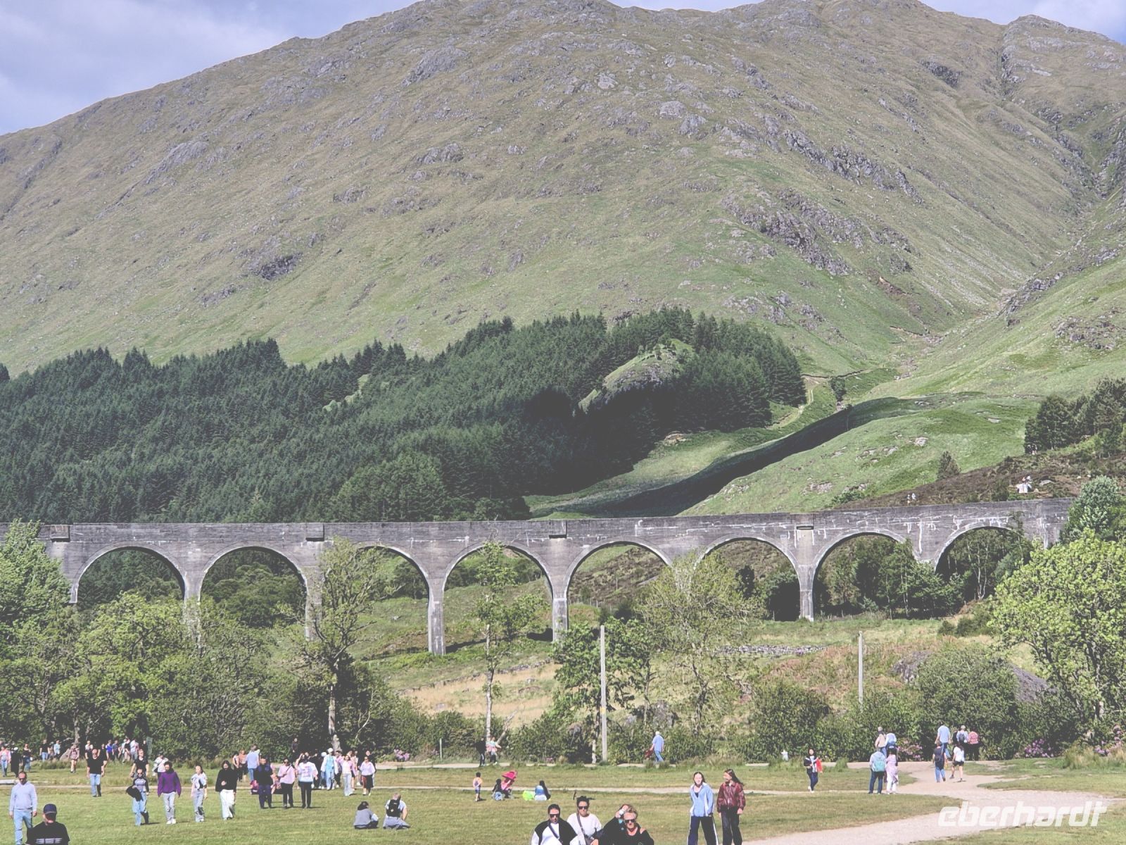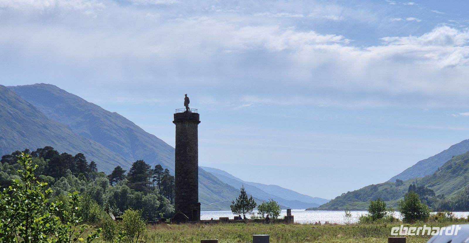 Frühe Abfahrt, wir passieren die lebhafte Stadt - mit einem weiteren militärischen Namen Ft. William und kommen vorbei an einer ganzen Reihe von Seen zur malerisch gelegenen Burg Eilean Donan Castle die bei unserer Ankunft schon heftig von Reisegruppen "heimgesucht" ist. Der Grund ist naheliegend: malerisch und beherrschend in toller Lage war die Burg war schon oftmalig Filmkulisse und wir besuchen die Anlage mit audio guides. Auch auf der Weiterfahrt fasziniert die Landschaft, mehrere Fotostops werden unterwegs eingelegt…u.a. an der eleganten Brücke auf die Isle of Skye. Auf der Insel hat man schöne Blicke auf die Nachbarinseln bevor wir vom Fährhafen Armadale nach Mallaig übersetzen. Mit Ausblicken auf die Isle of Skye und später wilder Berg-und Seelandschaften erreichen wir den Parkplatz beim Glenfinnan Monument- unseren Bus können wir im zweiten Anlauf dort parken. Der Ort ist aus zweierlei Gründen wichtig und interessant. Zunächst interessiert es alle Teilnahmer die legendäre Eisenbahnlinie und deren aus Harry Potter Filmen bekannten Brücke des Jacobite Steam Trains. Es ist „der“ Fotoblick auf Brücke und den Zug- mit dem wir am kommenden Tag selbst fahren werden - der dann von tausenden von "Train Spottern"- also Touristen sehnlichst erwartet wird. Geschichtlich wichtiger ist aber am gleichen Ort befindliche Glenfinnan Monument, eine Säule die an die Erhebung der Schotten unter Bonnie Prince Charlie gegen die Engländer erinnert und an der Stelle steht wo die Kampagne zur Machtübernahme in Schottland mit seiner Anlandung begann und endete. Der gescheiterte "Monarch" steht auf der Spitze des Denkmals. Letzter Programmpunkt eines ereignisreichen Tages ist der Fotostop an der Schleusentreppe genannt Neptun’s Staircase - ähnlich wie die Treppe bei Fort Augustus- im Rahmen des Caledonian Canals. Caledonia ist übrigens der römische Name für Schottland. Übernachtung in unserem Hotel am See