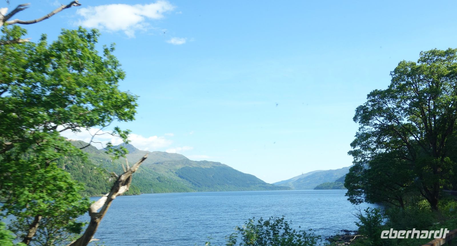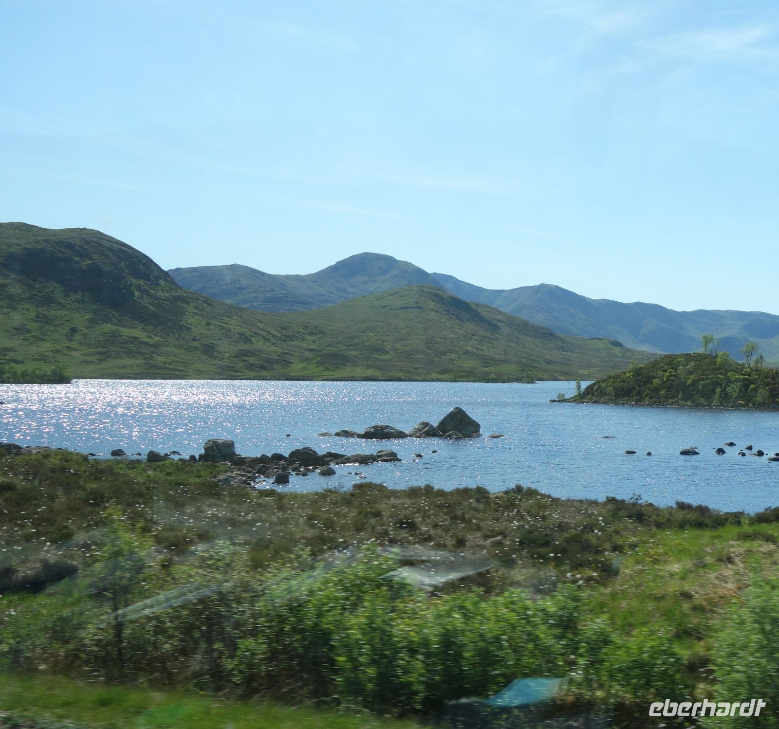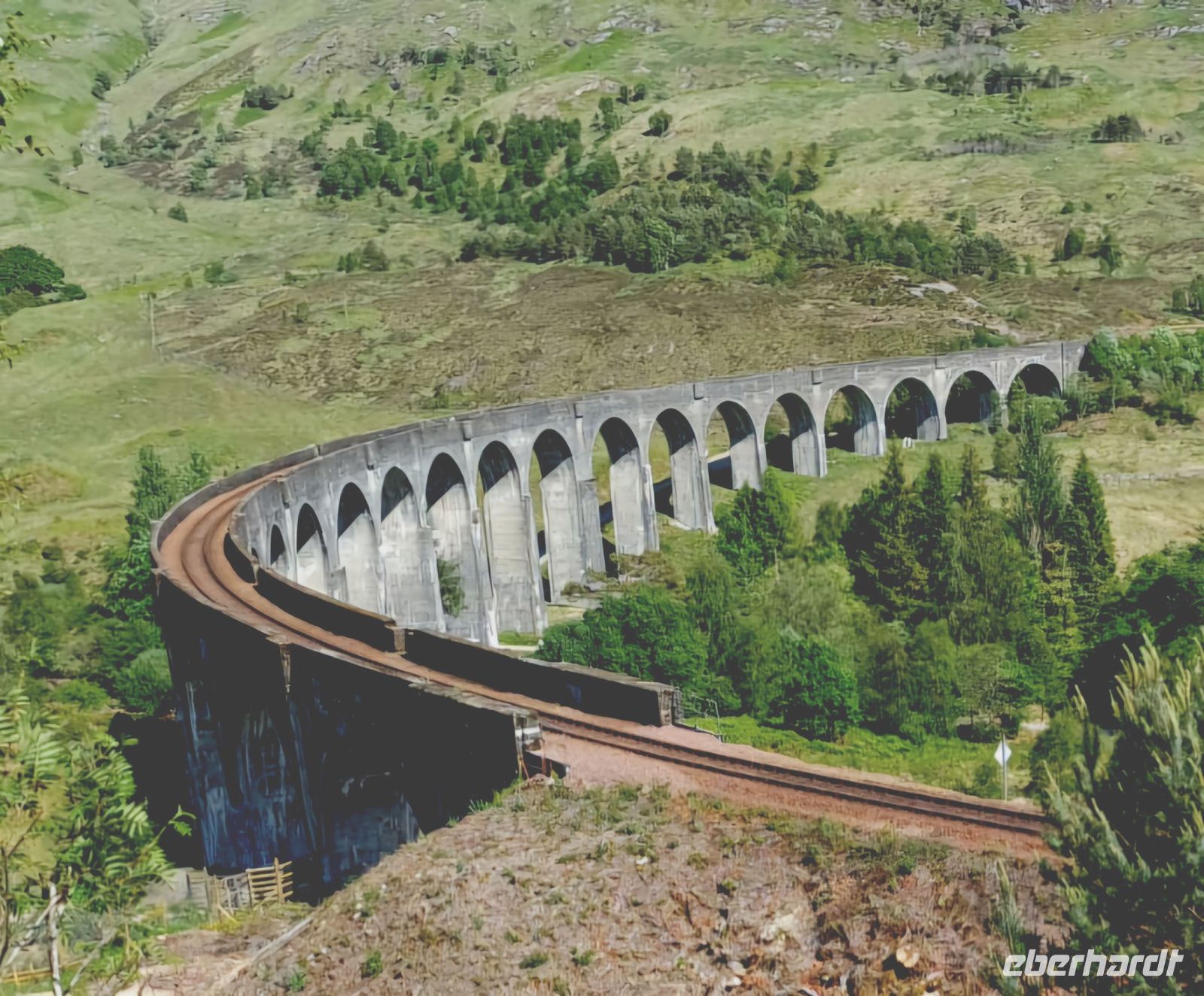 Frühe Abfahrt, wir passieren die lebhafte Stadt - mit einem weiteren militärischen Namen Ft. William und kommen vorbei an einer ganzen Reihe von Seen zur malerisch gelegenen Burg Eilean Donan Castle die bei unserer Ankunft schon heftig von Reisegruppen "heimgesucht" ist. Der Grund ist naheliegend: malerisch und beherrschend in toller Lage war die Burg war schon oftmalig Filmkulisse und wir besuchen die Anlage mit audio guides. Auch auf der Weiterfahrt fasziniert die Landschaft, mehrere Fotostops werden unterwegs eingelegt…u.a. an der eleganten Brücke auf die Isle of Skye. Auf der Insel hat man schöne Blicke auf die Nachbarinseln bevor wir vom Fährhafen Armadale nach Mallaig übersetzen. Mit Ausblicken auf die Isle of Skye und später wilder Berg-und Seelandschaften erreichen wir den Parkplatz beim Glenfinnan Monument- unseren Bus können wir im zweiten Anlauf dort parken. Der Ort ist aus zweierlei Gründen wichtig und interessant. Zunächst interessiert es alle Teilnahmer die legendäre Eisenbahnlinie und deren aus Harry Potter Filmen bekannten Brücke des Jacobite Steam Trains. Es ist „der“ Fotoblick auf Brücke und den Zug- mit dem wir am kommenden Tag selbst fahren werden - der dann von tausenden von "Train Spottern"- also Touristen sehnlichst erwartet wird. Geschichtlich wichtiger ist aber am gleichen Ort befindliche Glenfinnan Monument, eine Säule die an die Erhebung der Schotten unter Bonnie Prince Charlie gegen die Engländer erinnert und an der Stelle steht wo die Kampagne zur Machtübernahme in Schottland mit seiner Anlandung begann und endete. Der gescheiterte "Monarch" steht auf der Spitze des Denkmals. Letzter Programmpunkt eines ereignisreichen Tages ist der Fotostop an der Schleusentreppe genannt Neptun’s Staircase - ähnlich wie die Treppe bei Fort Augustus- im Rahmen des Caledonian Canals. Caledonia ist übrigens der römische Name für Schottland. Übernachtung in unserem Hotel am See