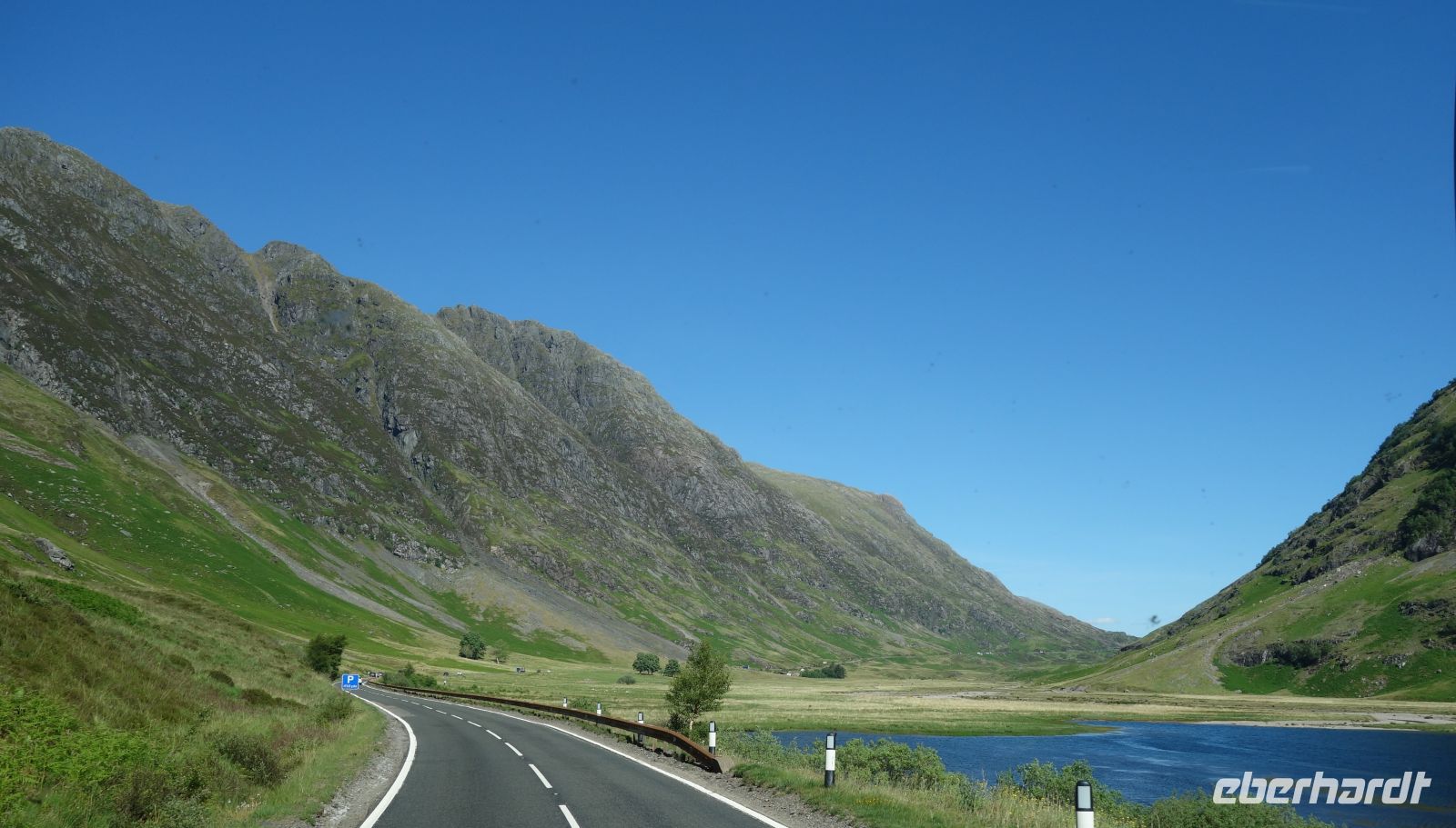 Der heutige Tag ist ebenfalls mit mit einer Reihe von Höhepunkten angefüllt. Der erste Programmpunkt ist die letzte aber sicher interessanteste Zugfahrt mit dem aus Harry Potter Filmen bekannten Jacobite Steam Train auf unserer Reise. Die Namensgebung steht in engem Zusammenhang mit dem Jacobiner Aufstand – siehe Vortag Glenfinnan Monument. Auch heute gabs Einschränkungen hinsichtlich des Einsatzes von einer Dampflokomotive wegen eventuellen Funkenflugs und der möglichen Brandgefahr infolge der herrschenden Trockenheit. Die zweistündige Zugfahrt mit einem unterhaltsamen Stop und interessantem Stellwerksbesuch- die Fahrgäste durften sogar dort die diversen Hebel bedienen- und die Fahrt über die berühmte fotogene Brücke waren ein sicherlich ein Bonbon dieses Tages. Auf Wunsch der Teilnehmer wurde am Endpunkt der Fahrt Fischerdorf Mallaig noch ein Kurzaufenthalt eingelegt. Auf der Rückfahrt nach Fort William konnten noch einmal die landschaftlichen Höhepunkte des Vortages und des Vormittags erlebt werden bevor es weiter ab Lough Linnhe-einem Meerarm an dem unser Hotel lag - in das gebirgige Hinterland ging. Landschaftlich und geschichtlich sehr interessant ist das viel besuchte und besungene Tal von Glen Coe. Beim Besucherzentrum konnte man viel über die Geschichte des Massakers von Glen Coe- einem folgenschweren Übergriff englischer Truppen und der herrschenden Verantwortlichen- erfahren. Leider hatten wir nicht viel Zeit die dortigen Informationen zu verarbeiten es lag noch eine lange Strecke vor uns. Es folgte jetzt ein weiterer landschaftlich und geschichtlich besonders schönerAbschnitt durch das Tal Glen Coe. Leider auch ein Tal der Trauer mit einem besonders düsteren Kapitel englischer Verbrechen an der Bevölkerung weshalb das Tal auch das Tal der Trauer und Tränen genannt wird. Wir überqueren eine großartige Hochfläche die schon die schottischen Könige auf ihren Reisen überqueren mussten - ein Hotelname erinnert an die königlichen Gäste - bevor wir dann talwärts den schönsten – und meist besungenen - See Loch Lommond erreichten. Leider auch hier zu wenig Zeit für Fotostops bei der Fahrt entlang des Westufers, nur ein WC Stop bei Luss fast am Seeende war möglich-und nötig. Die Zeit drängte aber außer einem Stau vor Glasgow den wir elegant ausgewichen sind - wir schafften den Transit durch Schottlands größte Stadt via die Erskine Hängebrücke über den Firth of Clyde recht schnell und zügig. Endlich erreichten wir Peebles mit dem schon äußerlich prachtvollen palastähnlichen Hotel Hydro. Trotz der späten Ankunft um 20:30 hatten wir ein gutes Abendessen ohne Hektik - dank des guten Service des aufmerksamen Personals dort und unserer sehr disziplinierten Teilnehmer. Leider konnten wir - es war einfach zu spät - nicht mehr die sehr stimmungsvolle Bar bzw. den Pub im Hause zu einem gemütlichen Abschlussdrink - also einer sog. "night-cap" genießen.
