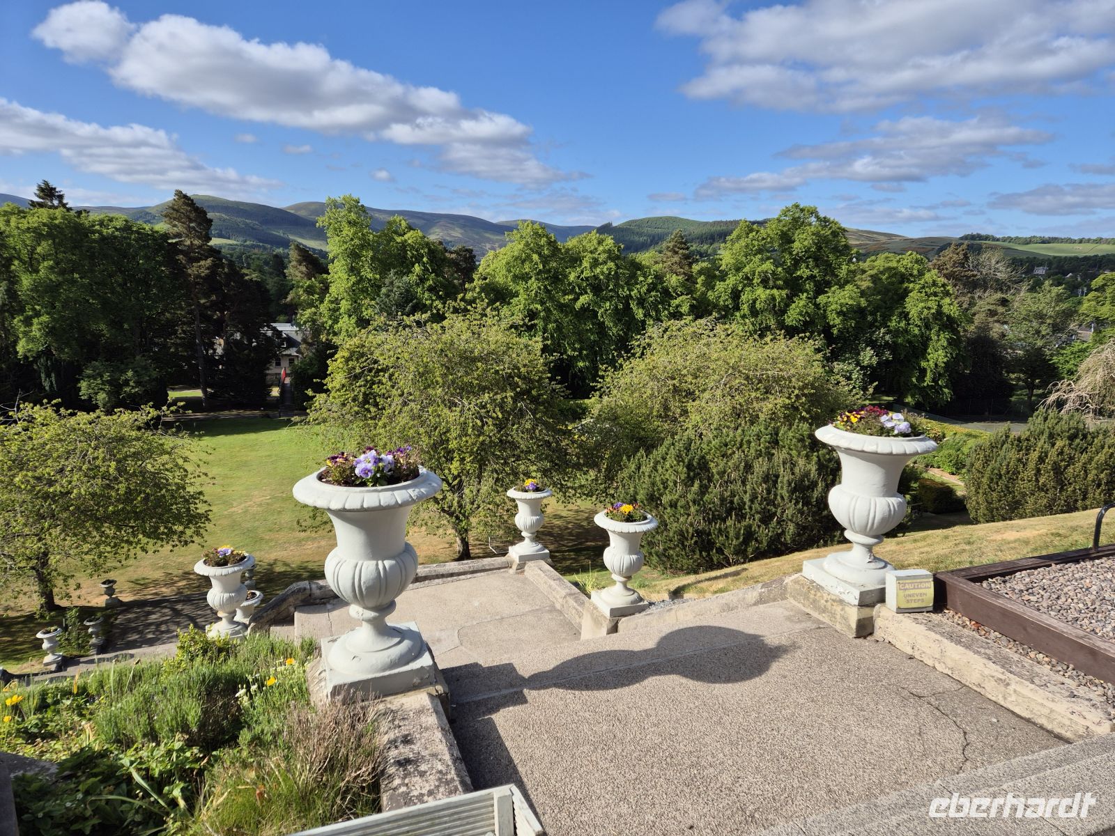 Via Dunfermline geht es über die Halbinsel - mit dem ältesten Golfclub der Welt St. Andrews - in Richtung Perth und zum Herrenhaus Scone Palace nördlich der Stadt. Wir gehen unmittelbar nach Ankunft in das Schloss und werden dort bestens und ausführlich von einer deutschen Führerin durch die Räumlichkeiten geführt und erhalten einen guten Einblick in das Leben des schottischen Adels und einer seiner wichtigen Familien bzw. Clans also die heutigen Besitzer. Der Aufenthalt bietet auch einen wichtigen Abschnitt schottischer Geschichte, da hier (wieder) der schottische Krönungsstein der "stone of Scone" wie ein Heiligtum aufbewahrt wird. Lange Jahre war er ein "Beutestück" der Engländer die ihn unter dem engl. (hölzernen) Krönungsstuhl in Westminster Abbey aufbewahrten- der englische Monarch thronte buchstäblich auch dem dem schottischen Krönungssitz .