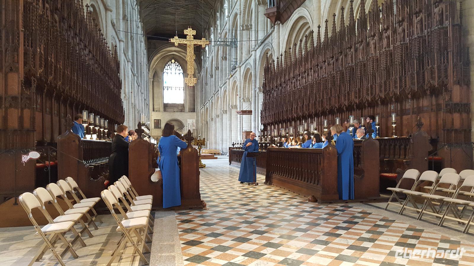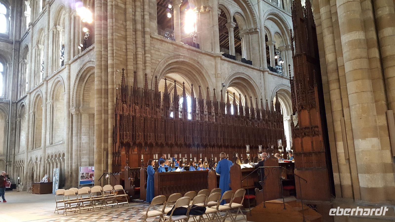 Überwältigt von den Eindrücken ging es weiter nach Peterbourough, wo uns die Kathedrale dort noch einmal überraschte: ein architektonisches Kleinod, aufgrund ihrer dreiteiligen Fassade und durchgängigen Asymmetrie eine der ungewöhnlichsten mittelalterlichen Kathedralen Großbritanniens. Von der tollen Akkustik gebannt lauschten wir dort einer Chorprobe mit Orgelmusik...