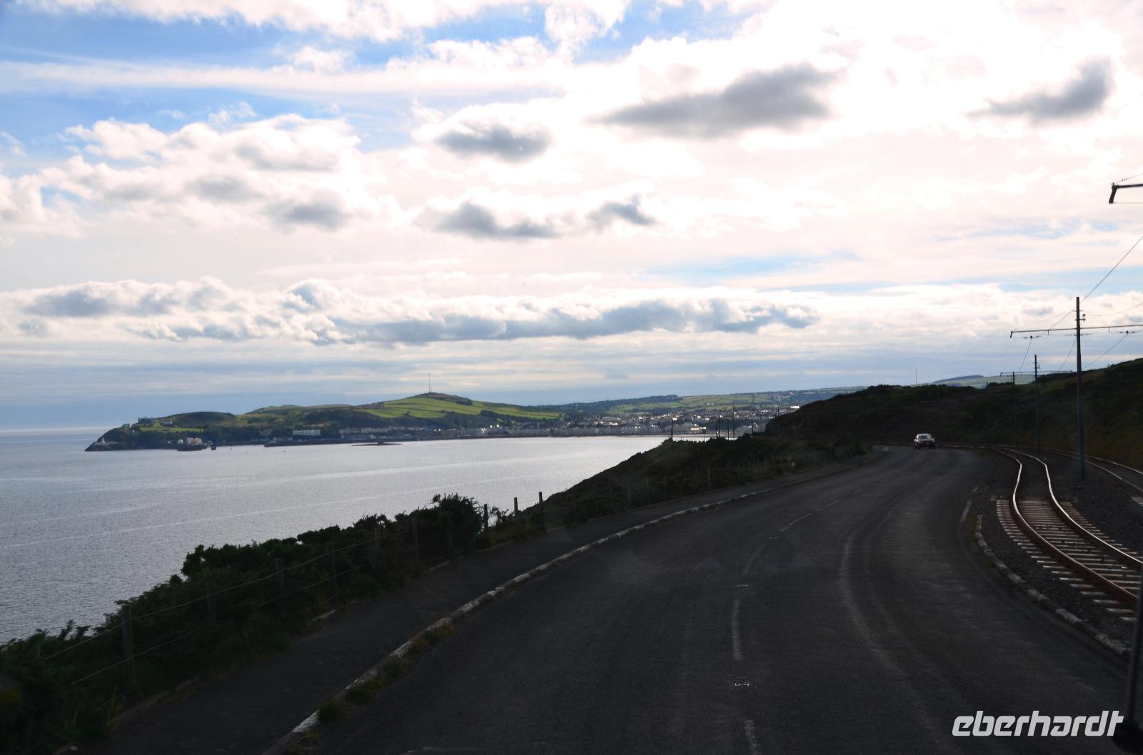 Zuerst fahren wir heute hinauf zum Start und Ziel der Rennstrecke oberhalb von Douglas. Von hier wieder hinunter in die Stadt und zum Bahnhof Douglas.