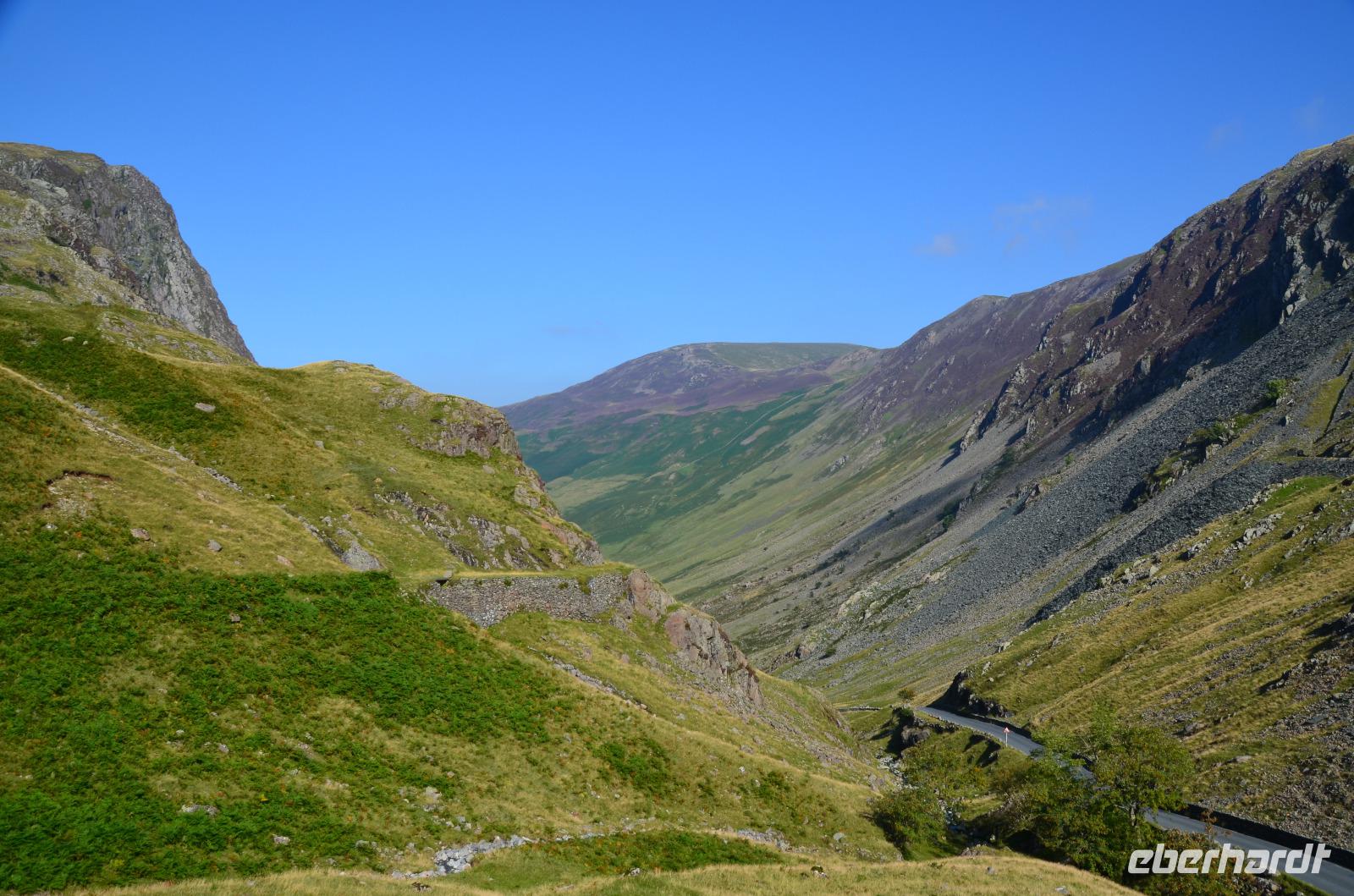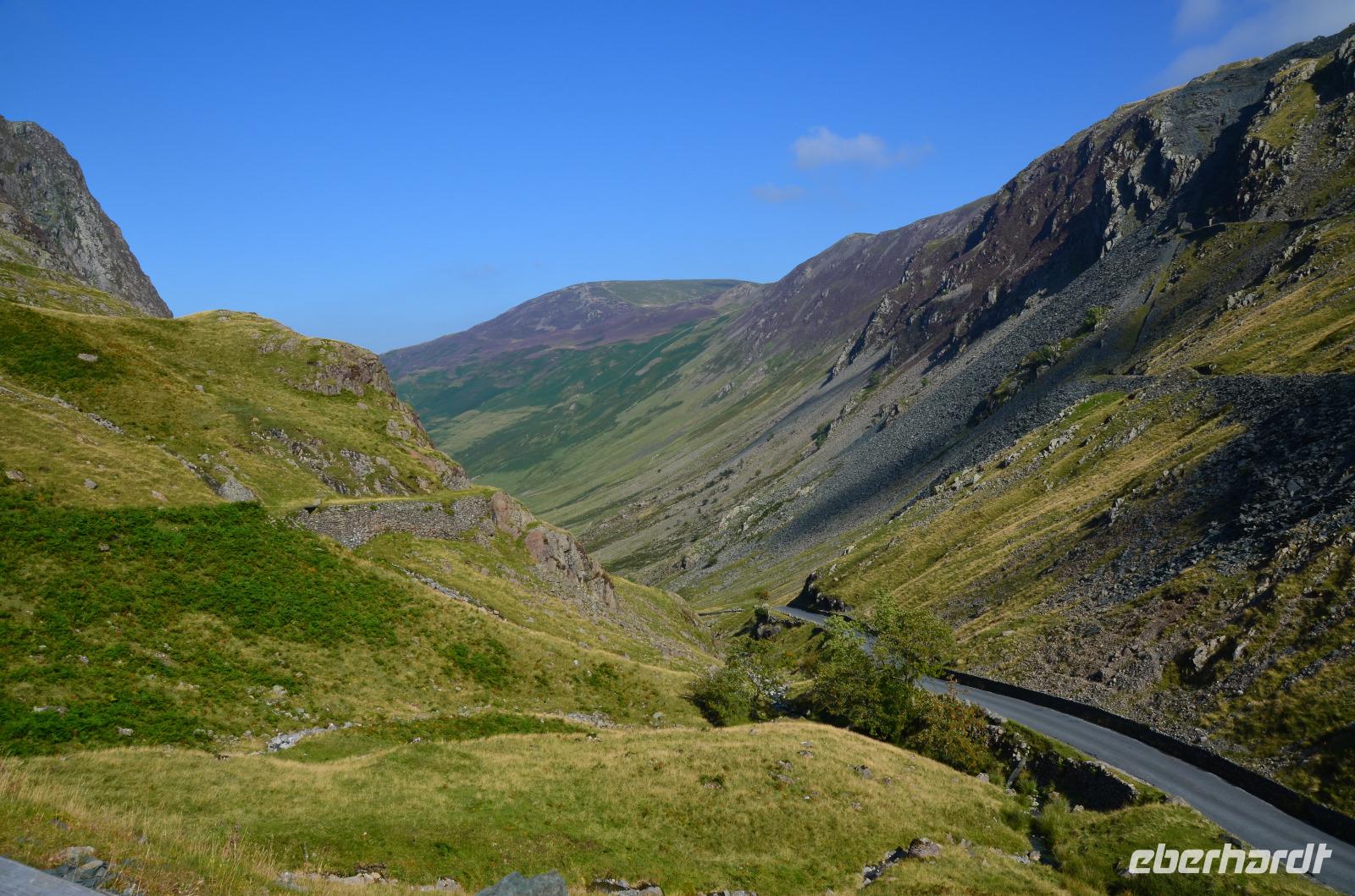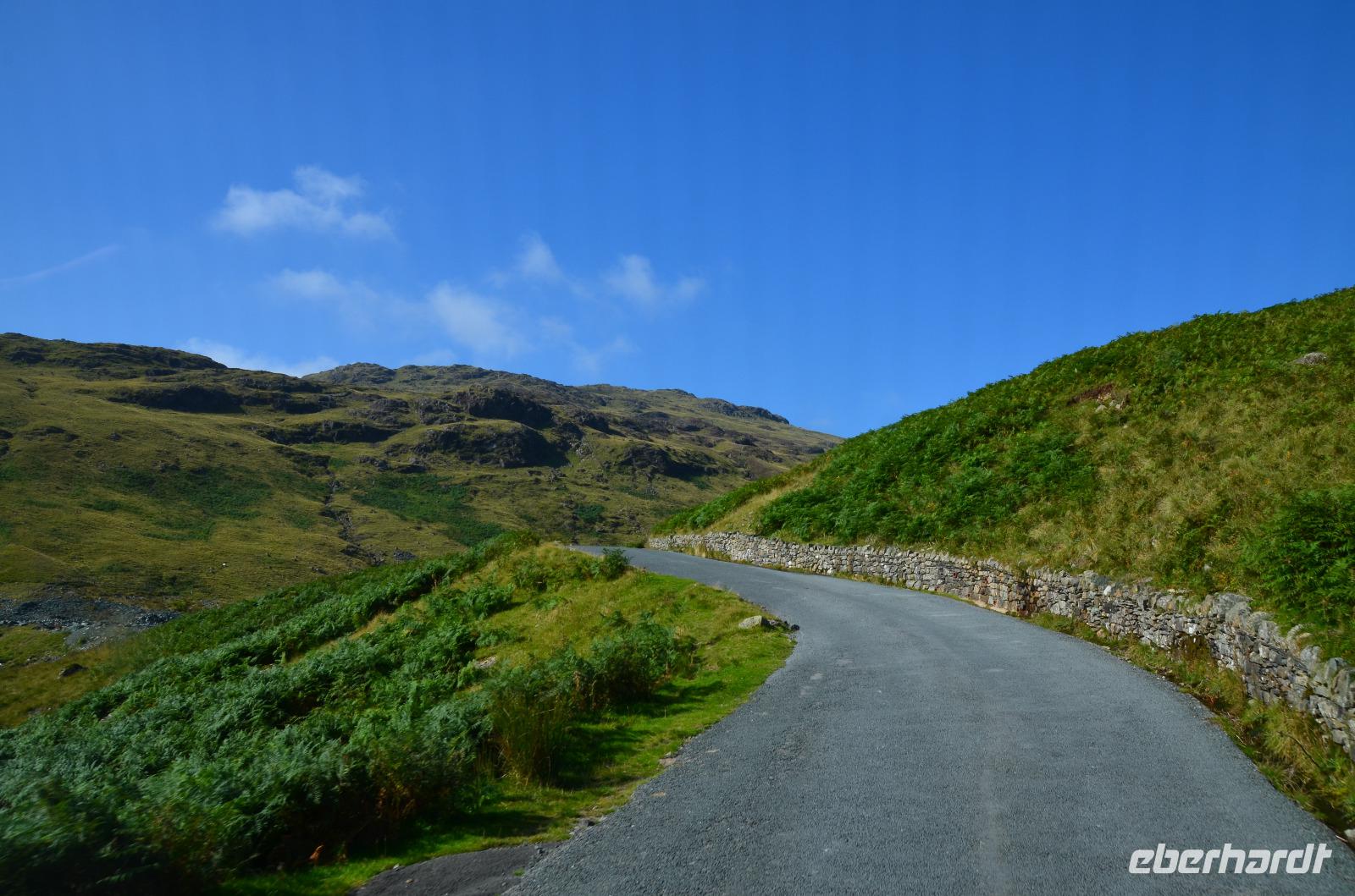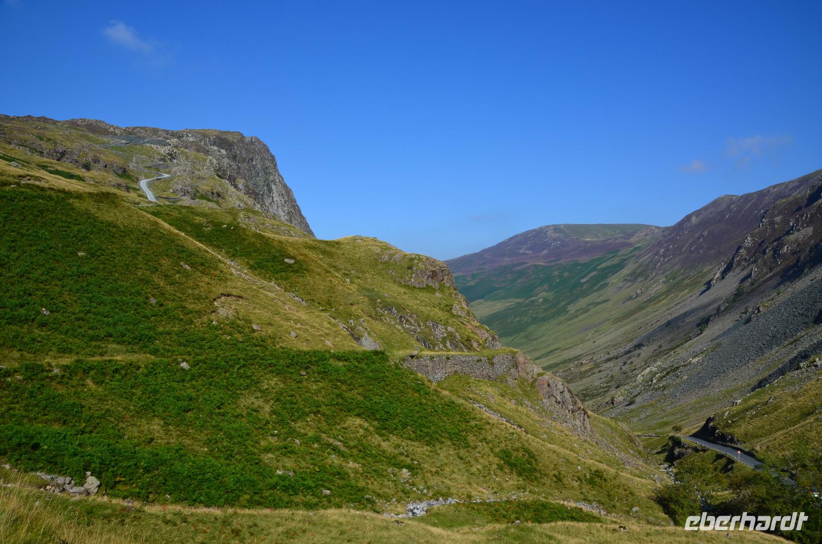 Heute unternehmen wir zuerst eine Seenrundfahrt im Borrowdale, jedoch erst am Hornister Pass können wir auf der engen Straße einen ausgiebigen Fotostopp machen und erkunden das alte Minengelände auf dem 356 m hohen Gebirgspass.