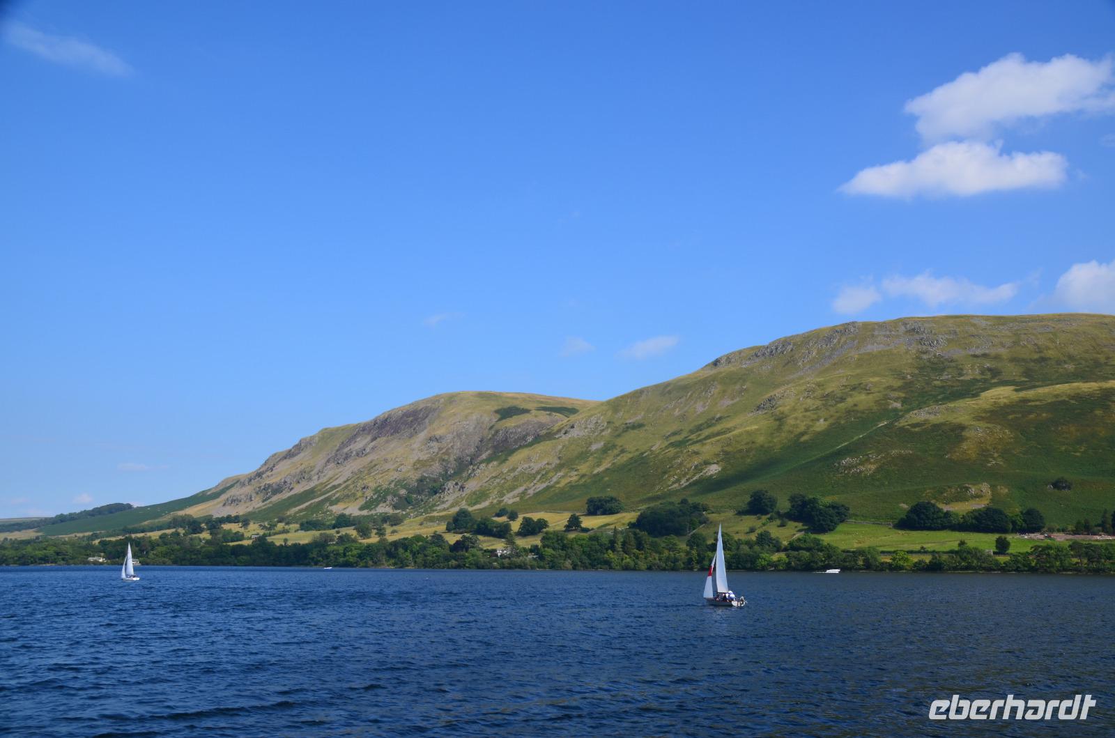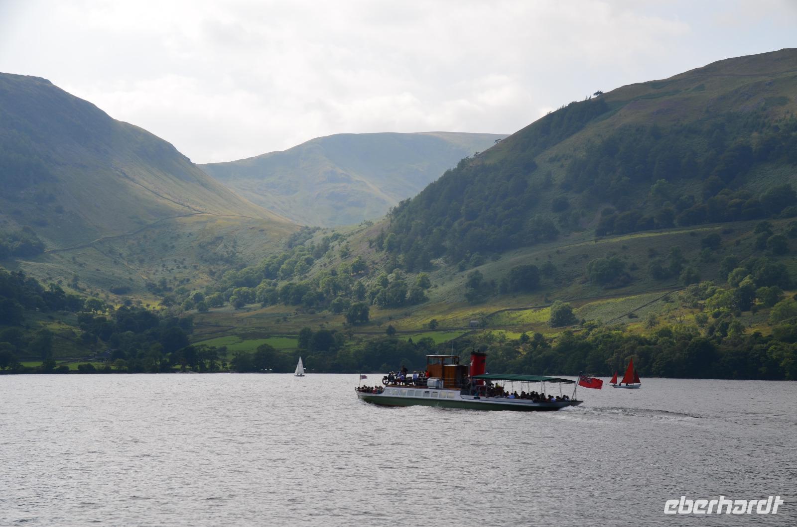 Dann geht es über Rydal und Coniston zum Coniston Water, an ihm entlang bis Newby Bridge und von hier zum Lake Windermere. In Bowness-on-Windermere machen wir an der Uferpromenade Halt, bevor es dann hinauf zum Kirkstone Pass, dem mit 454 m höchsten befahrbaren Pass des Lake Districts geht. Nördlich, vorbei an den Brüderseen erreichen wir Glenridding, den Ort am südlichen Ende des Ullswater. Am Schiffsanleger wartet eines der alten Dampfschiffe und bringt uns in landschaftlich wunderschöner Fahrt zur Pooley Bridge im Norden.