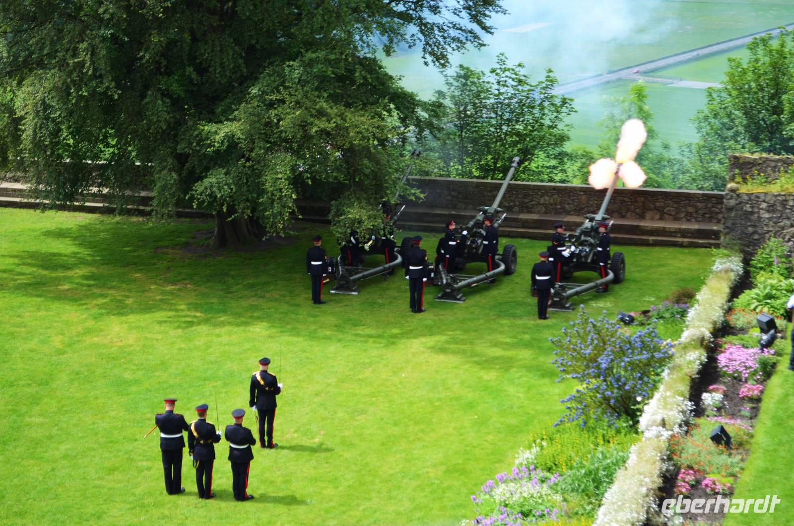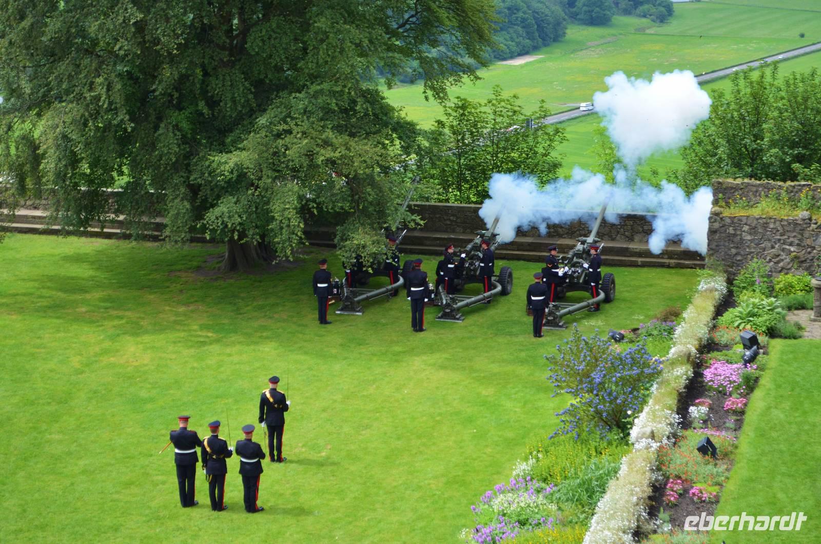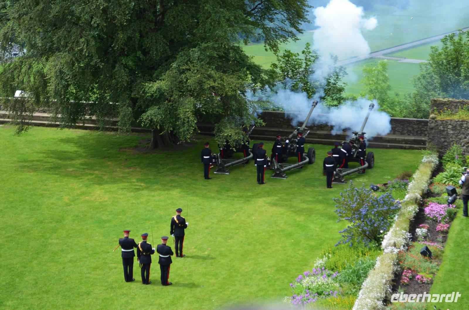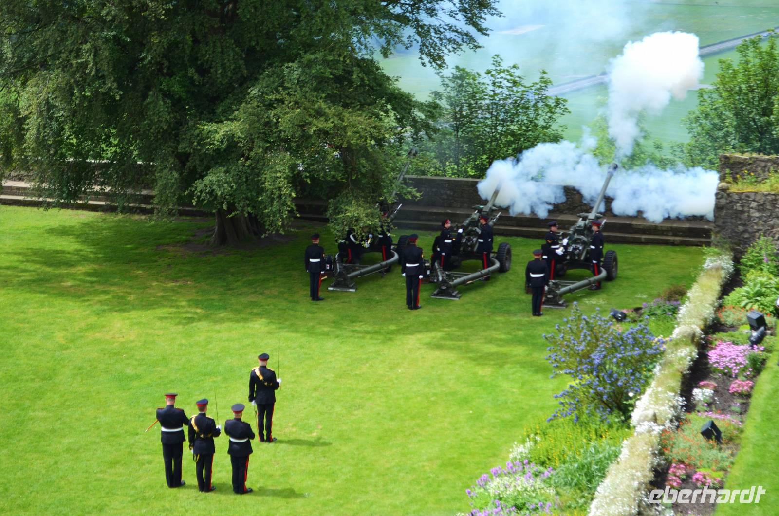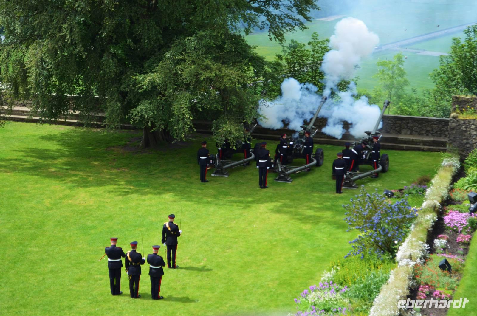 Den Abschluss unseres Besuchs auf der Burg bildet ein Ehrensalut von 21 Schuss aus drei Kanonen der Army anlässlich des Tronjubileums der Queen.