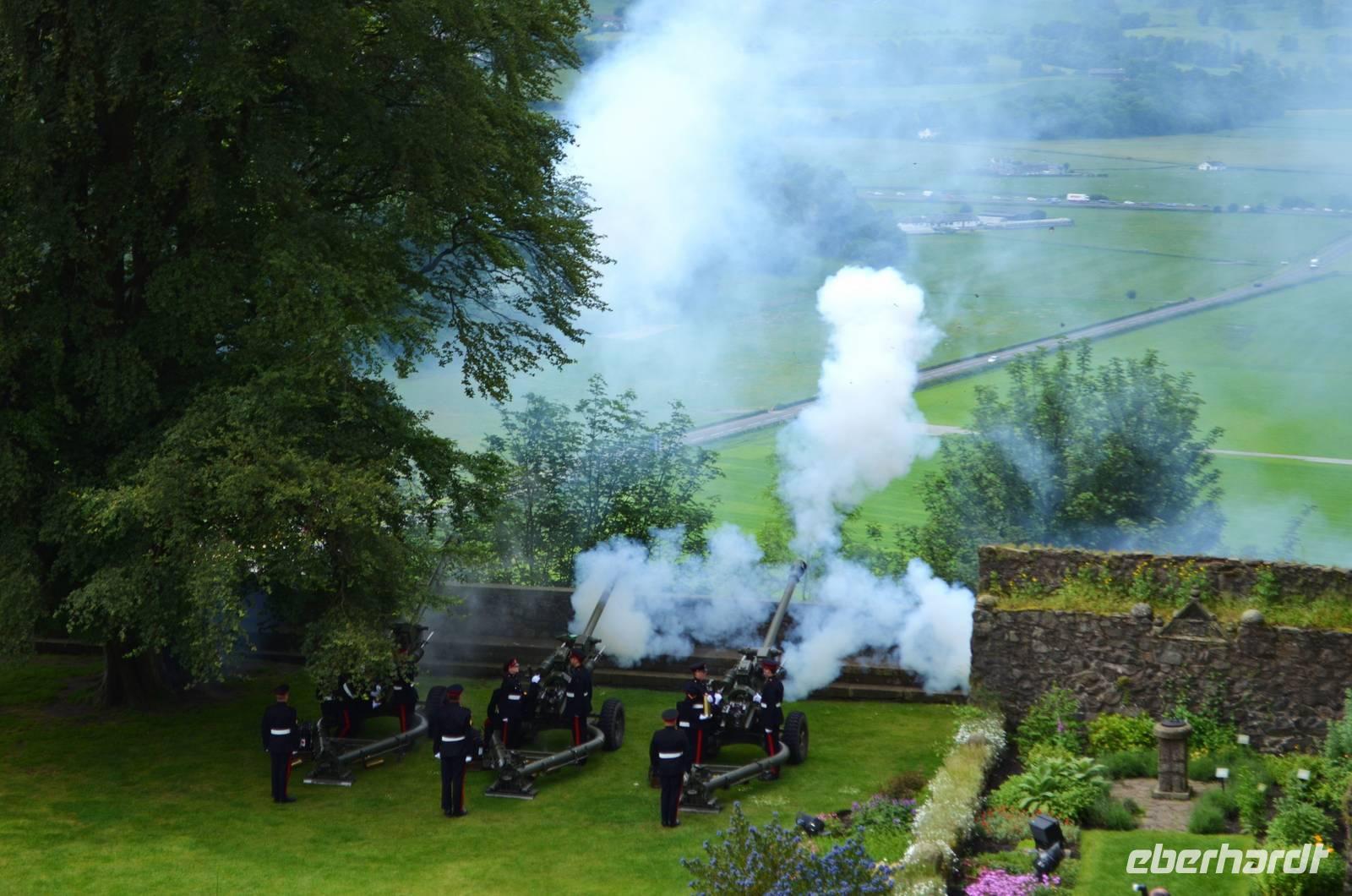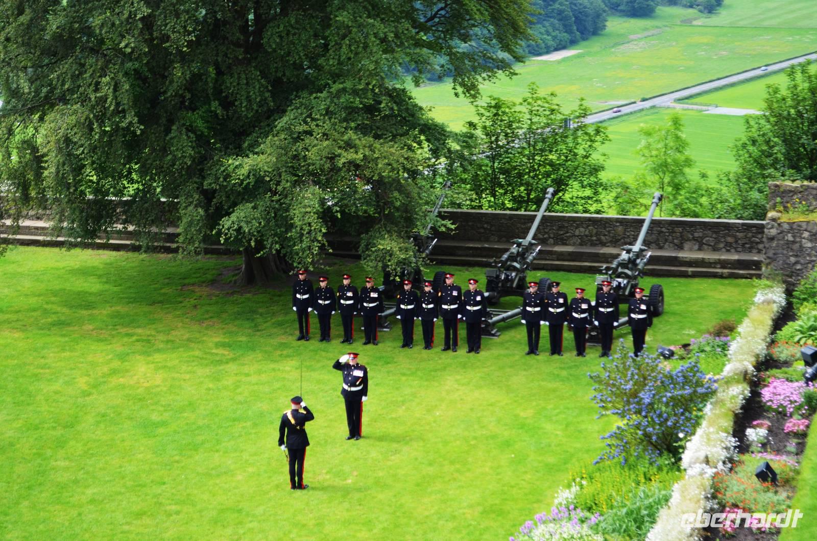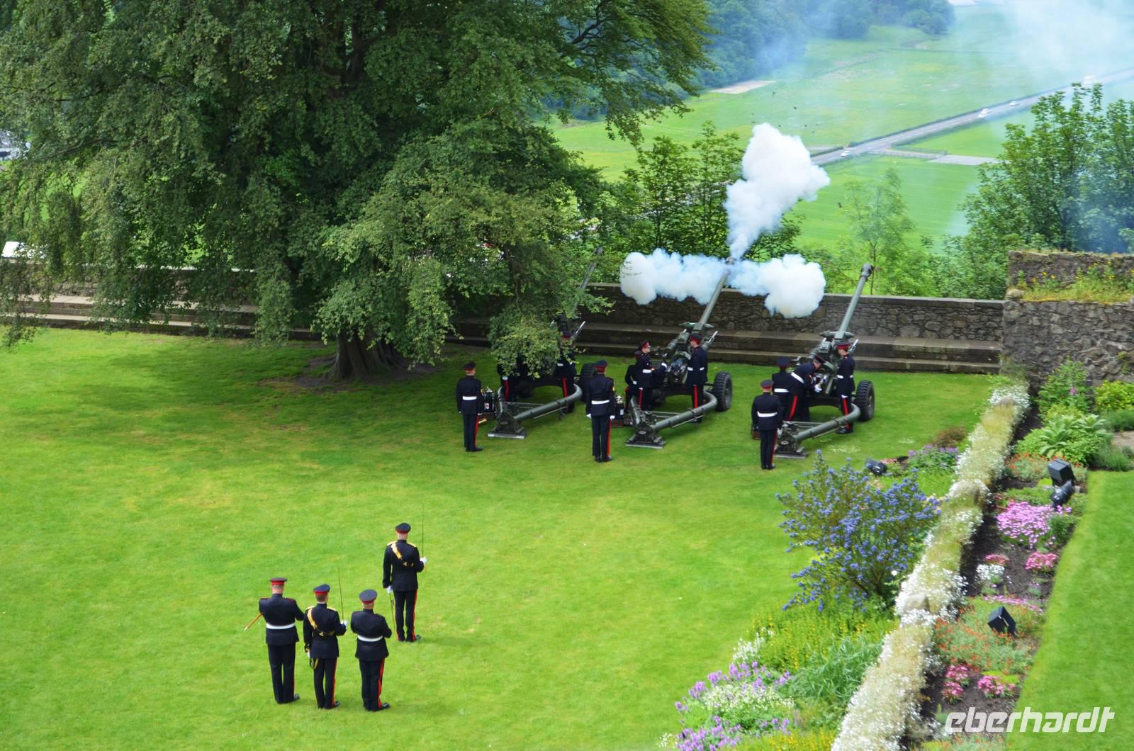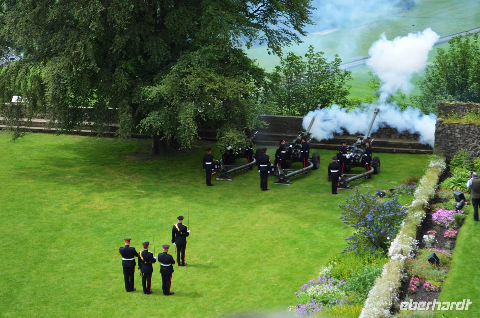 Den Abschluss unseres Besuchs auf der Burg bildet ein Ehrensalut von 21 Schuss aus drei Kanonen der Army anlässlich des Tronjubileums der Queen.