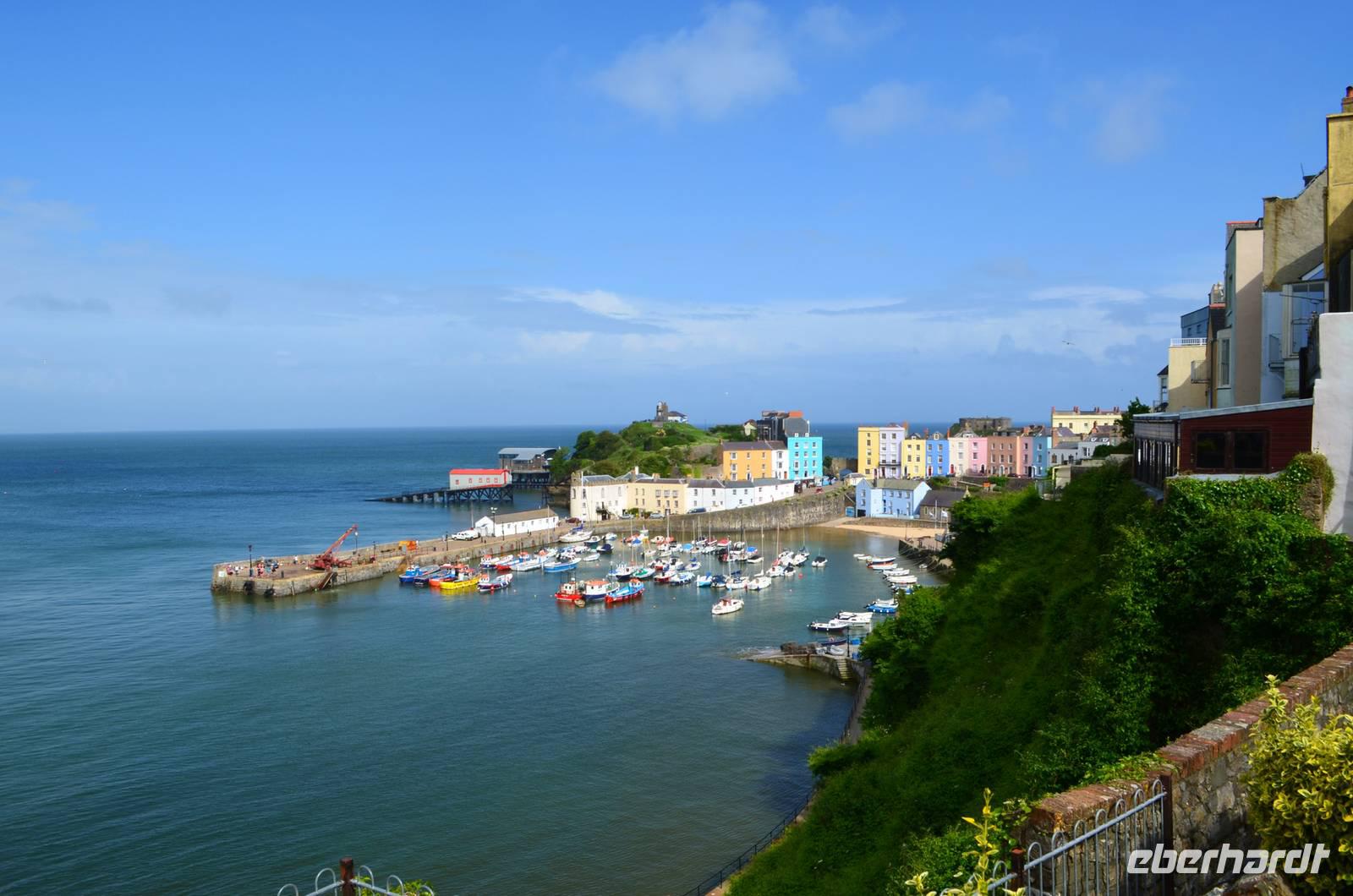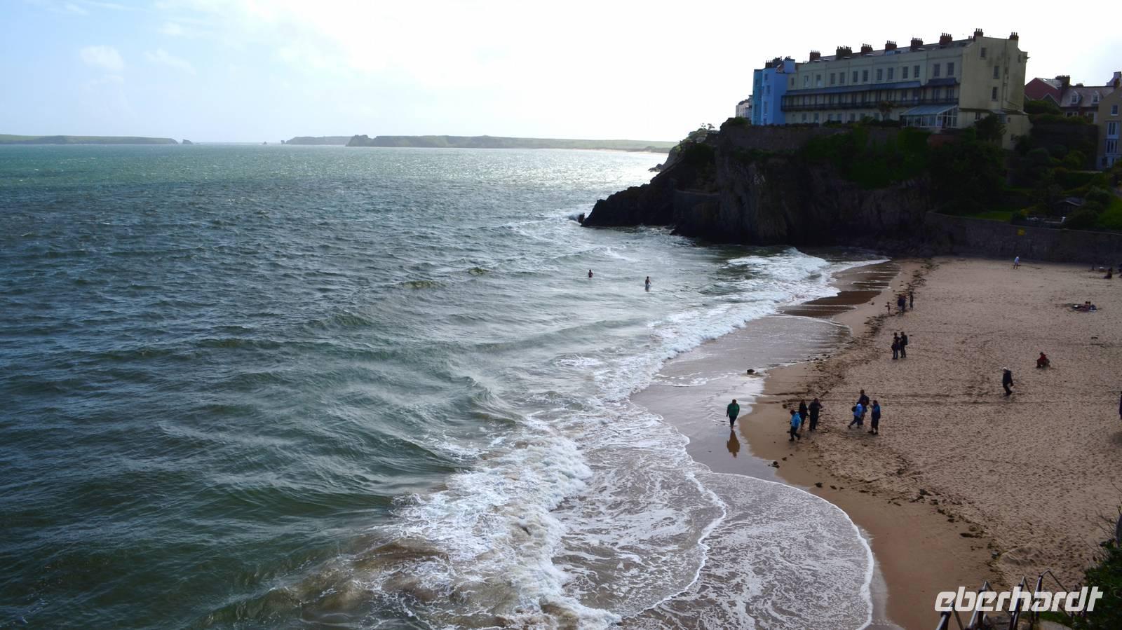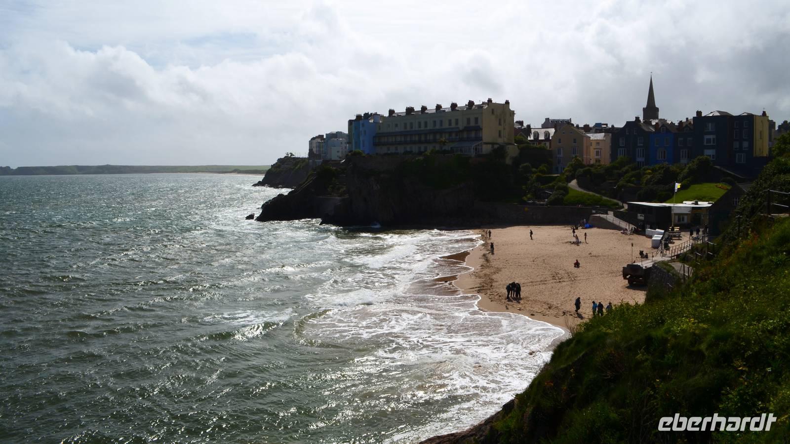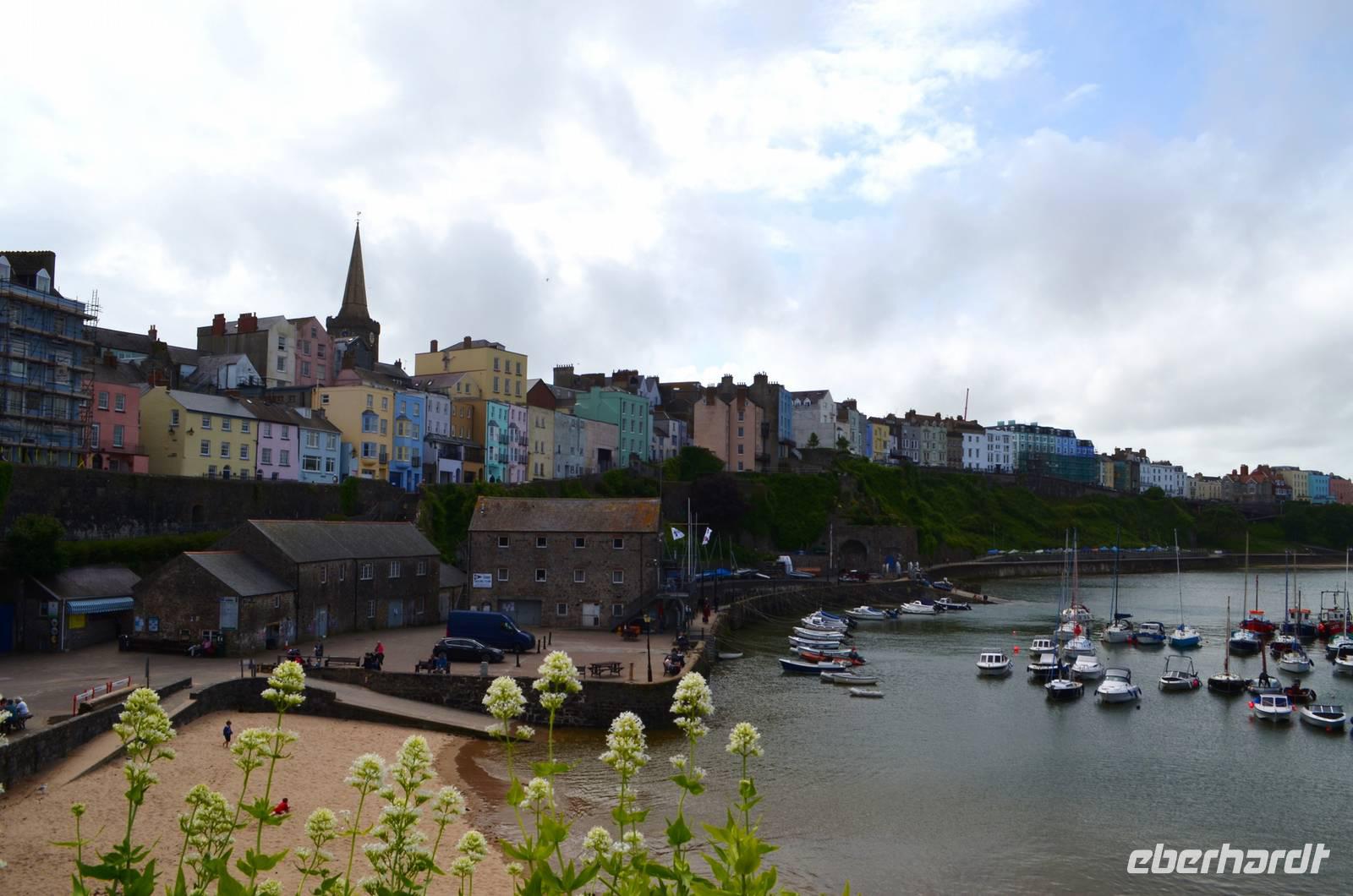 Nun lockt es uns aber auch noch an die romantische Küste und so fahren wir nach Tenby, an die walisische Riviera weiter. Tenby, ein hübscher Badeort mit alter Stadtmauer, hübschen belebten Gassen, einer alten Festung auf einem Felsvorsprung, herrlichen Stränden und felsiger Steilküste gefällt uns mit seinen bunten Häusern und lebendigen Gassen sofort. Die Flut lässt kaum Platz für einen Strandspaziergang.