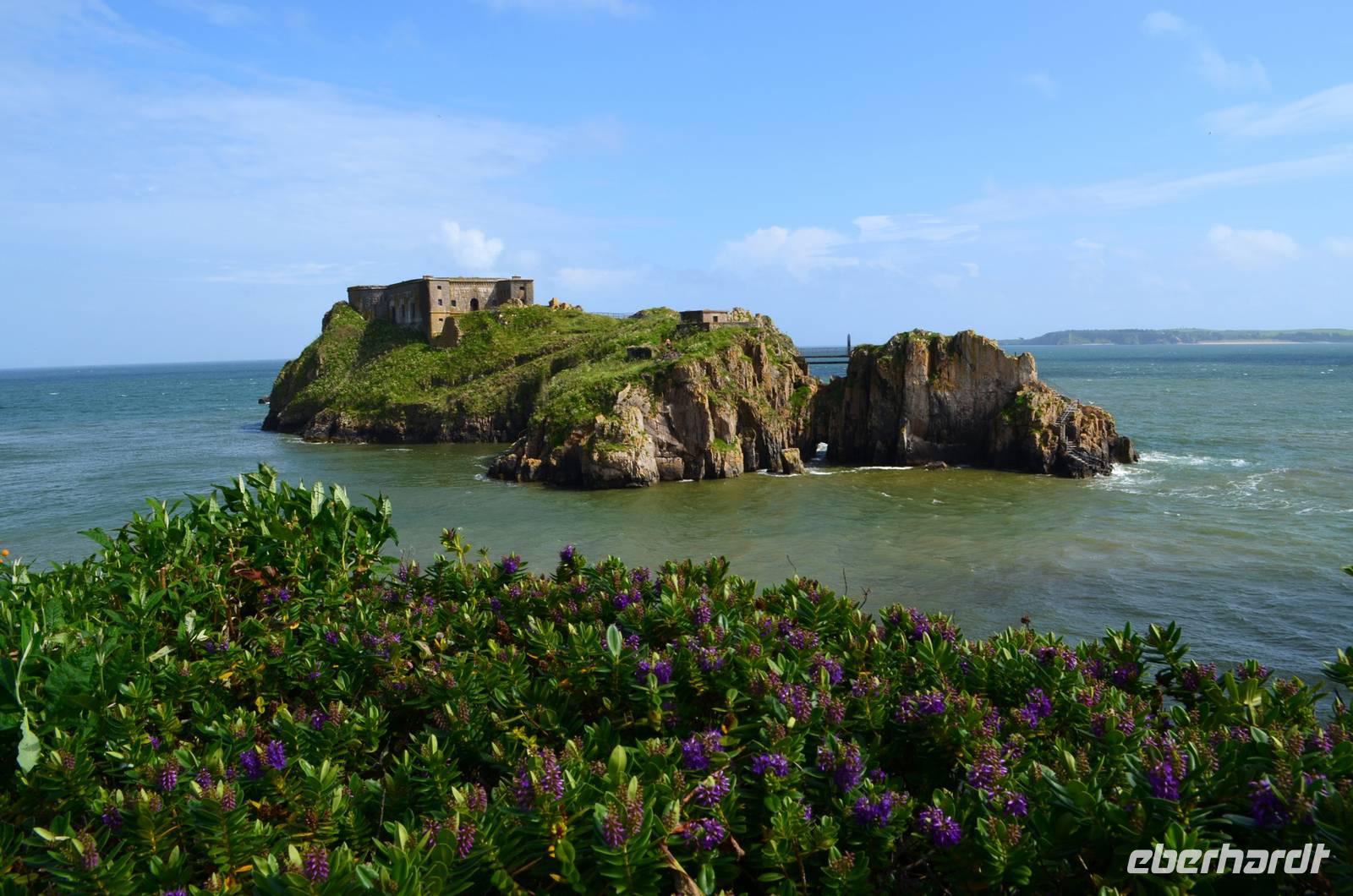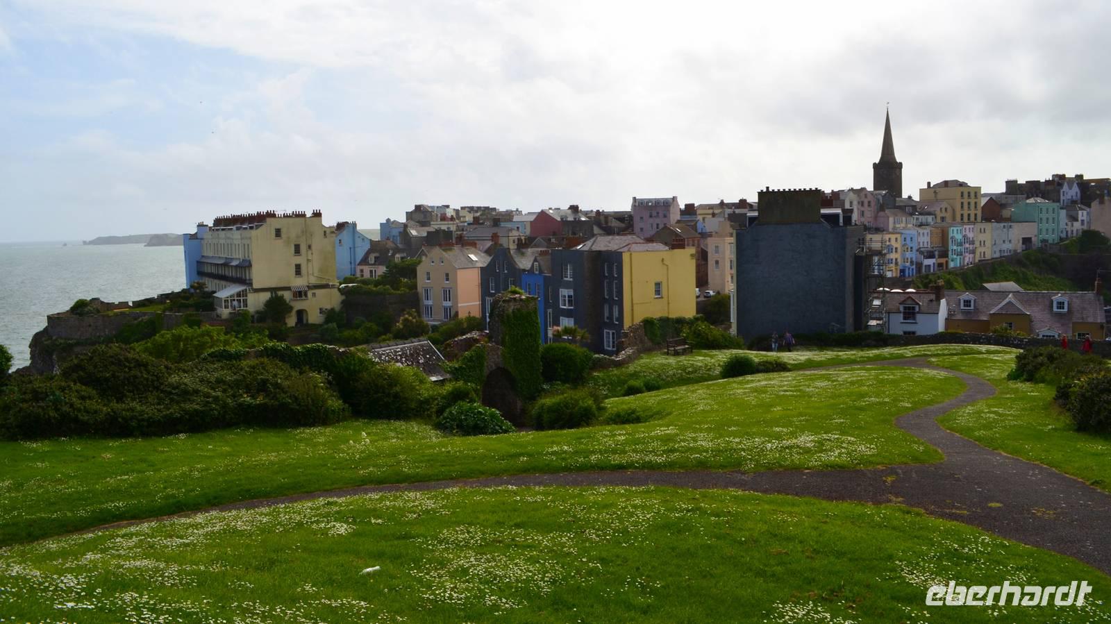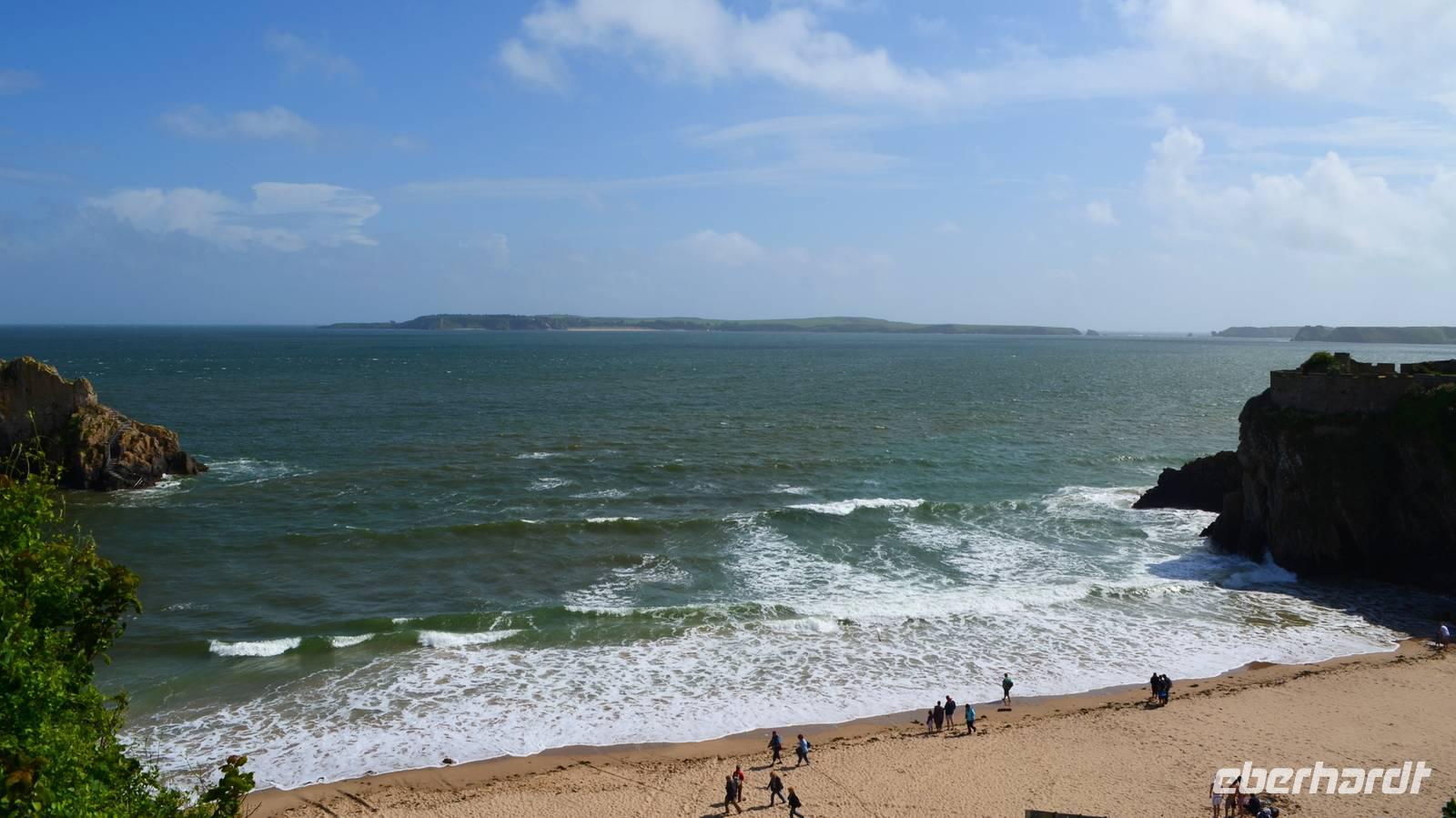 Nun lockt es uns aber auch noch an die romantische Küste und so fahren wir nach Tenby, an die walisische Riviera weiter. Tenby, ein hübscher Badeort mit alter Stadtmauer, hübschen belebten Gassen, einer alten Festung auf einem Felsvorsprung, herrlichen Stränden und felsiger Steilküste gefällt uns mit seinen bunten Häusern und lebendigen Gassen sofort. Die Flut lässt kaum Platz für einen Strandspaziergang.