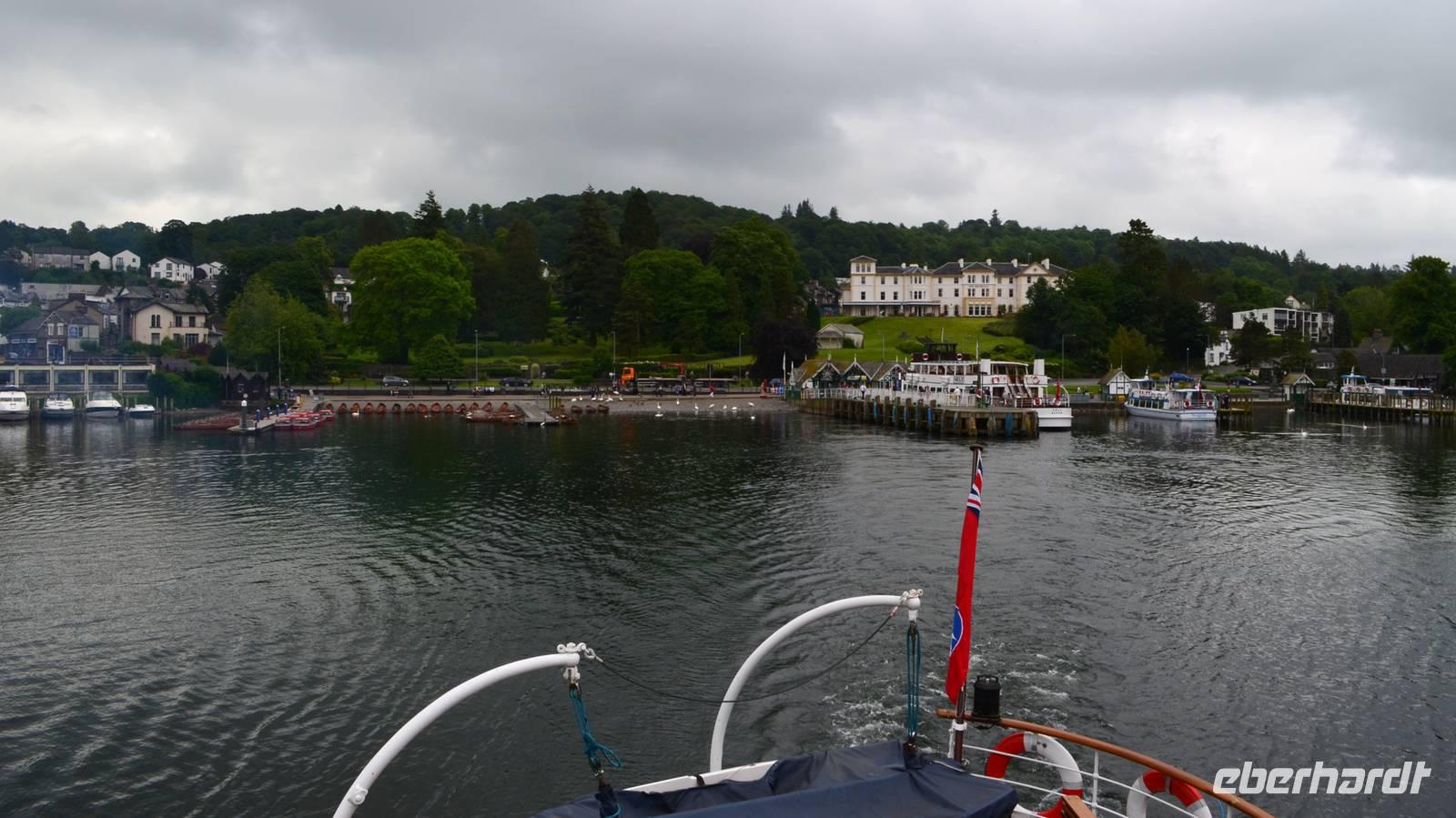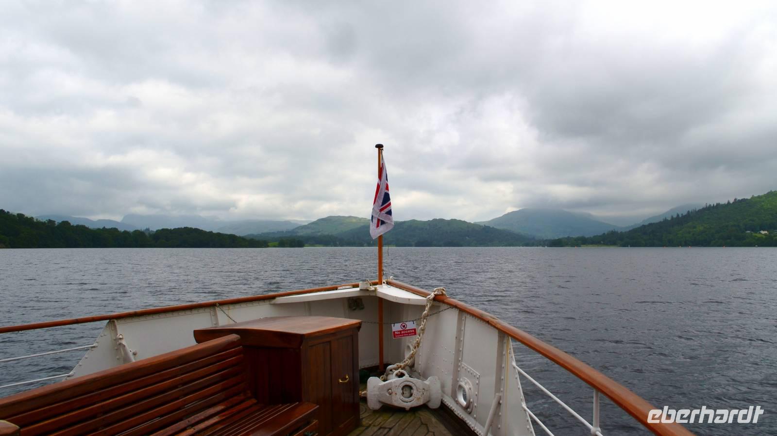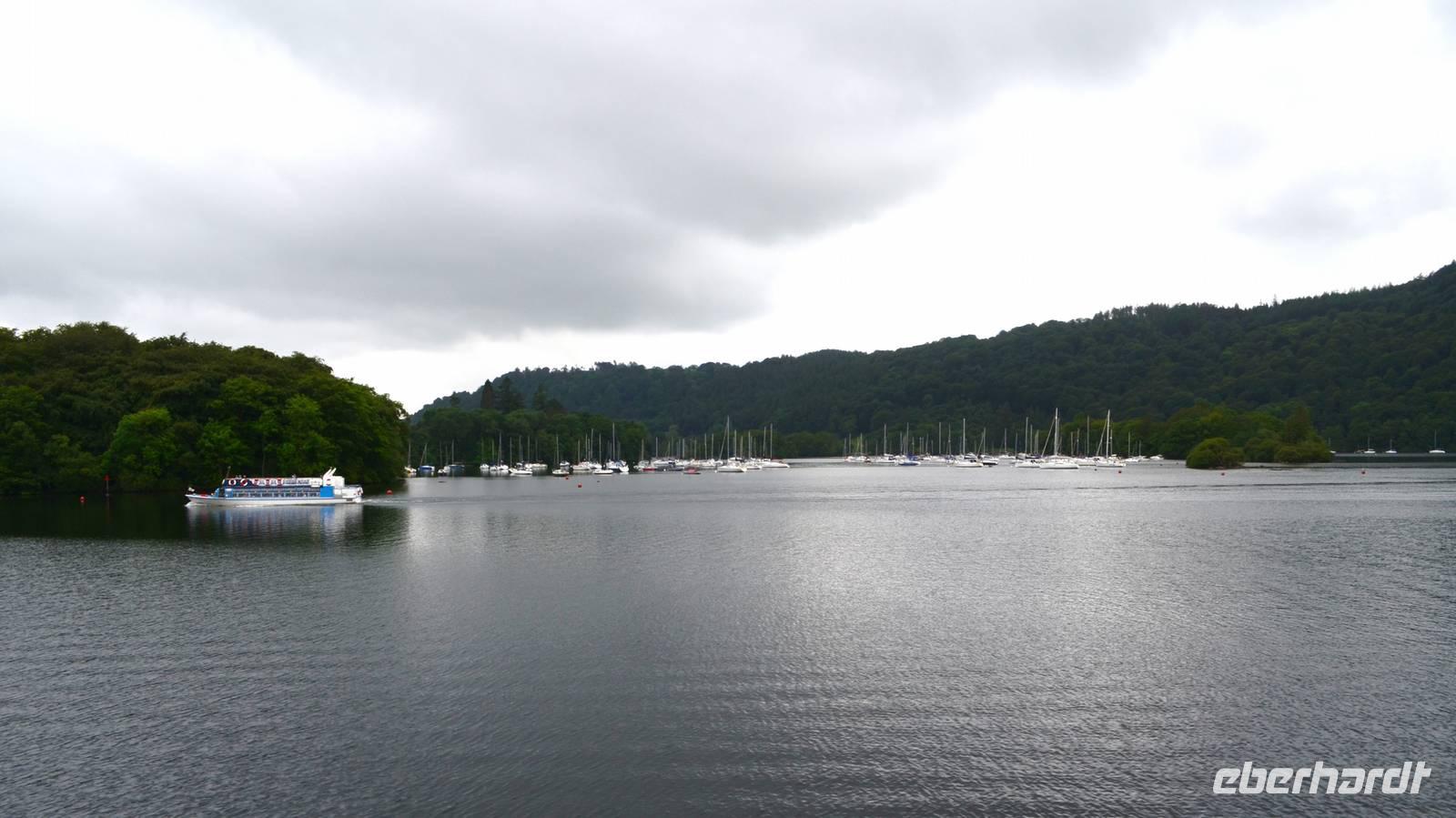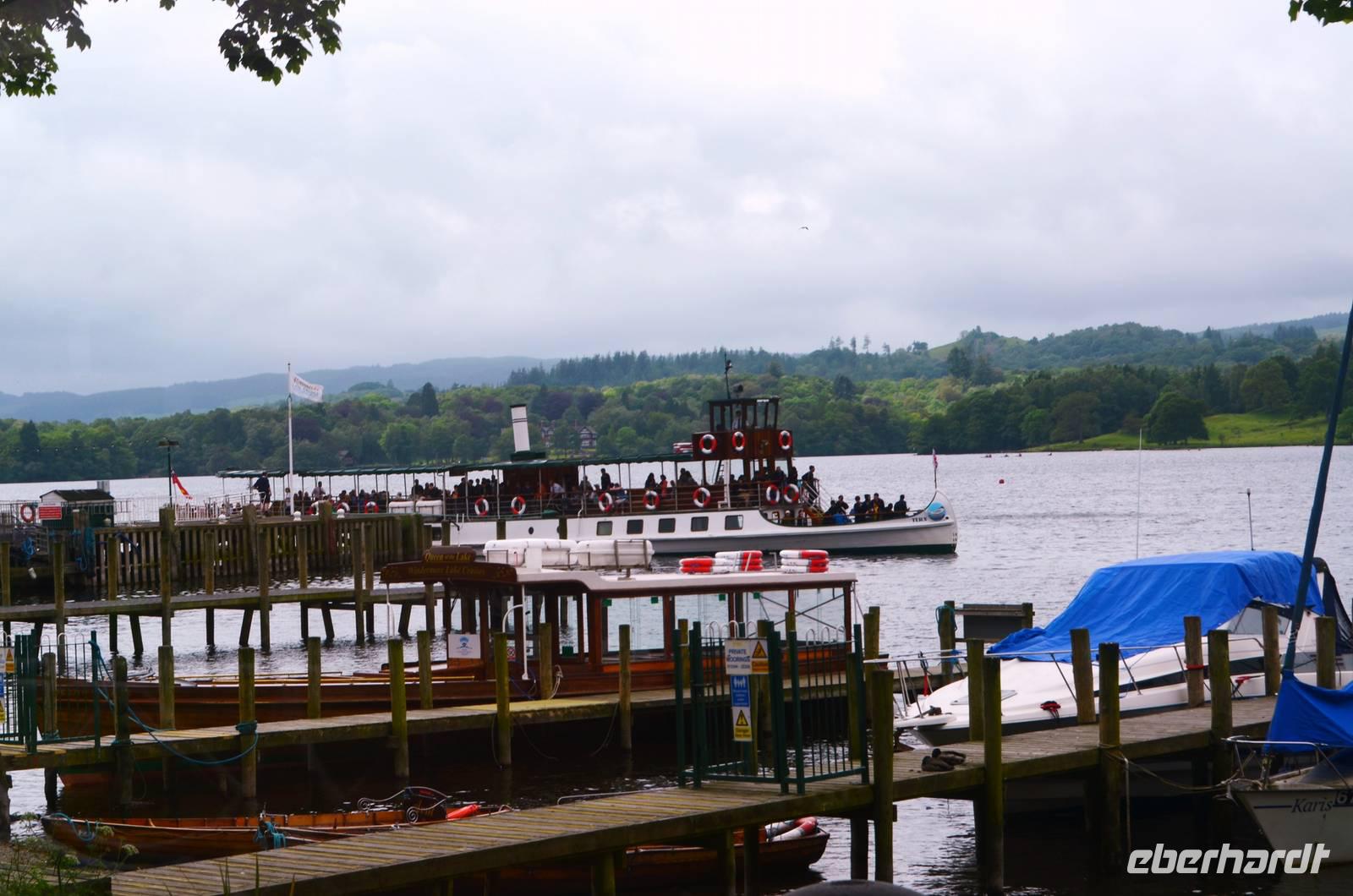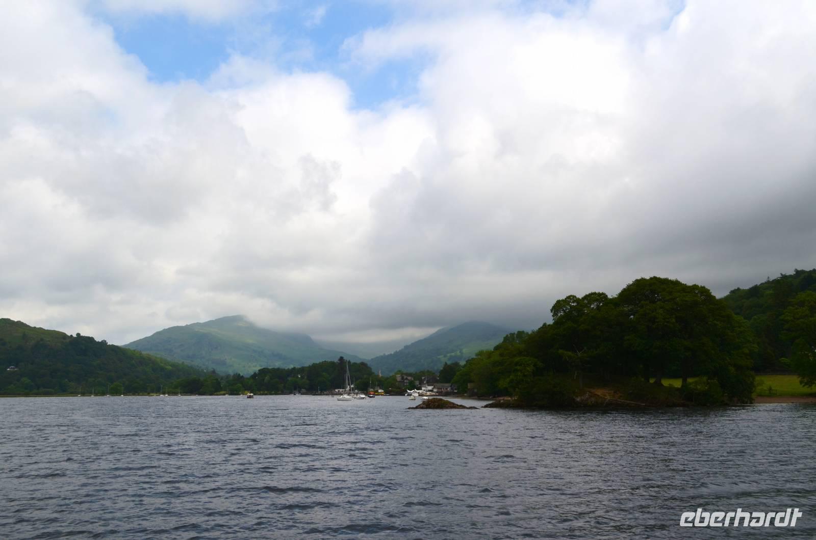 Weiter nach Norden, zum Lake District setzen wir unsere Rundreise fort. In Bowness on Windermere halten wir am Schiffsanleger der Lake Cruises und steigen auf unser Ausflugsschiff, mit dem wir gemächlich über den Lake Windermere schippern - von Bowness bis Ambleside. Hier scheint dann auch wieder die Sonne und auch der höchste Berg Englands, der Scafell Pike (978 m) lugt etwas aus den Wolken.