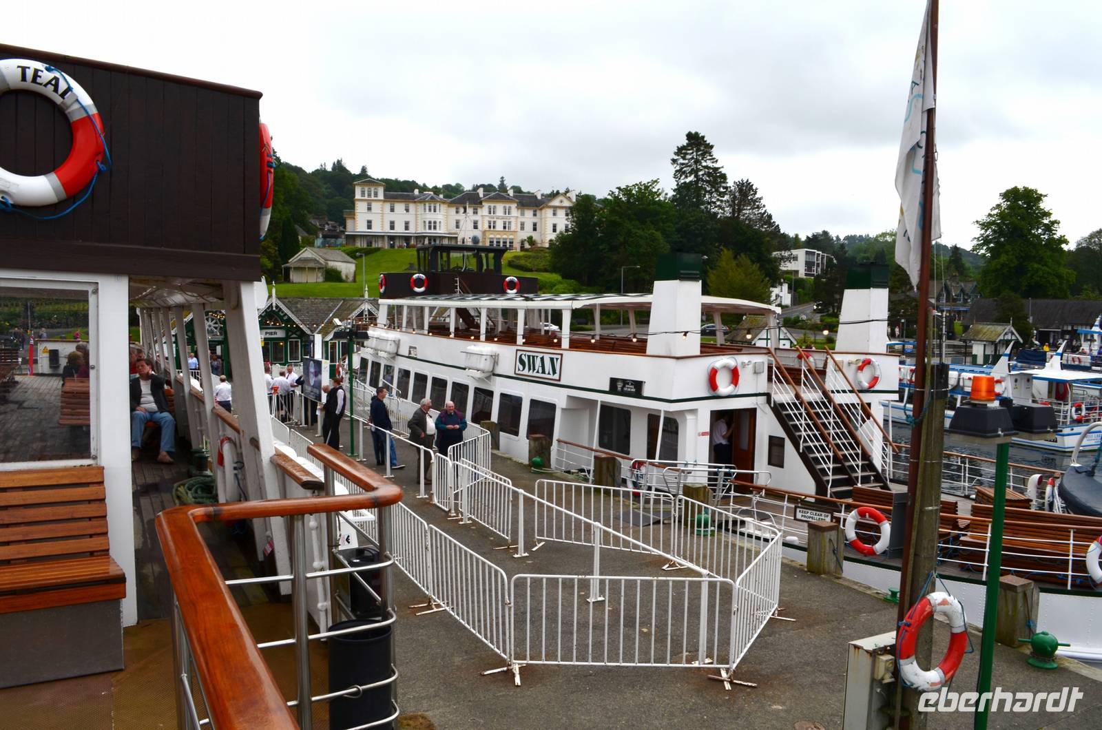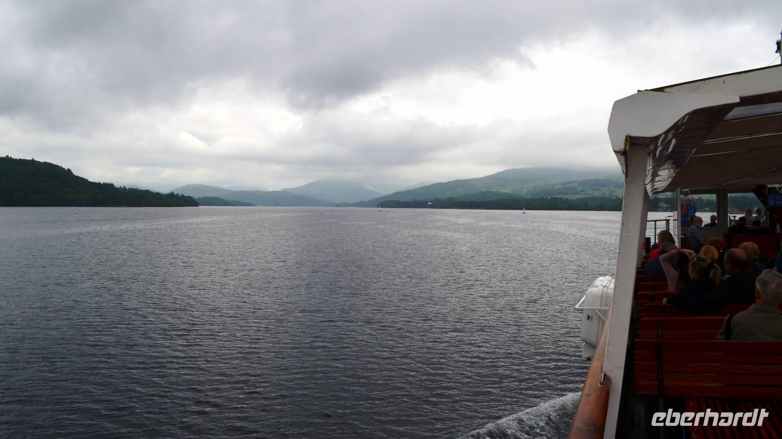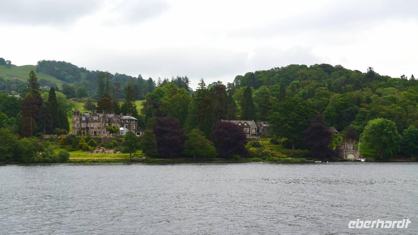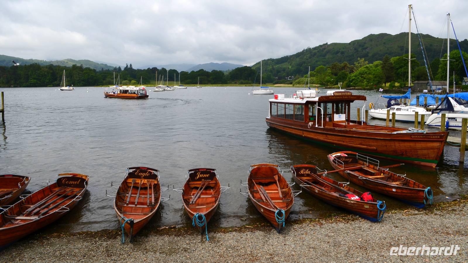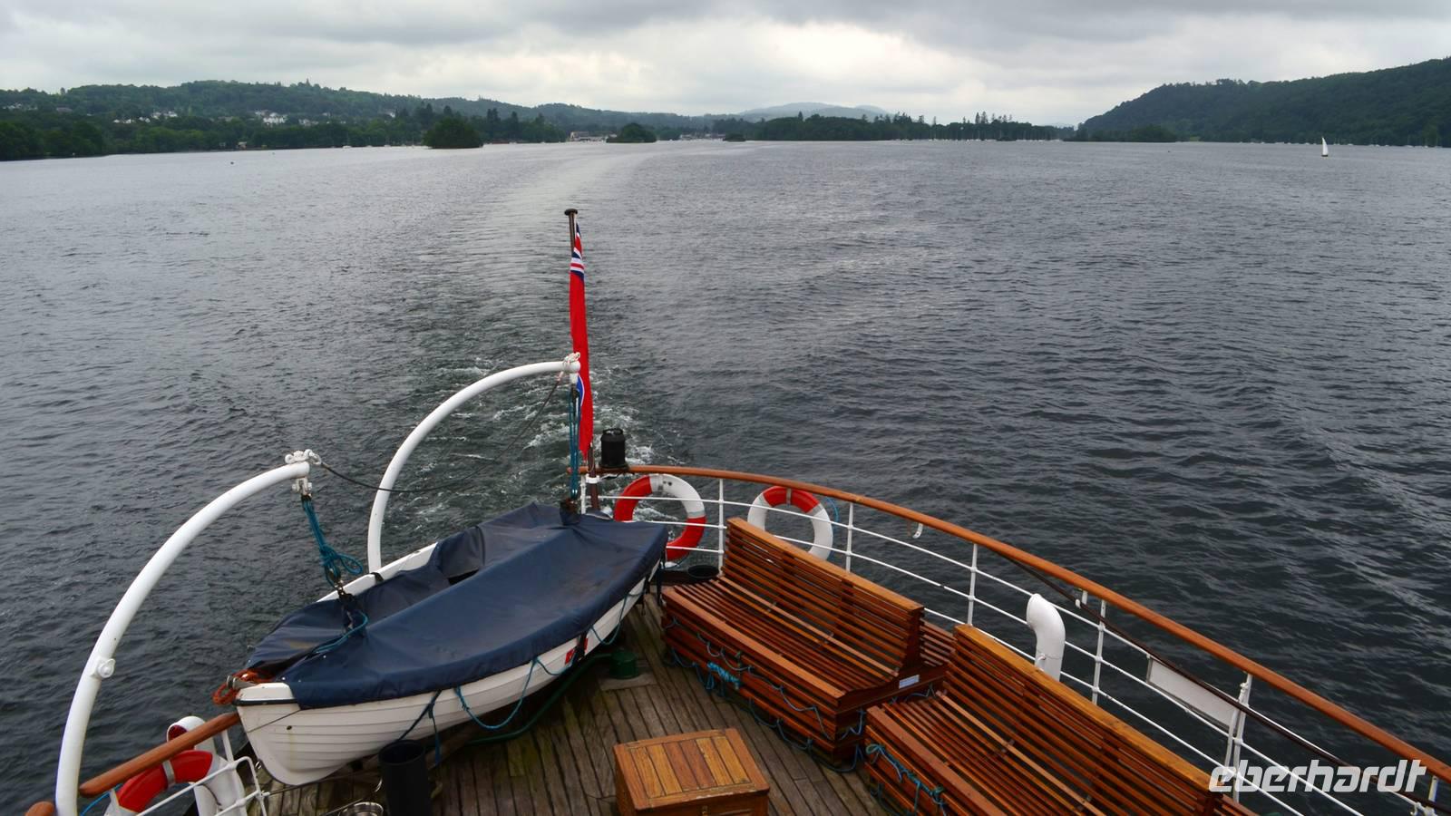 Weiter nach Norden, zum Lake District setzen wir unsere Rundreise fort. In Bowness on Windermere halten wir am Schiffsanleger der Lake Cruises und steigen auf unser Ausflugsschiff, mit dem wir gemächlich über den Lake Windermere schippern - von Bowness bis Ambleside. Hier scheint dann auch wieder die Sonne und auch der höchste Berg Englands, der Scafell Pike (978 m) lugt etwas aus den Wolken.