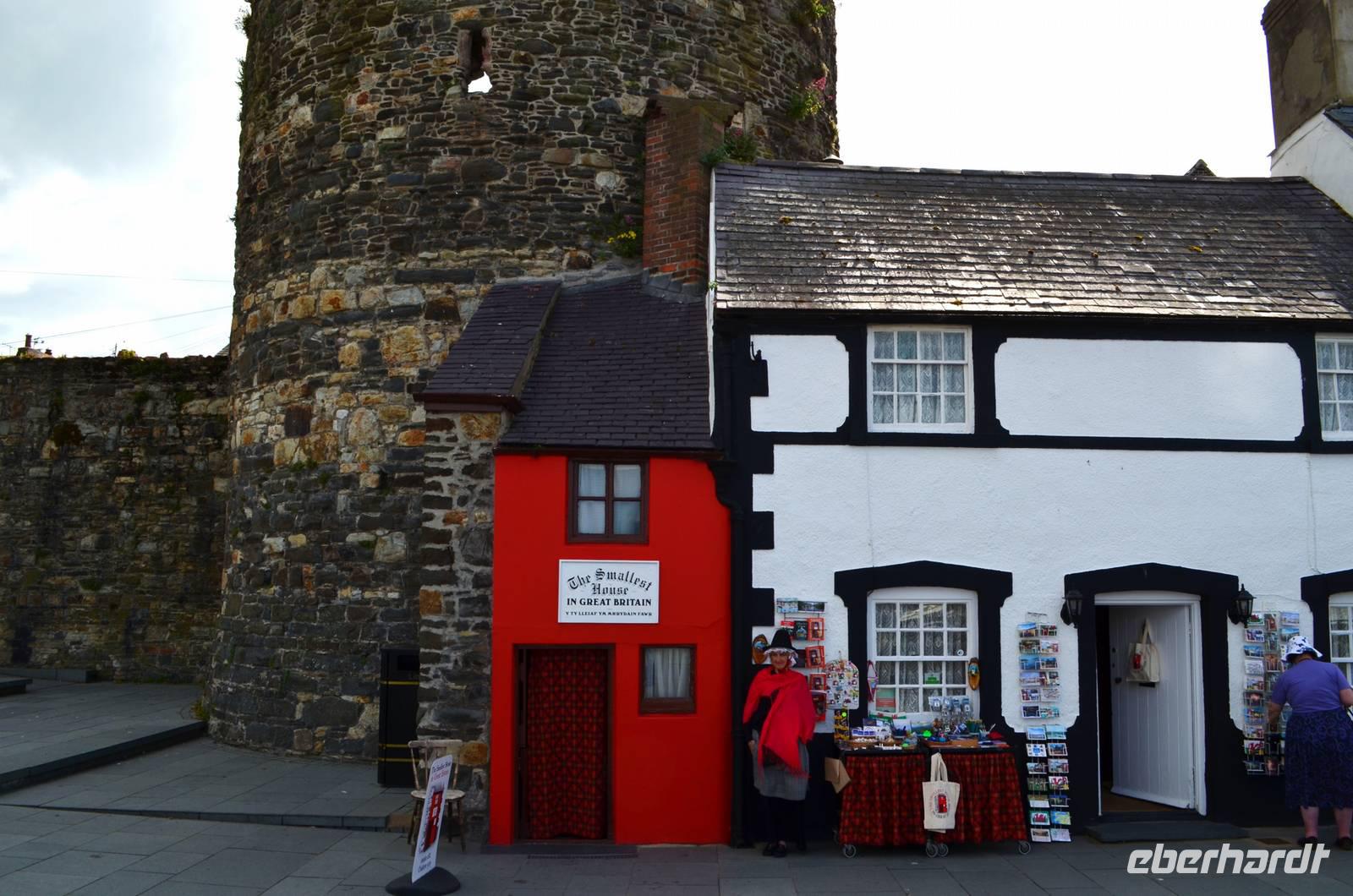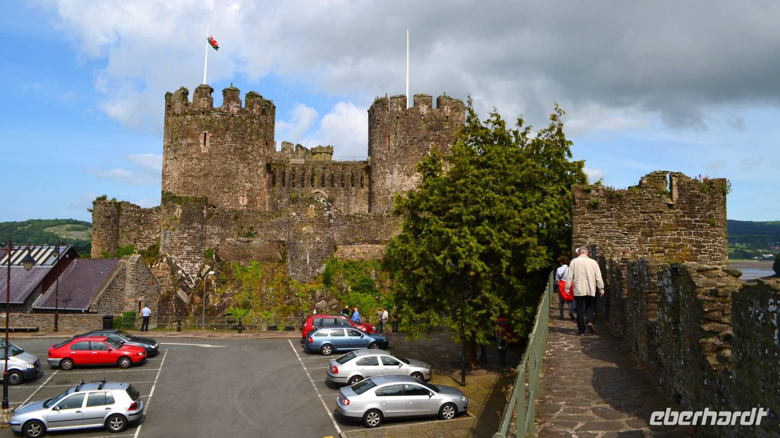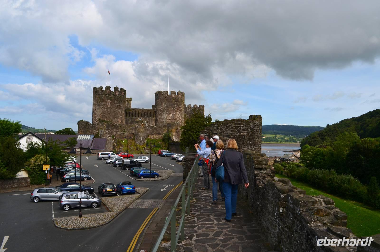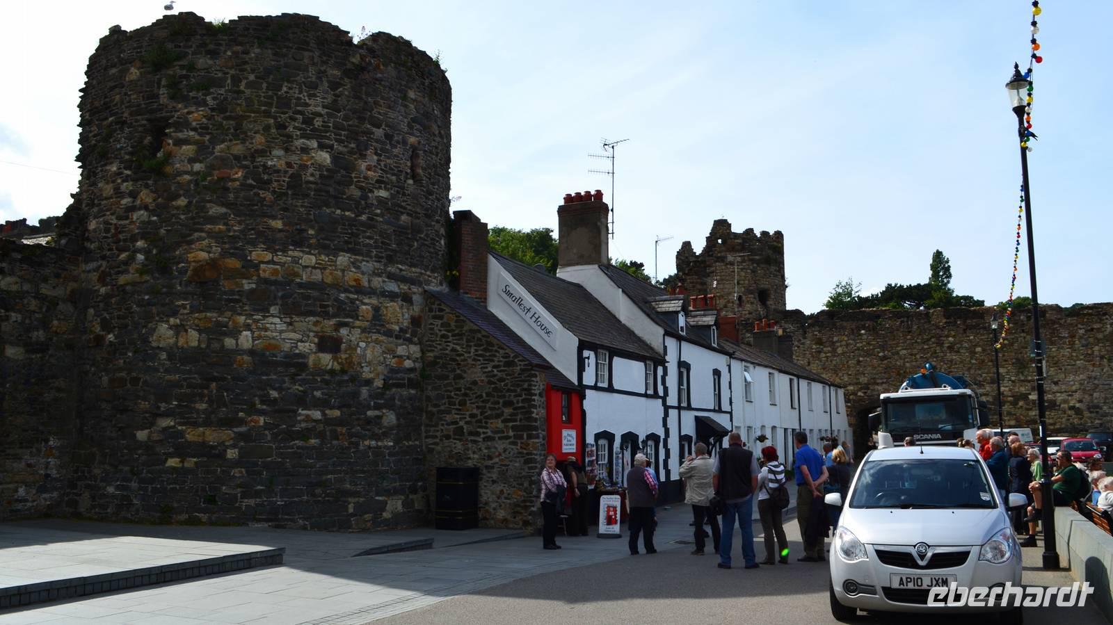 Den Parkplatz unterhalb der Burg erreichen wir durch Abbiegen nach links hinter der Telford-Brücke und Fahrt durch das enge Steintor. Wir spazieren zur Stadtmauer, zur Burg, zum ältesten: dem Aberconwy House, zum Hafen und zum kleinsten Haus Großbritanniens.