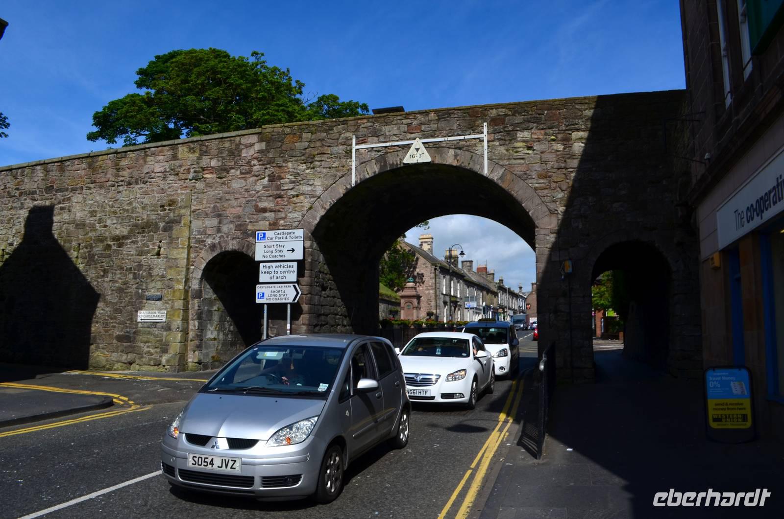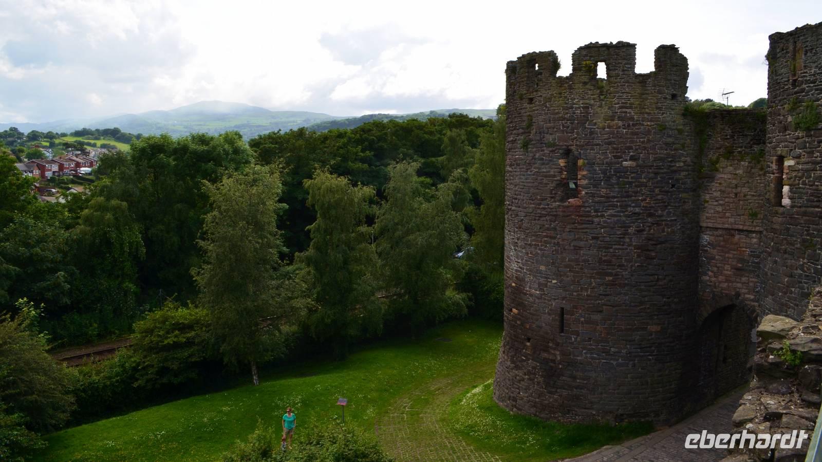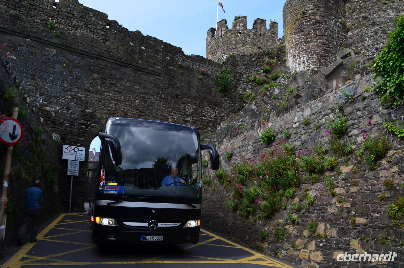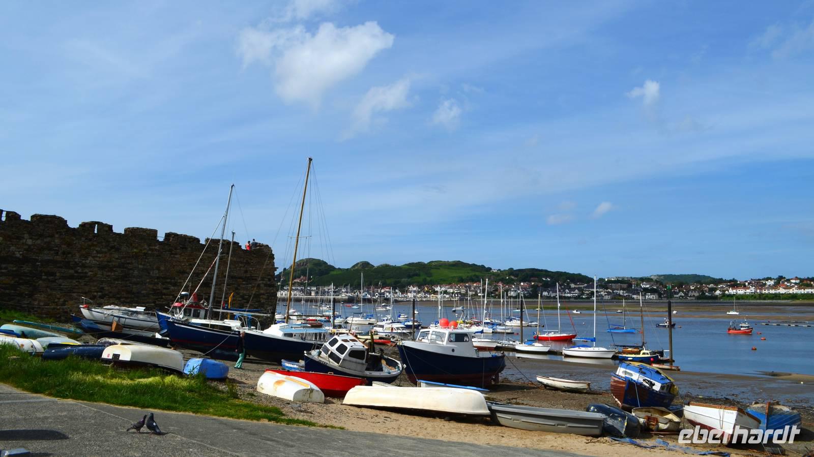 Den Parkplatz unterhalb der Burg erreichen wir durch Abbiegen nach links hinter der Telford-Brücke und Fahrt durch das enge Steintor. Wir spazieren zur Stadtmauer, zur Burg, zum ältesten: dem Aberconwy House, zum Hafen und zum kleinsten Haus Großbritanniens.