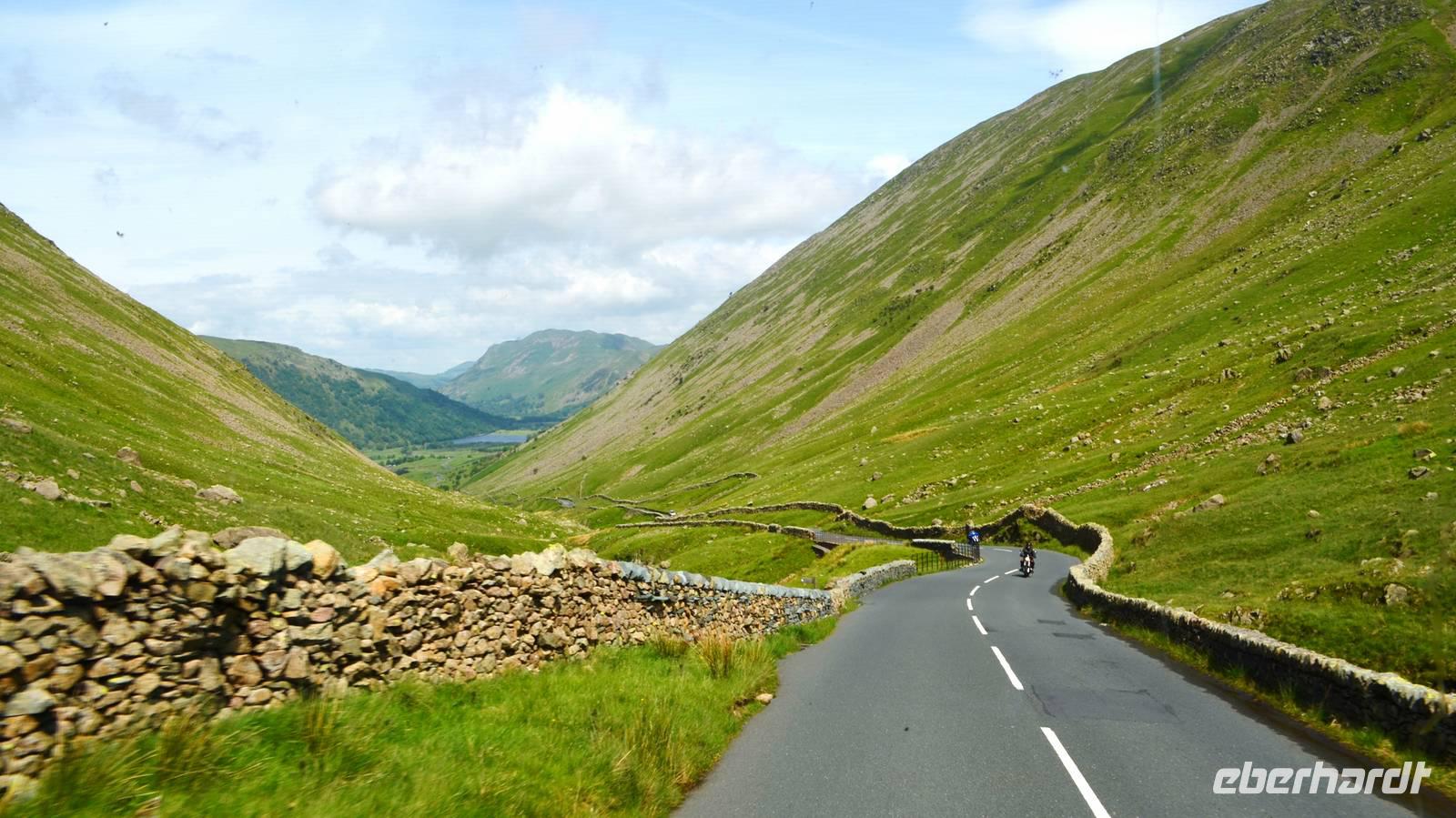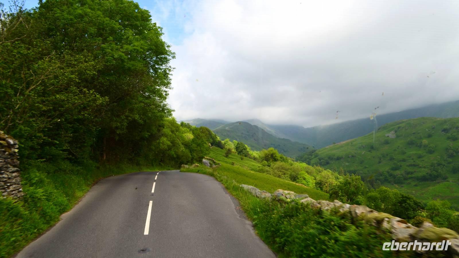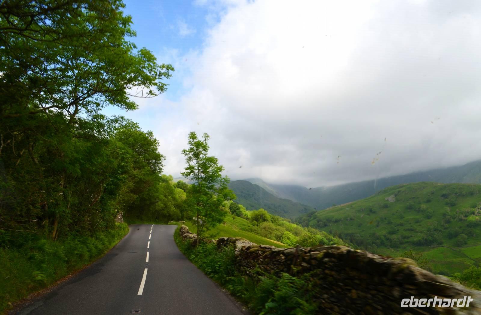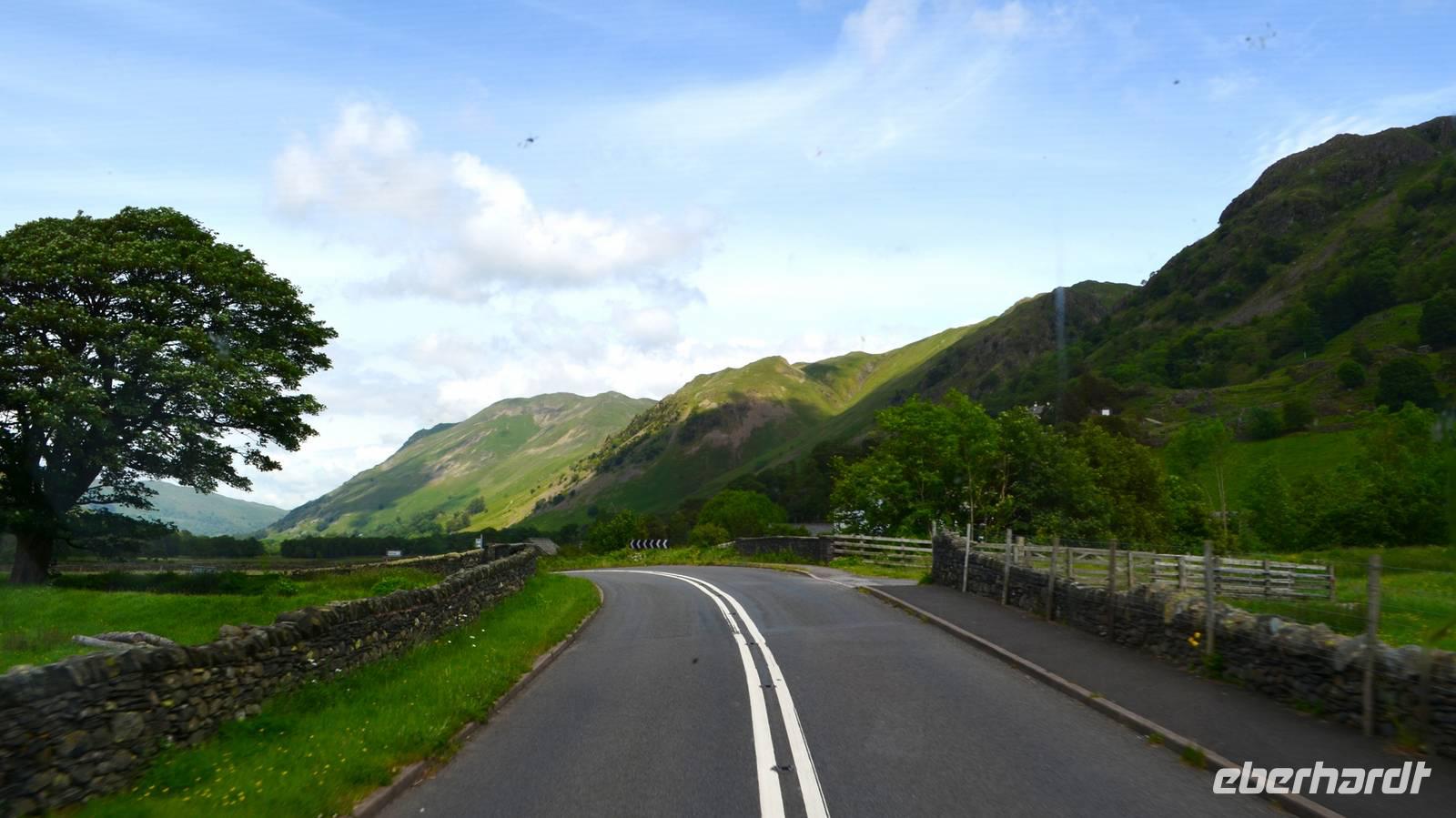 Vom Ufer diese hübschen Ortes geht die Weiterfahrt hinauf in die Berge und zum nördlichen Lake District. Zuerst zurück nach Windermere, dann links hinauf zum Kirkstone Pass, wo wir die Aussicht genießen und Mittag machen. Von hier geht es wieder hinab zu den Bruderseen und dann entlang am Lake Ullswater Richtung Penrith, schließlich nach Schottland - nach Gretna Green.