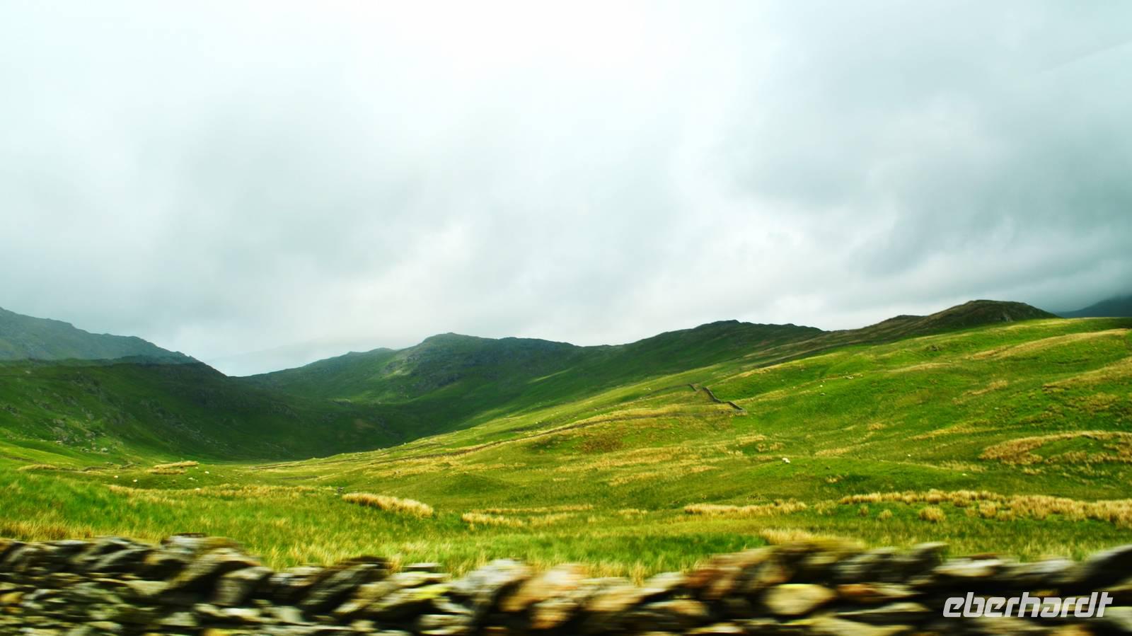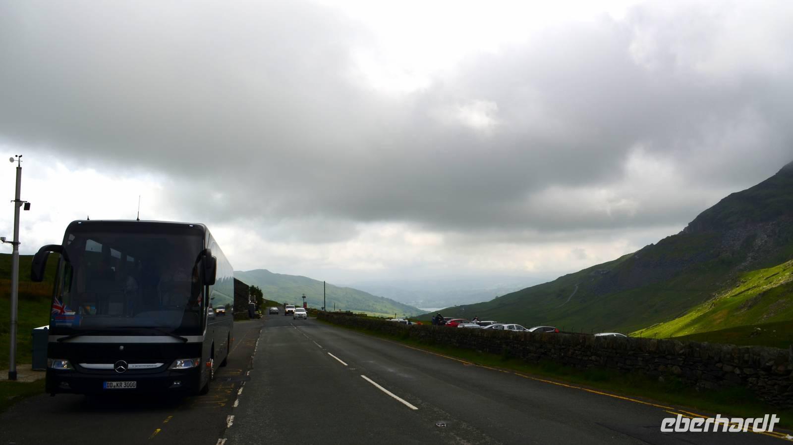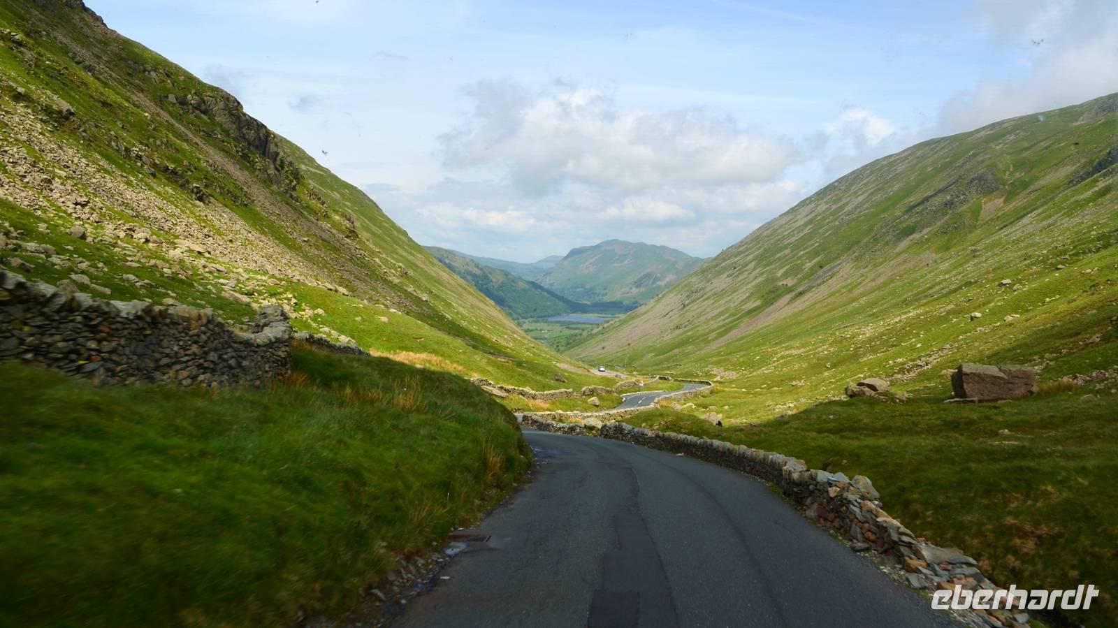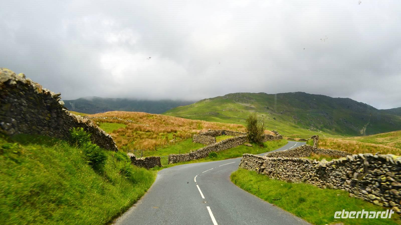 Vom Ufer diese hübschen Ortes geht die Weiterfahrt hinauf in die Berge und zum nördlichen Lake District. Zuerst zurück nach Windermere, dann links hinauf zum Kirkstone Pass, wo wir die Aussicht genießen und Mittag machen. Von hier geht es wieder hinab zu den Bruderseen und dann entlang am Lake Ullswater Richtung Penrith, schließlich nach Schottland - nach Gretna Green.