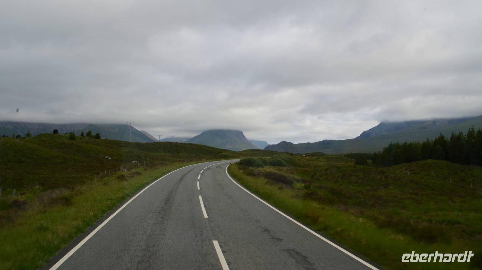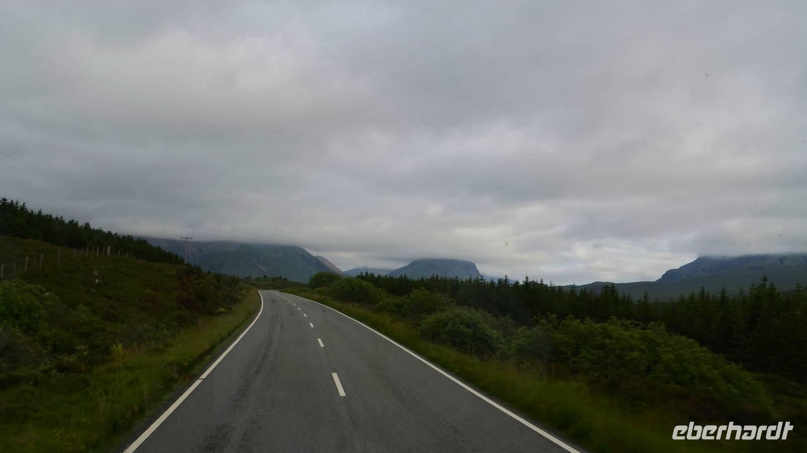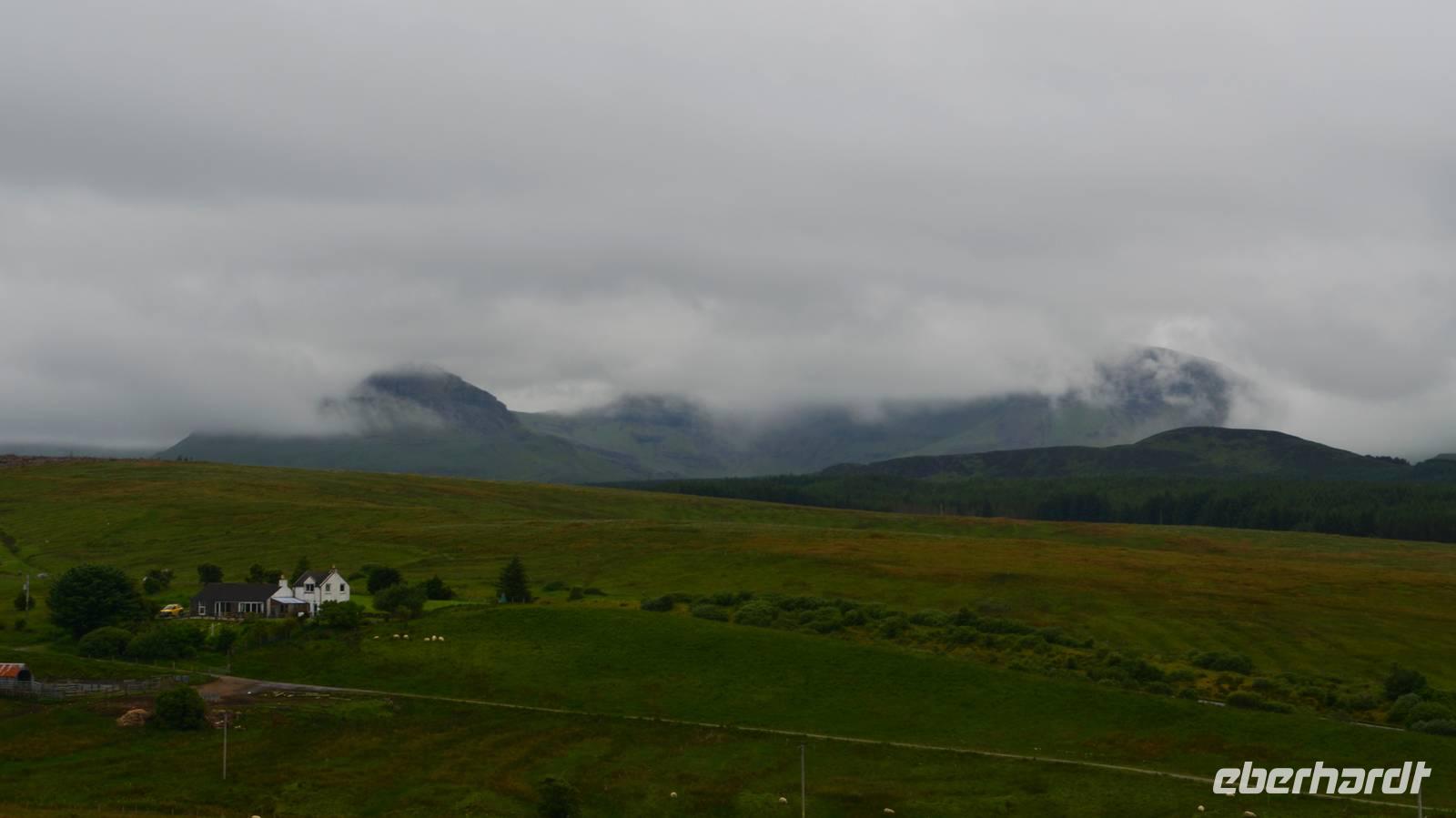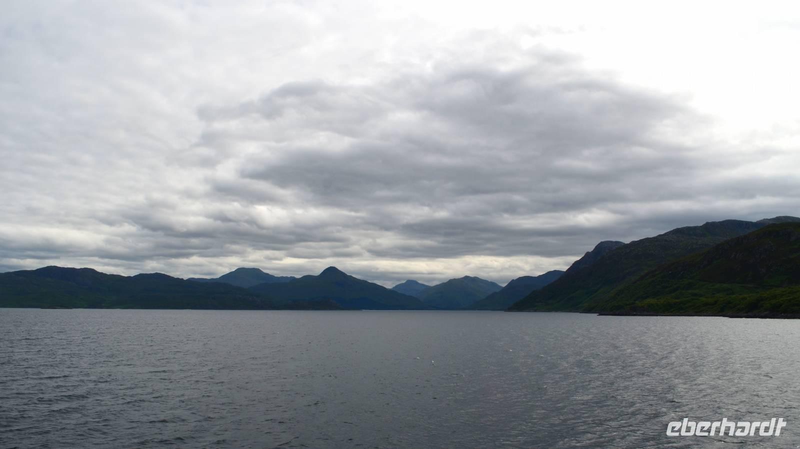 Tief ziehende Wolken tauchen die Landschaft am Loch Alsh in ein mystisches Flair. Auch die Insel Skye macht heute ihrem Namen alle Ehre.