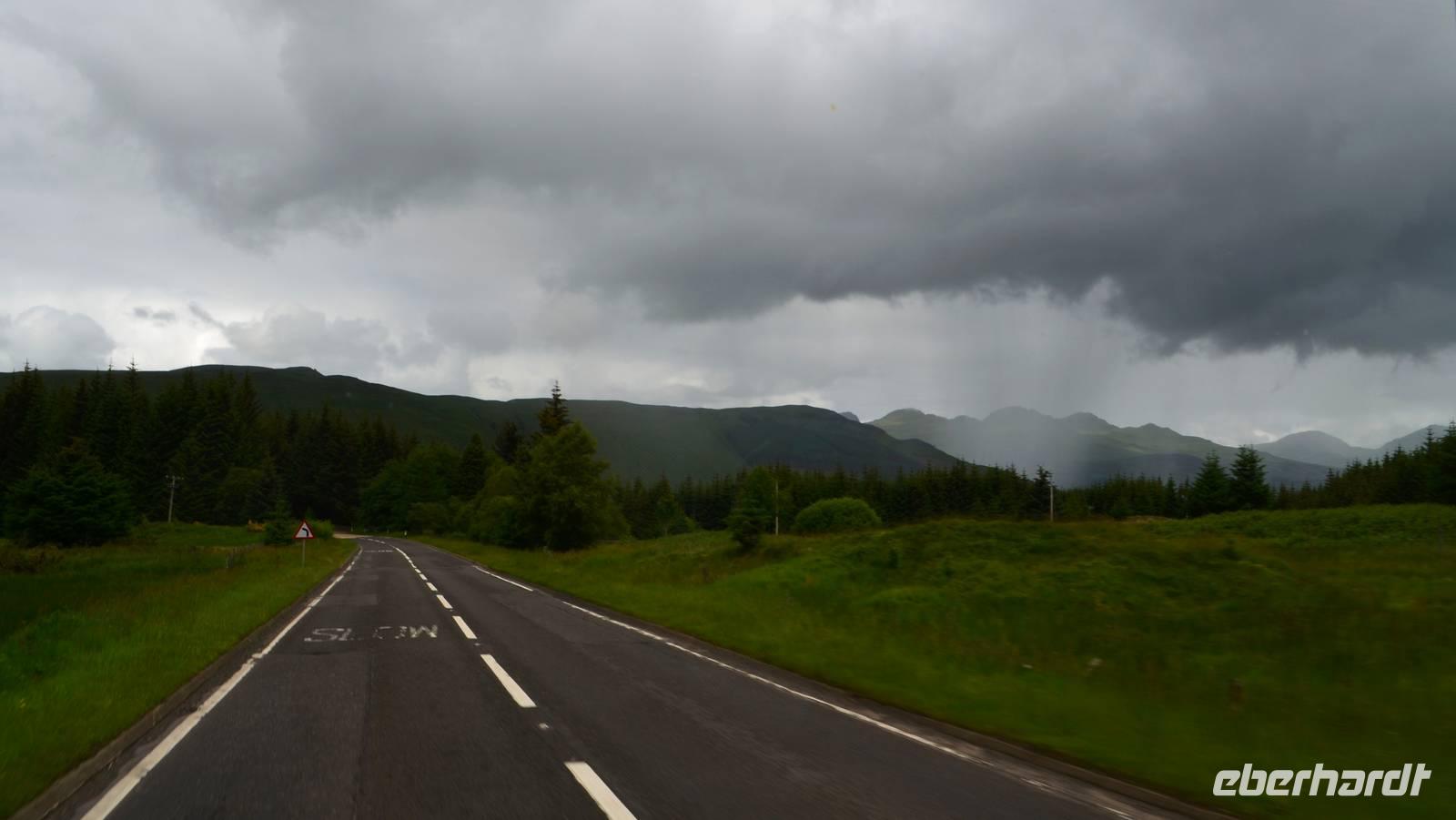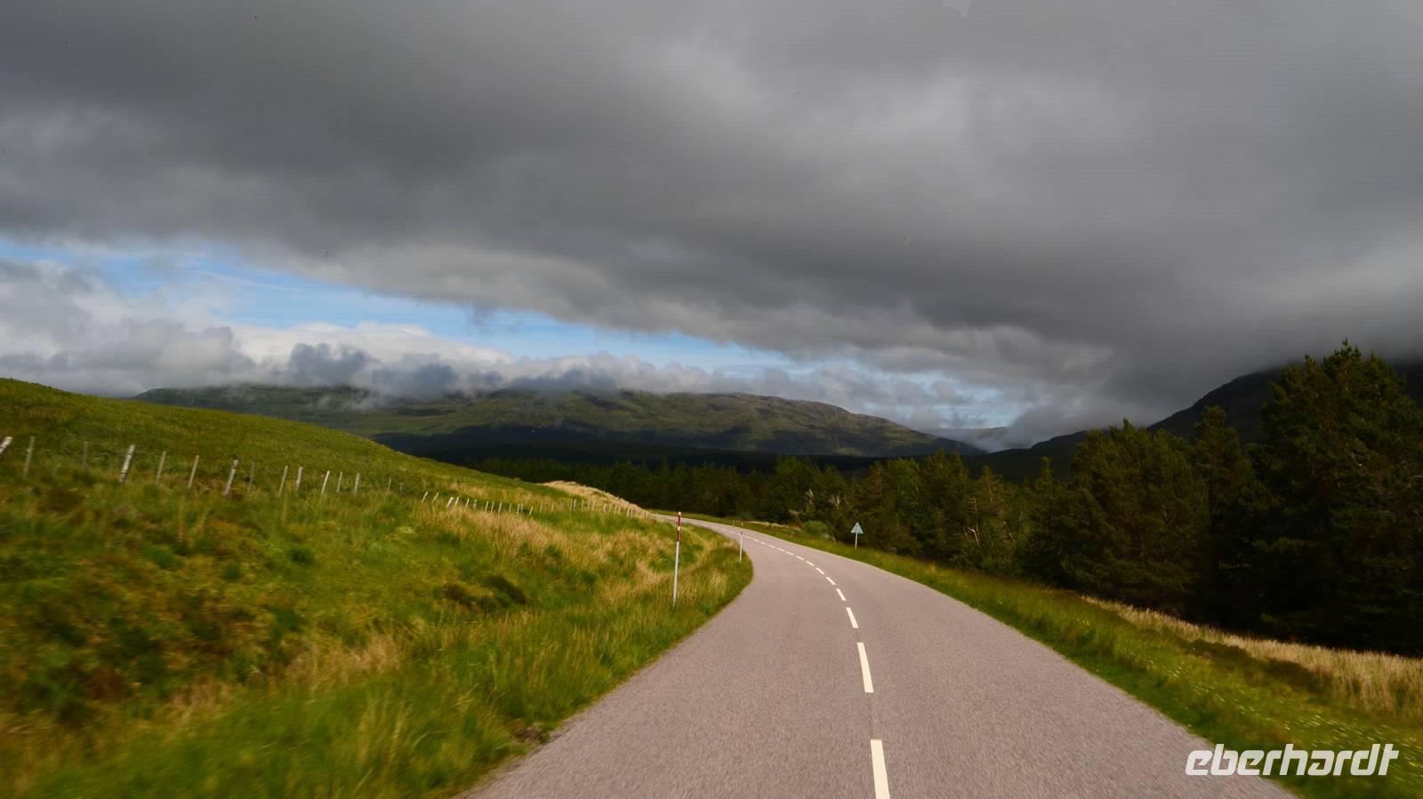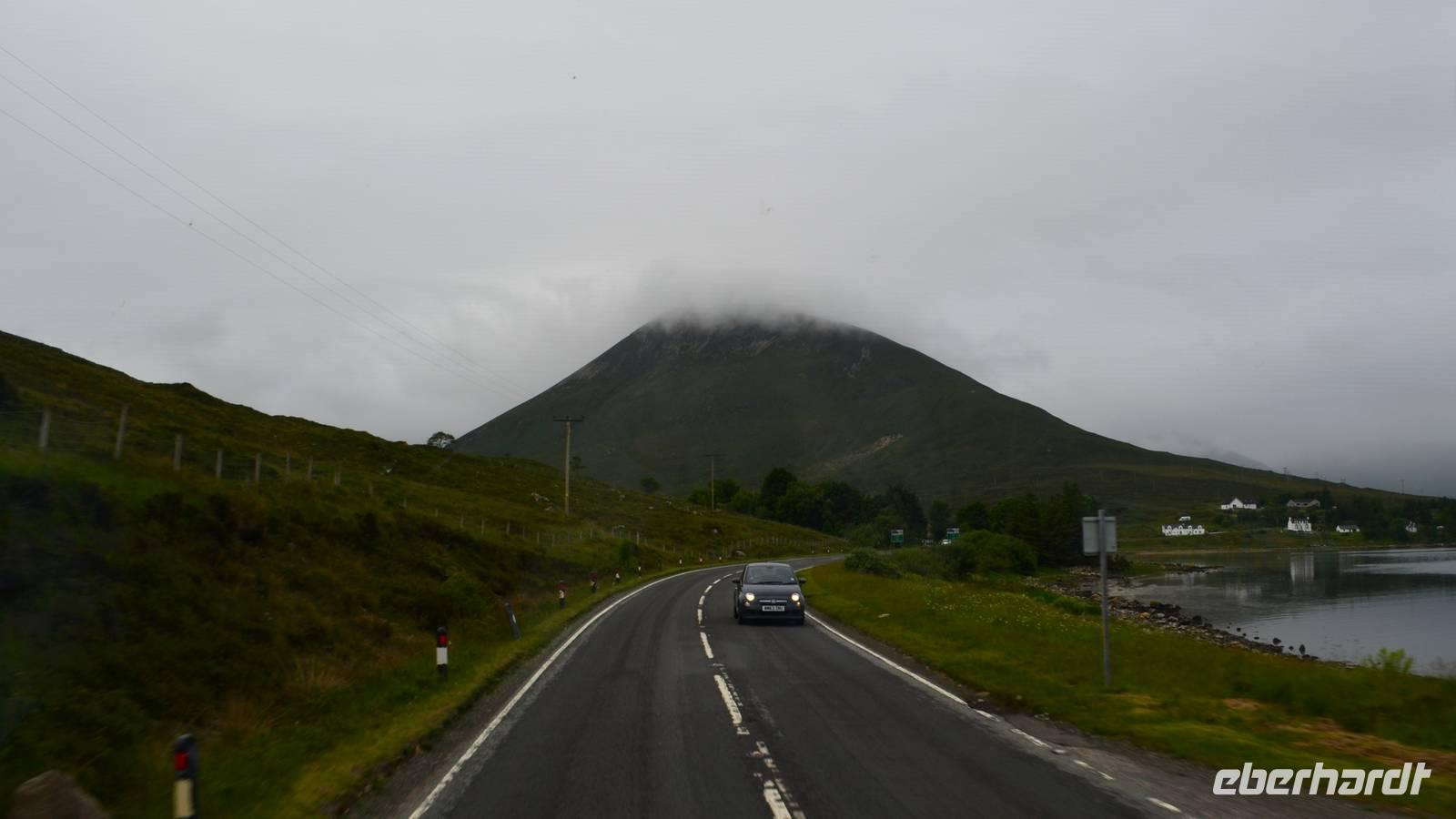 Tief ziehende Wolken tauchen die Landschaft am Loch Alsh in ein mystisches Flair. Auch die Insel Skye macht heute ihrem Namen alle Ehre.