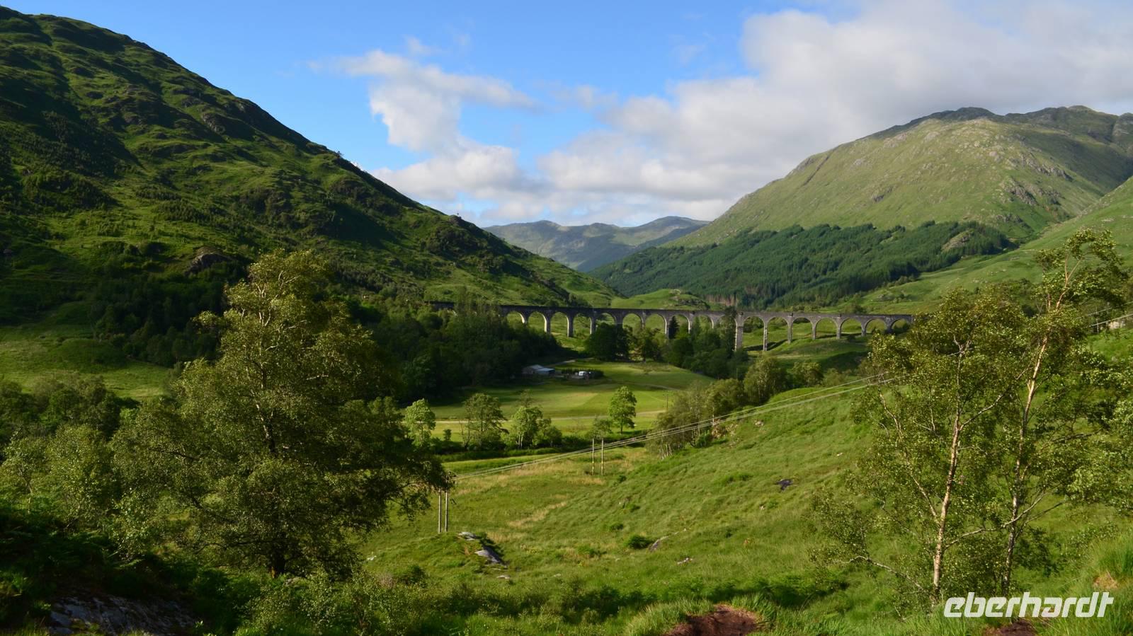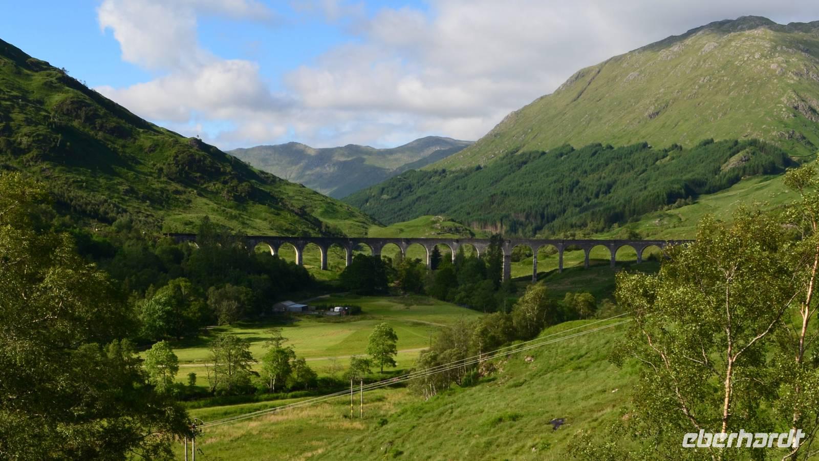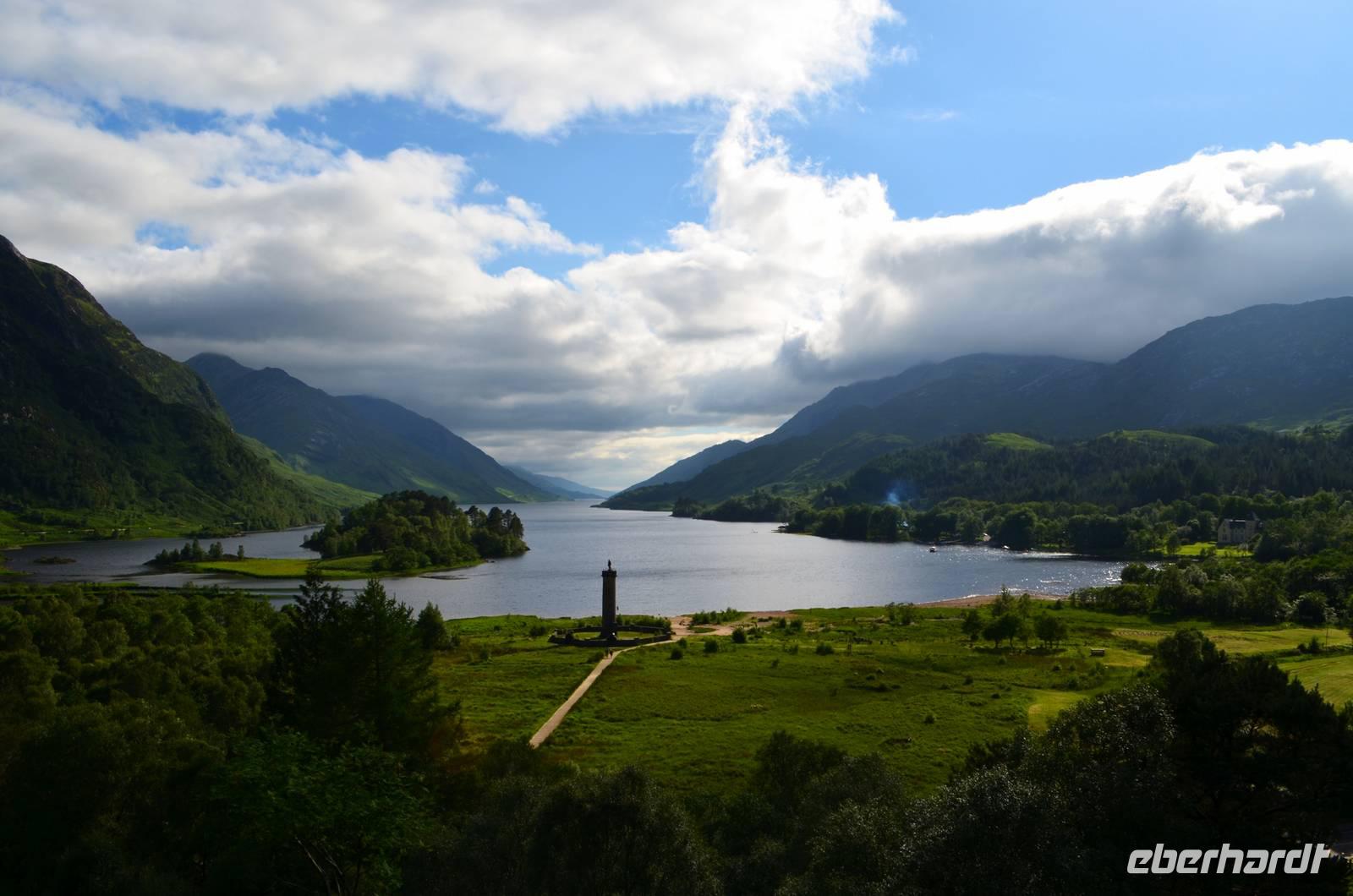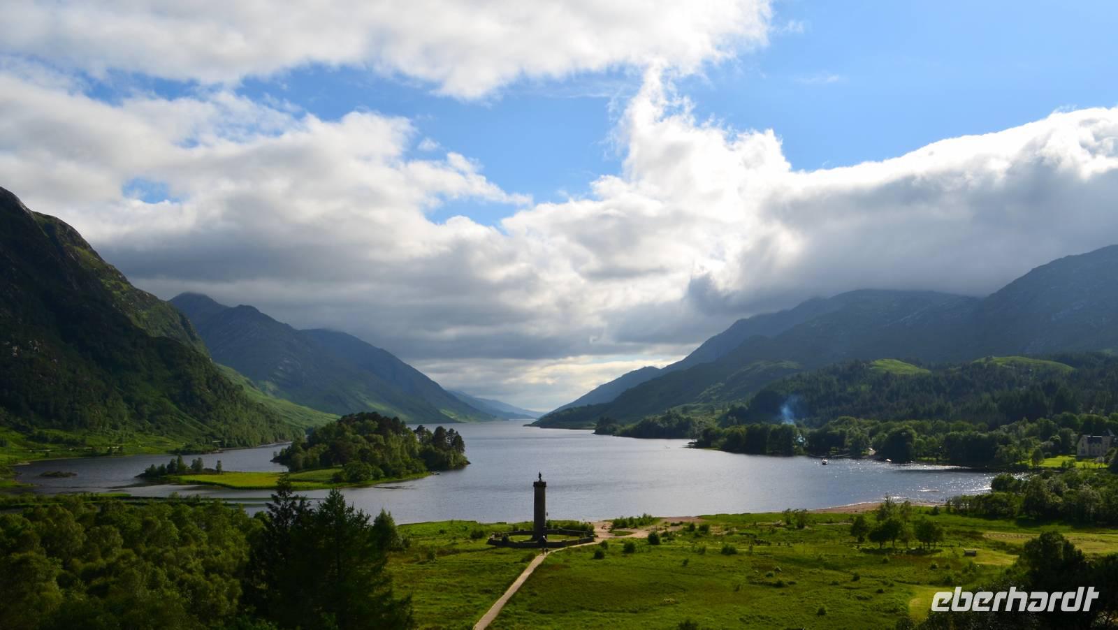 Die Weiterfahrt führt uns über Callander hinein in den Trossachs Nationalpark, mit einem Abstecher nach Killin, zu den Falls of Dochart. Dann fahren wir weiter in die Highlands und nach Glencoe. Unterwegs bieten sich unzählige weitere Fotostopps, so an der schönen Aussicht nach Tyndrum, oberhalb des Loch Tulla, am Rannoch Moor und mehrfach im Glen Coe. Am Nachmittag erreichen wir Fort William, fahren durch den Ort weiter nach Glenfinnian. Hier unternehmen wir an diesem schönen Nachmittag einen kleinen Spaziergang hinauf zum Aussichtshügel, von dem der berühmte Eisenbahnviadukt schön zu sehen ist. Hier öffnet sich auch der schönste Blick auf den Loch Shiel mit dem Monument.