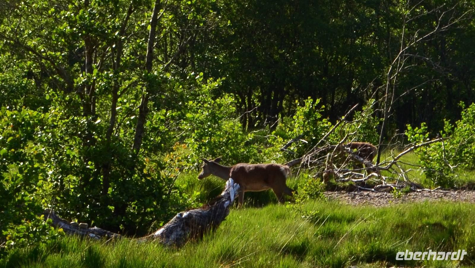 Wir spazieren hinunter und an den See, wo wir noch vier Hirsche in der Abendsonne beobachten können.