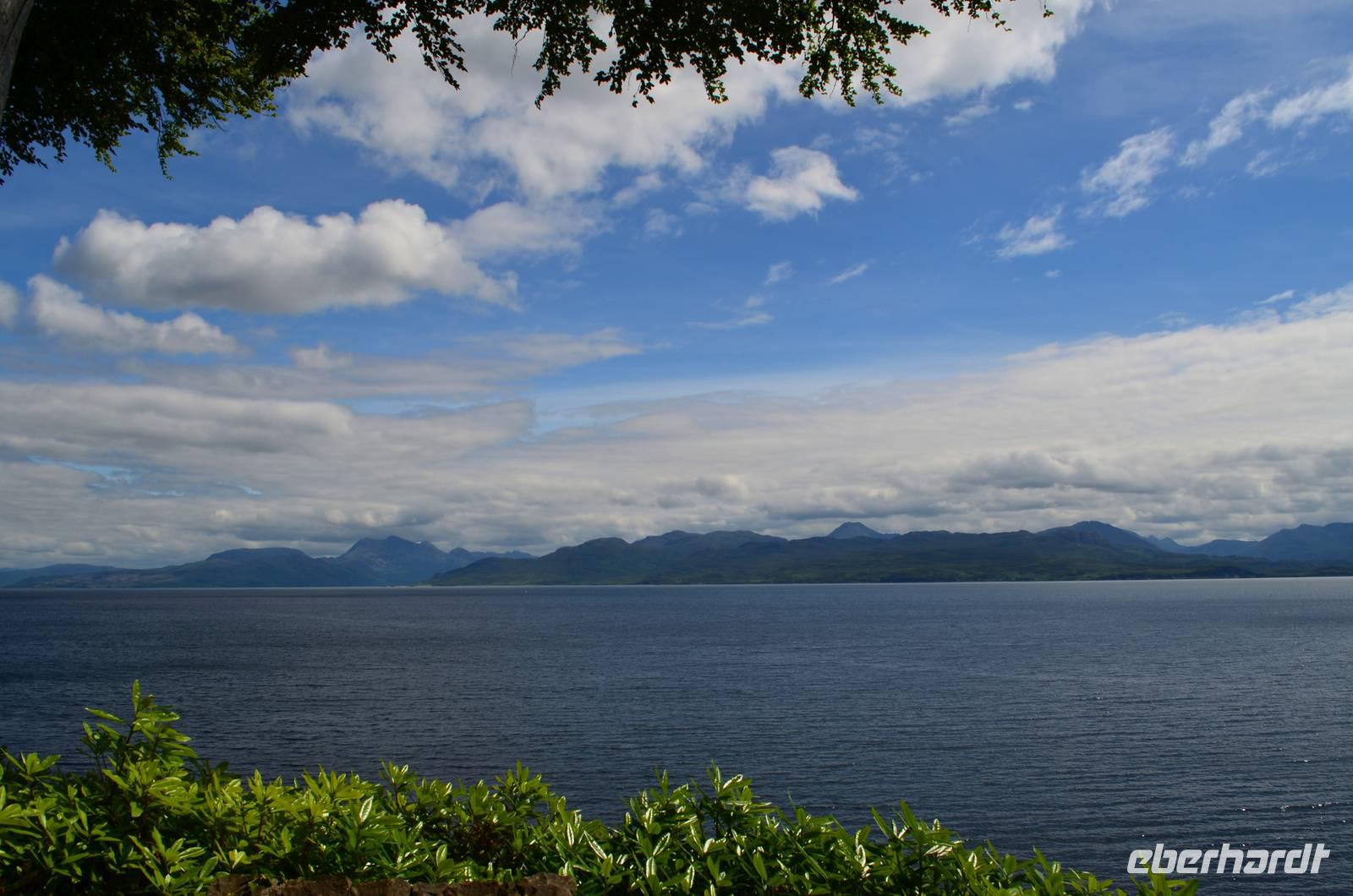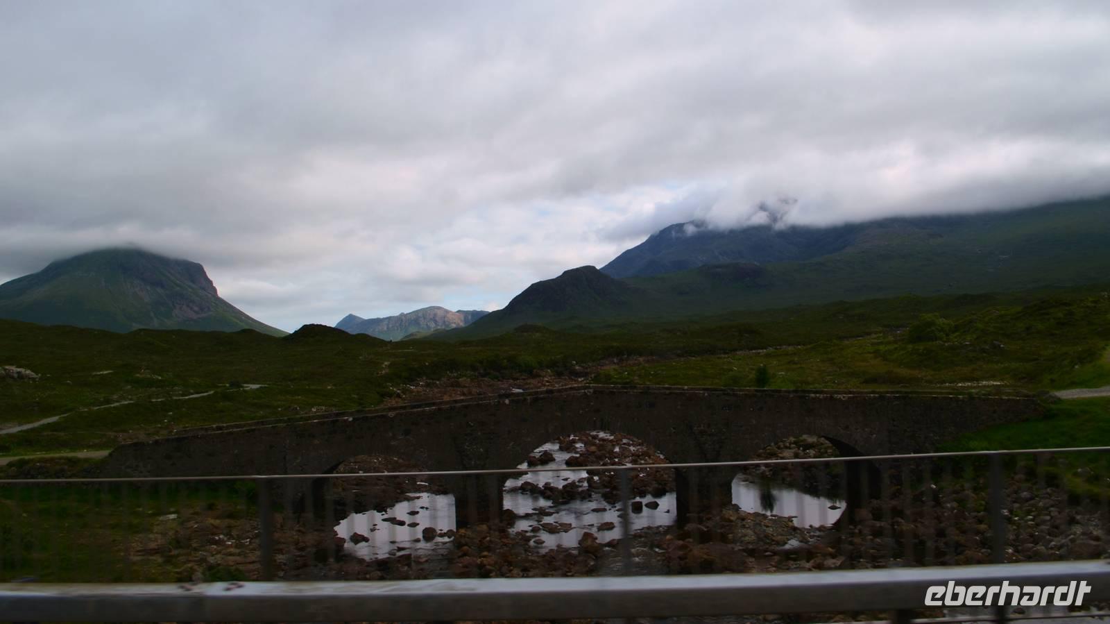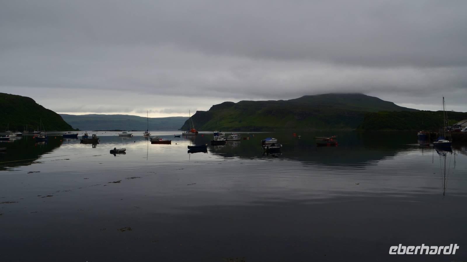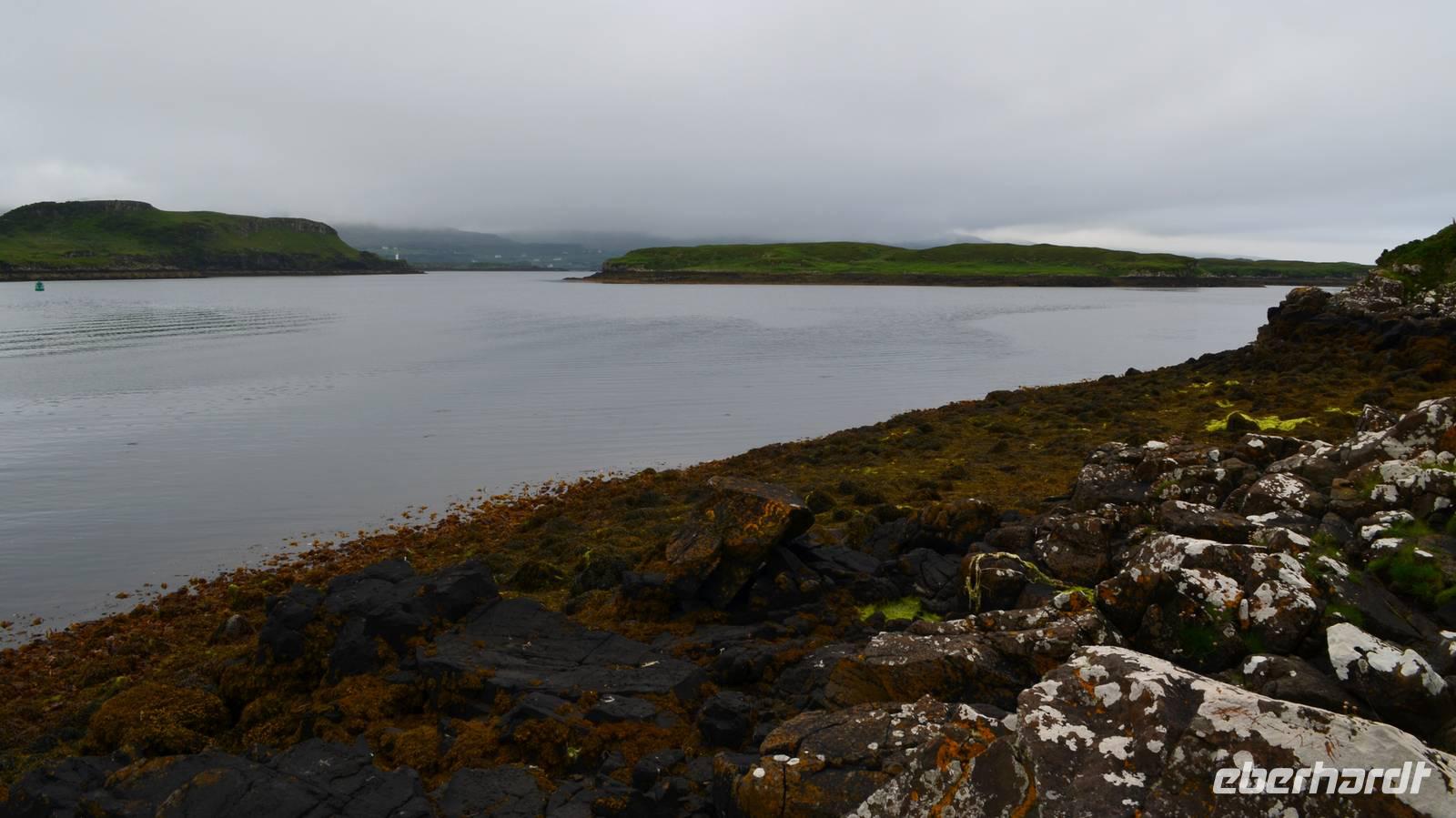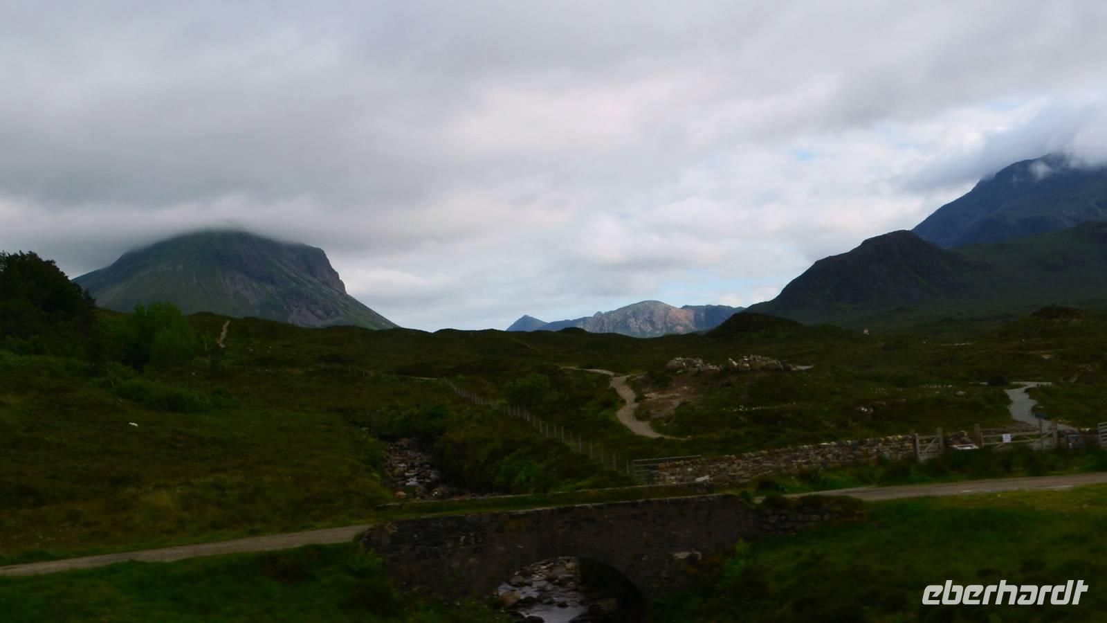 Schließlich erreichen wir die hüglige, von der letzten Eiszeit geformte Küstenlandschaft um Mallaig. An Europas größtem Krabbenumschlagplatz nehmen wir die Fähre hinüber nach Armadale/Advasar - auf die Insel Skye. Die Wolkeninsel präsentiert sich uns wolkenlos im Sonnenschein und entfaltet ihre ganze Schönheit.