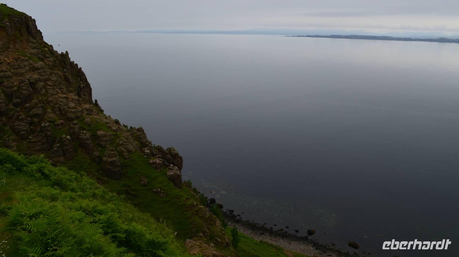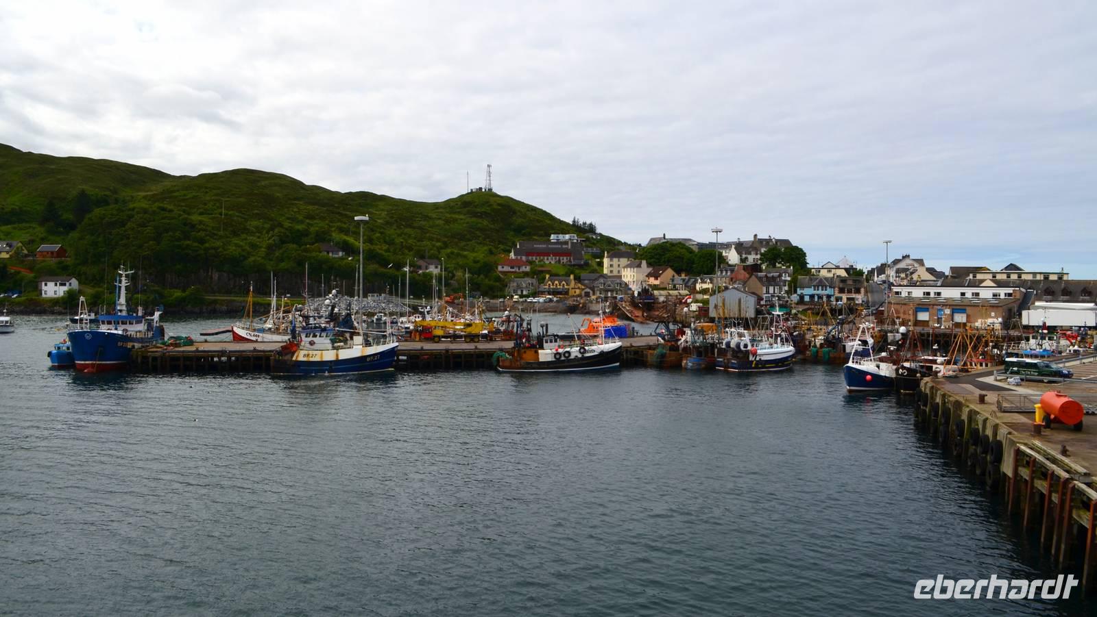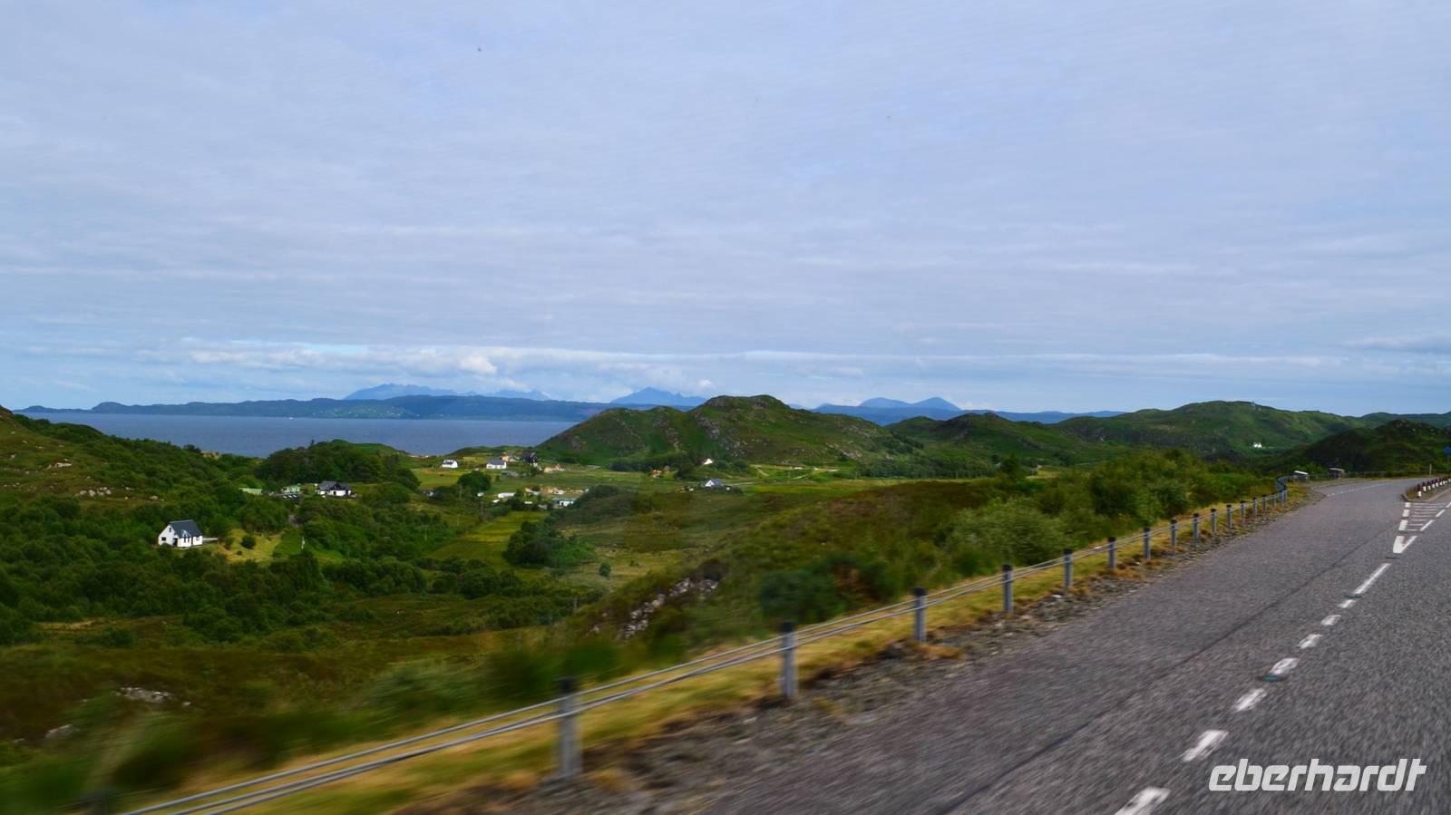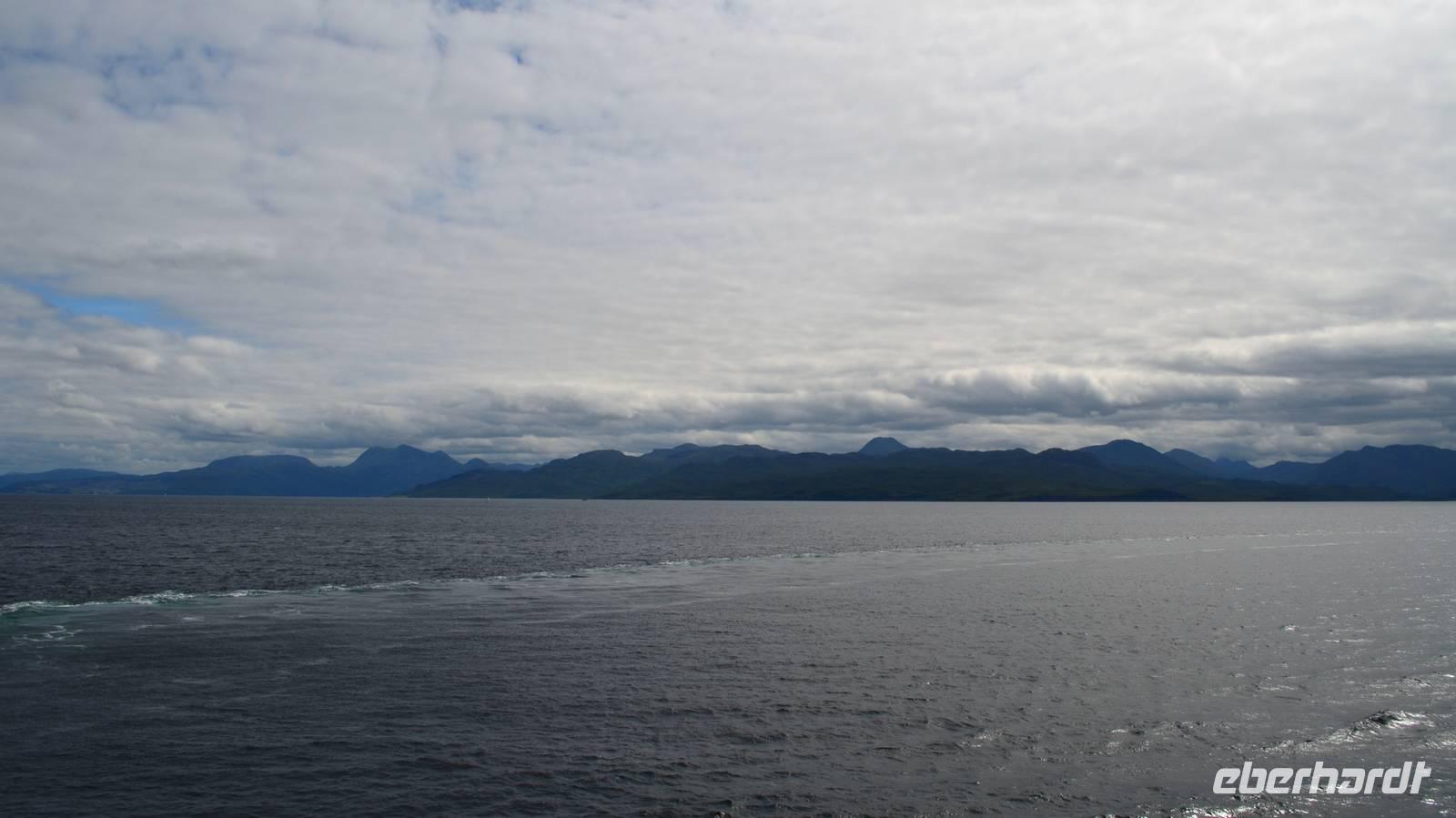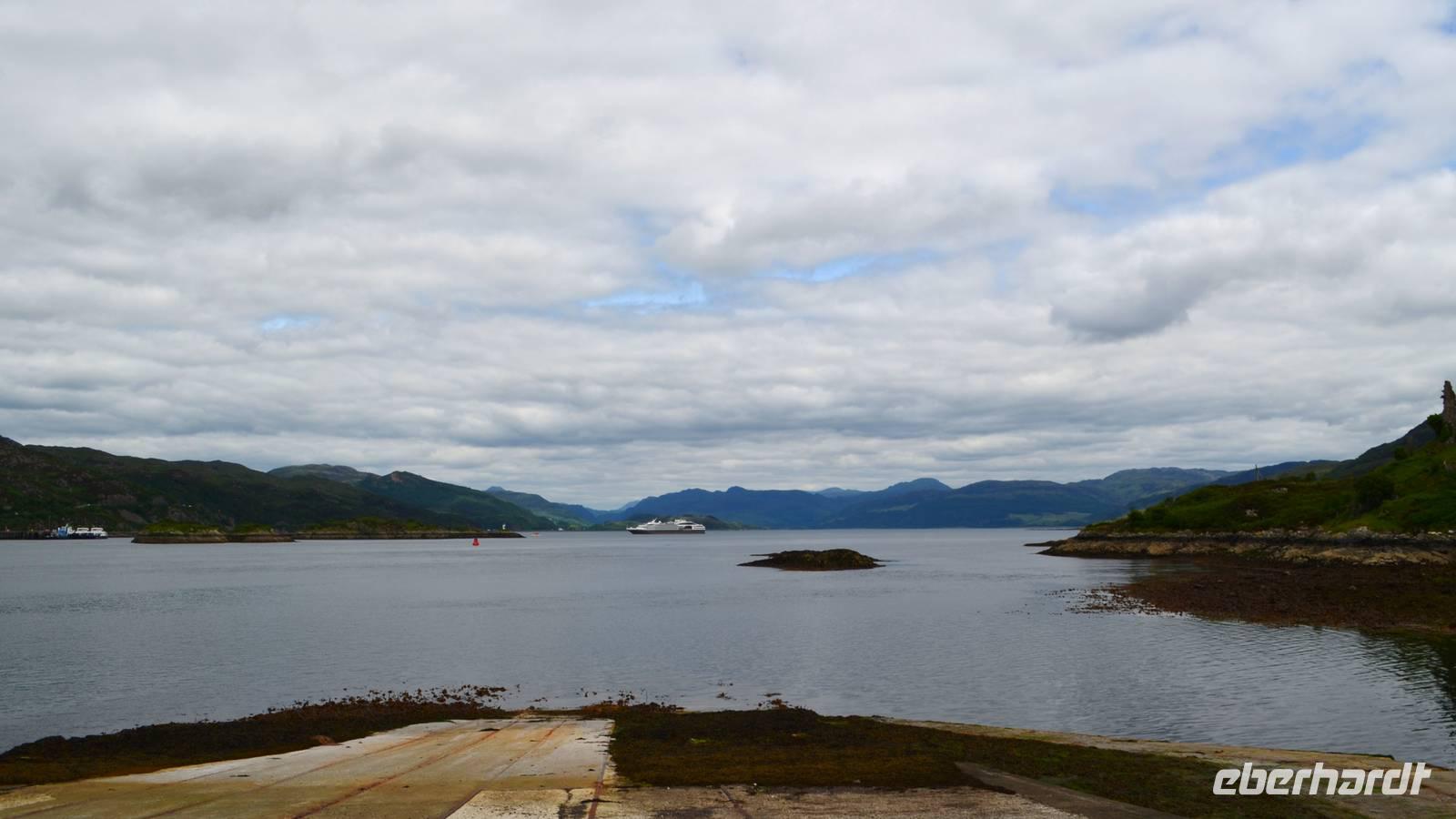 Schließlich erreichen wir die hüglige, von der letzten Eiszeit geformte Küstenlandschaft um Mallaig. An Europas größtem Krabbenumschlagplatz nehmen wir die Fähre hinüber nach Armadale/Advasar - auf die Insel Skye. Die Wolkeninsel präsentiert sich uns wolkenlos im Sonnenschein und entfaltet ihre ganze Schönheit.