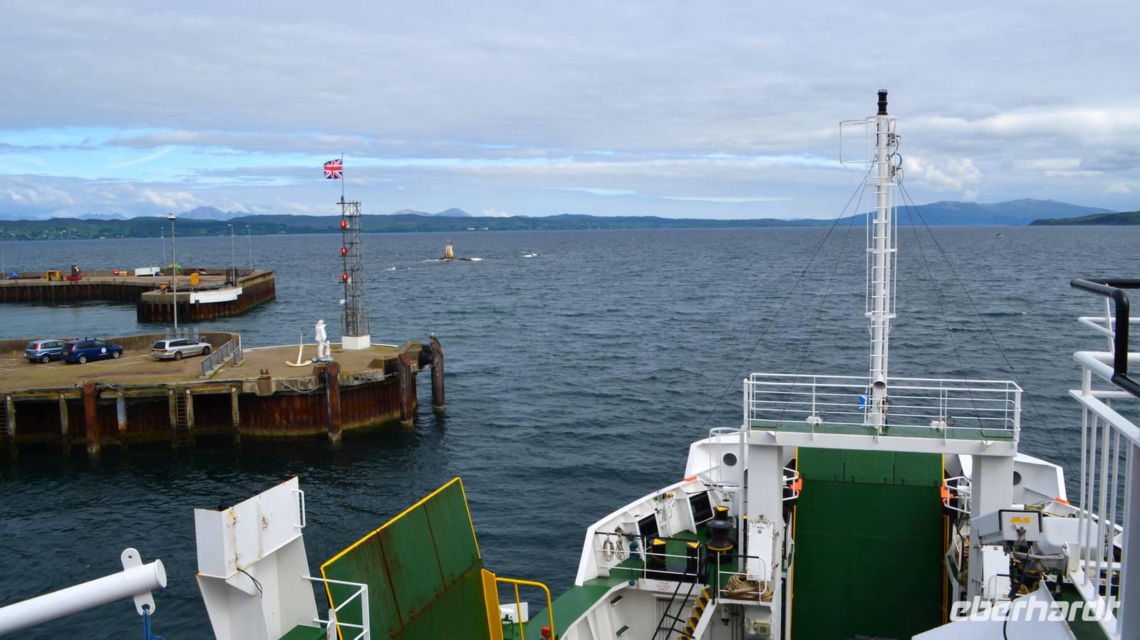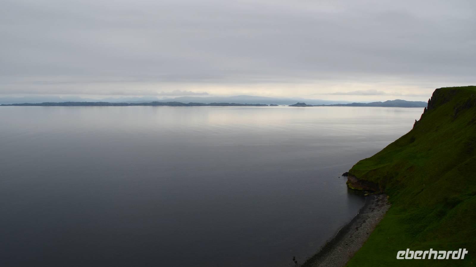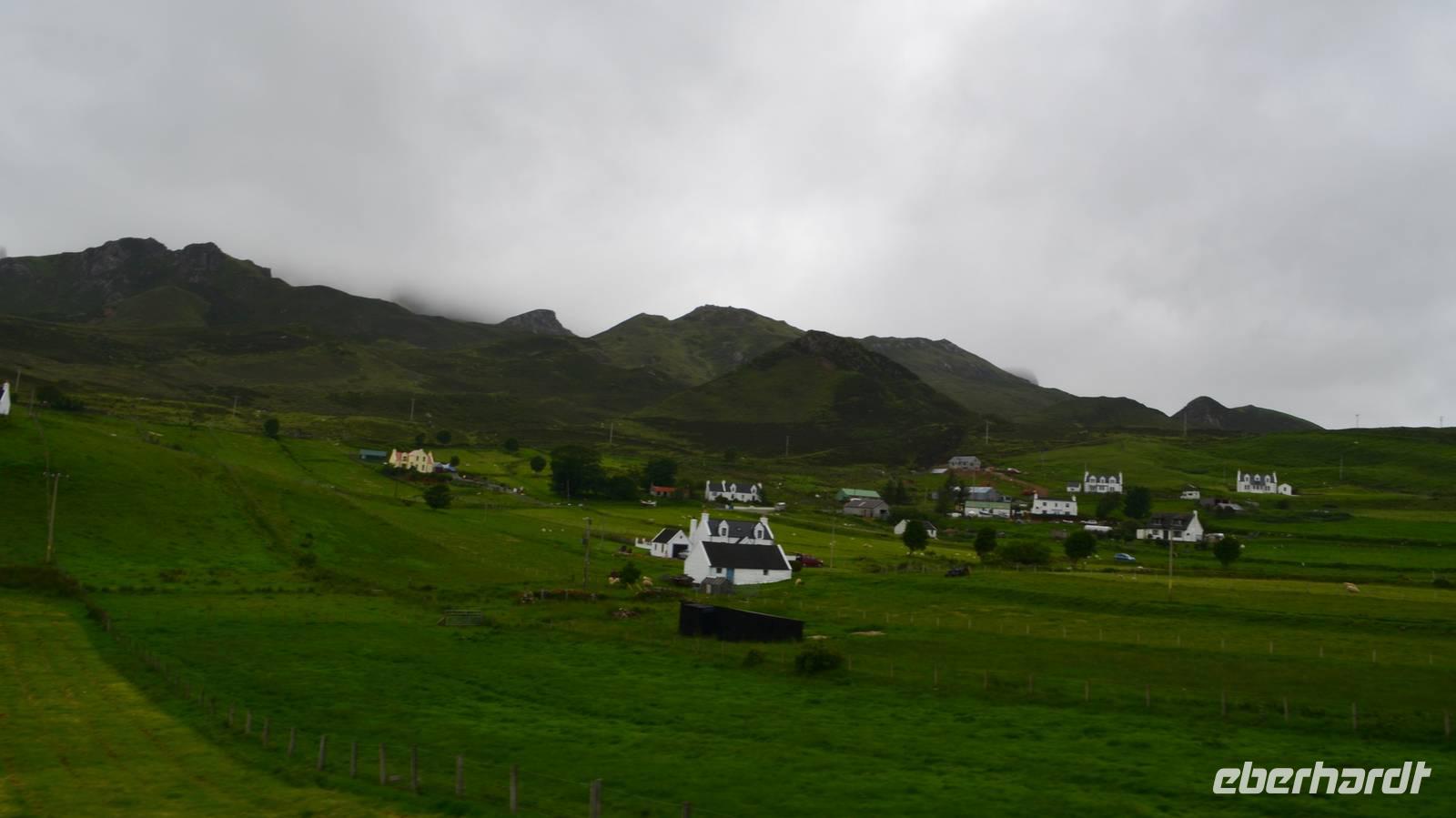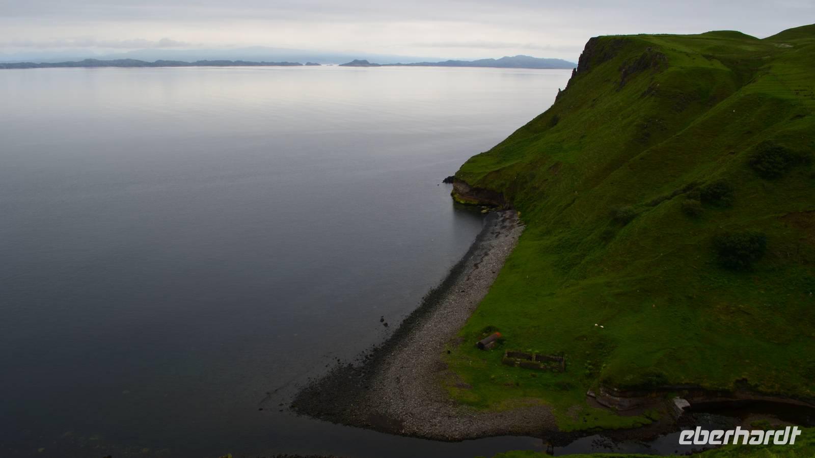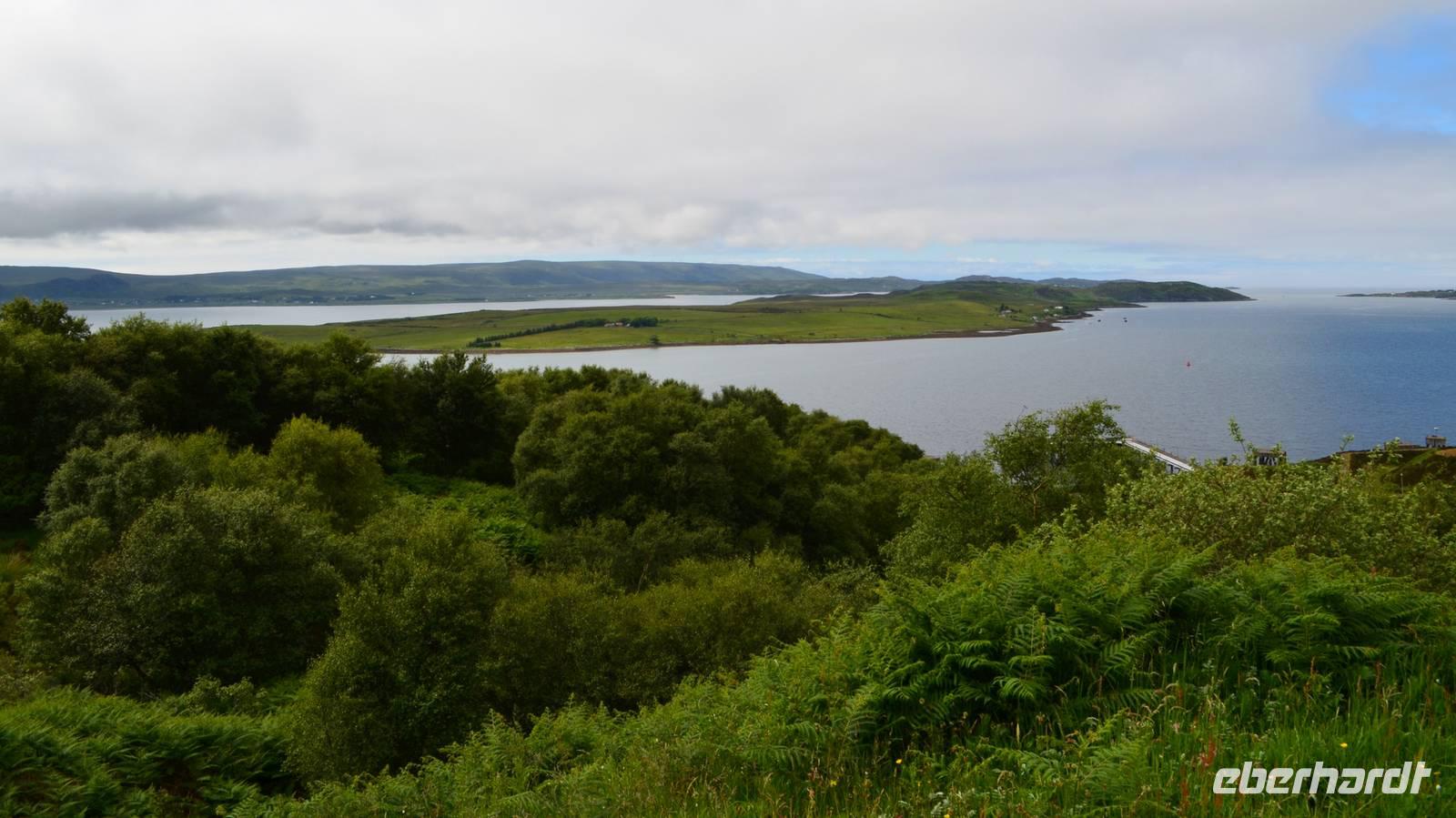 Schließlich erreichen wir die hüglige, von der letzten Eiszeit geformte Küstenlandschaft um Mallaig. An Europas größtem Krabbenumschlagplatz nehmen wir die Fähre hinüber nach Armadale/Advasar - auf die Insel Skye. Die Wolkeninsel präsentiert sich uns wolkenlos im Sonnenschein und entfaltet ihre ganze Schönheit.