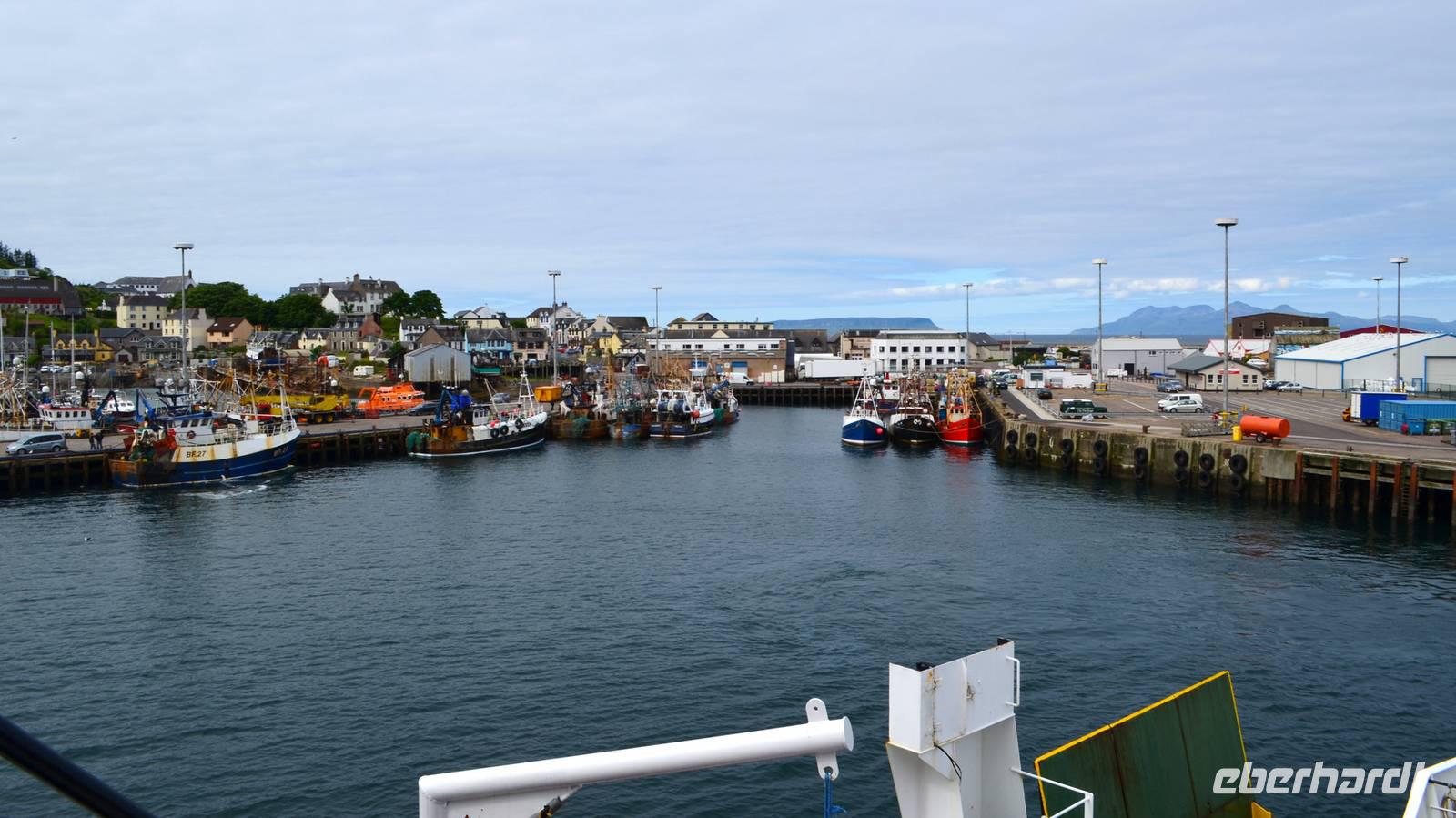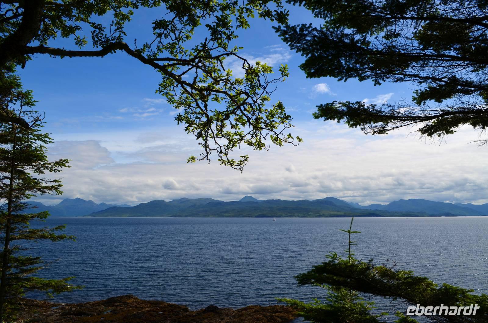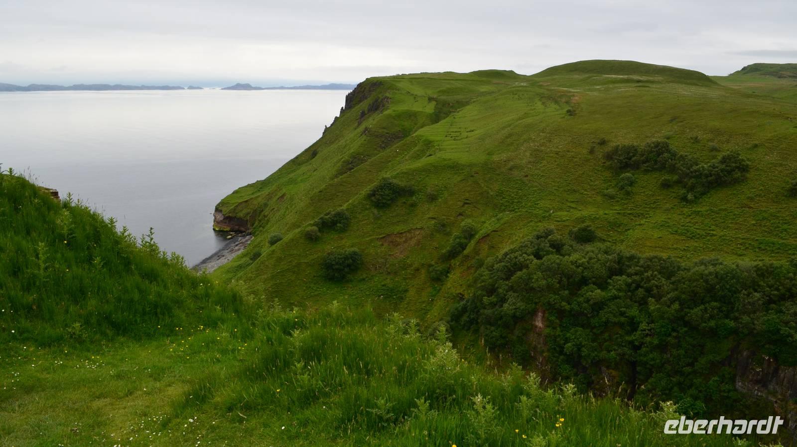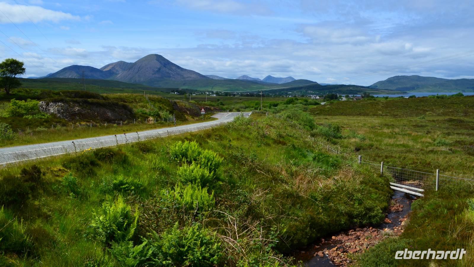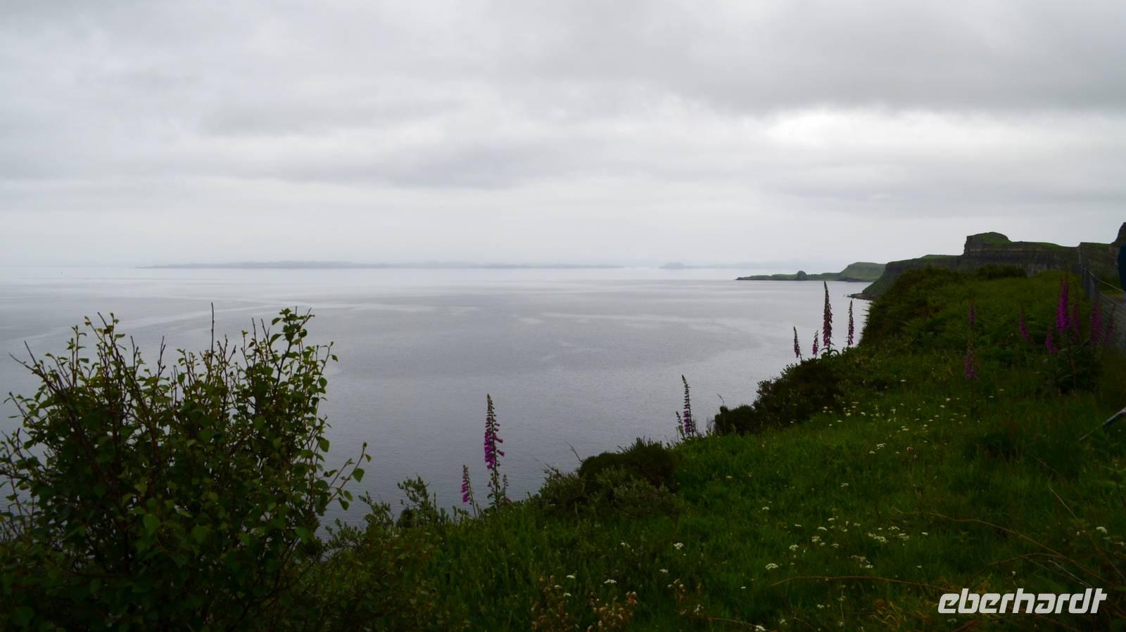 Schließlich erreichen wir die hüglige, von der letzten Eiszeit geformte Küstenlandschaft um Mallaig. An Europas größtem Krabbenumschlagplatz nehmen wir die Fähre hinüber nach Armadale/Advasar - auf die Insel Skye. Die Wolkeninsel präsentiert sich uns wolkenlos im Sonnenschein und entfaltet ihre ganze Schönheit.