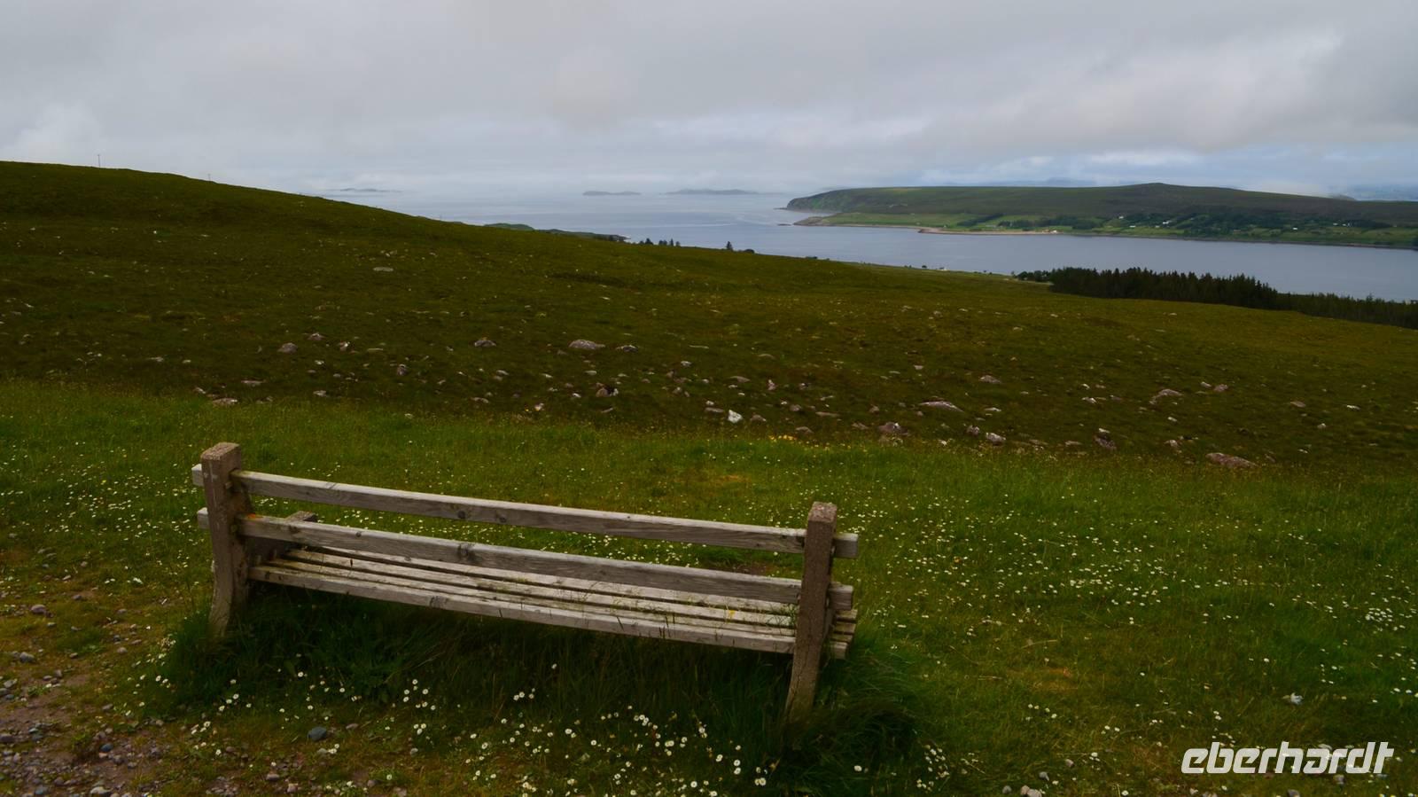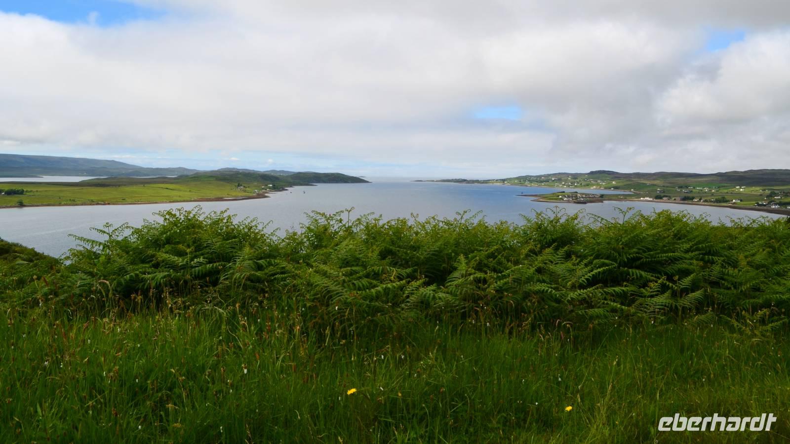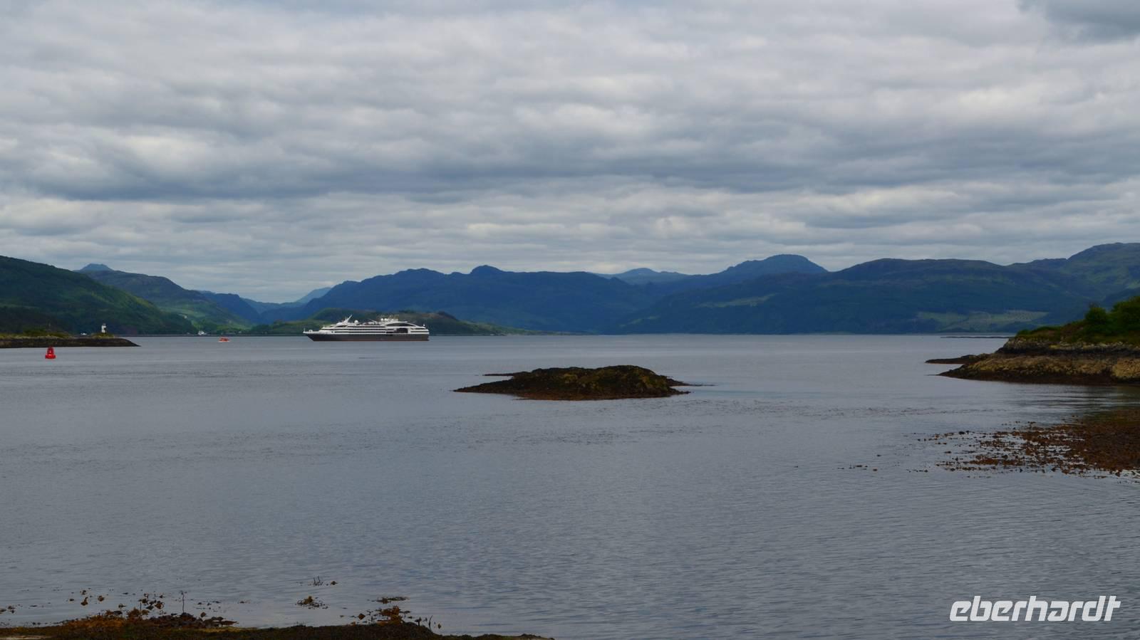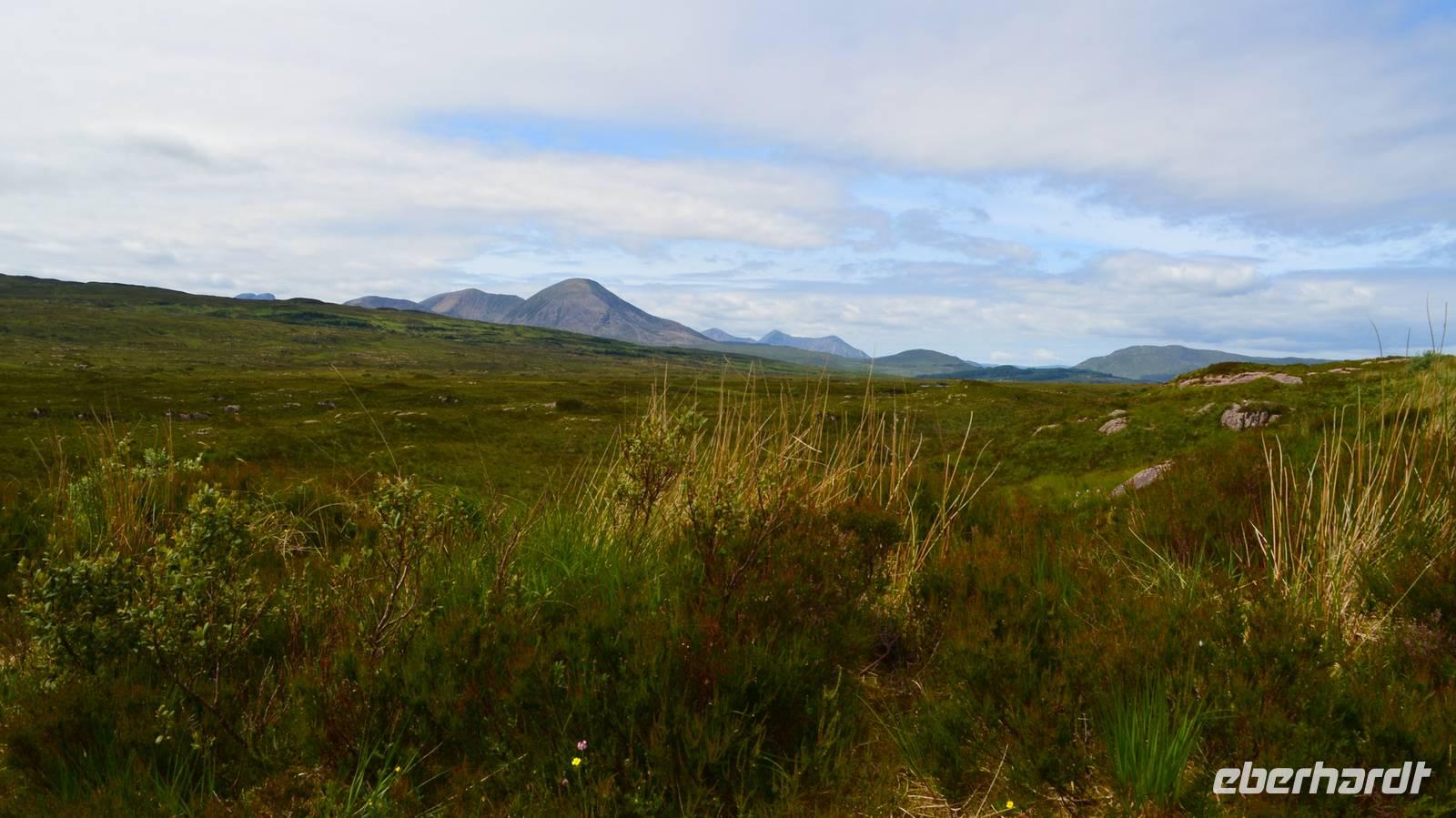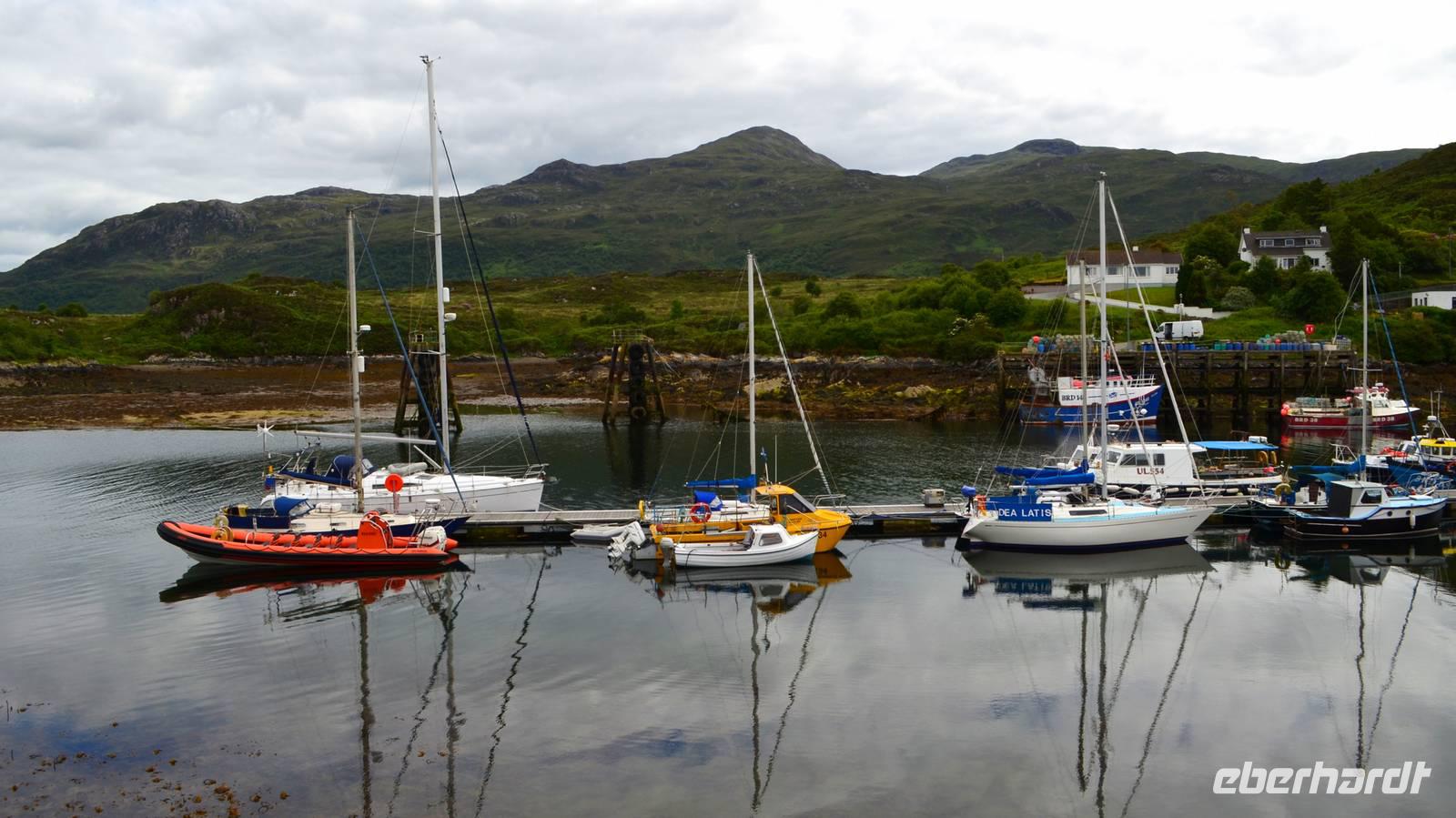 Schließlich erreichen wir die hüglige, von der letzten Eiszeit geformte Küstenlandschaft um Mallaig. An Europas größtem Krabbenumschlagplatz nehmen wir die Fähre hinüber nach Armadale/Advasar - auf die Insel Skye. Die Wolkeninsel präsentiert sich uns wolkenlos im Sonnenschein und entfaltet ihre ganze Schönheit.