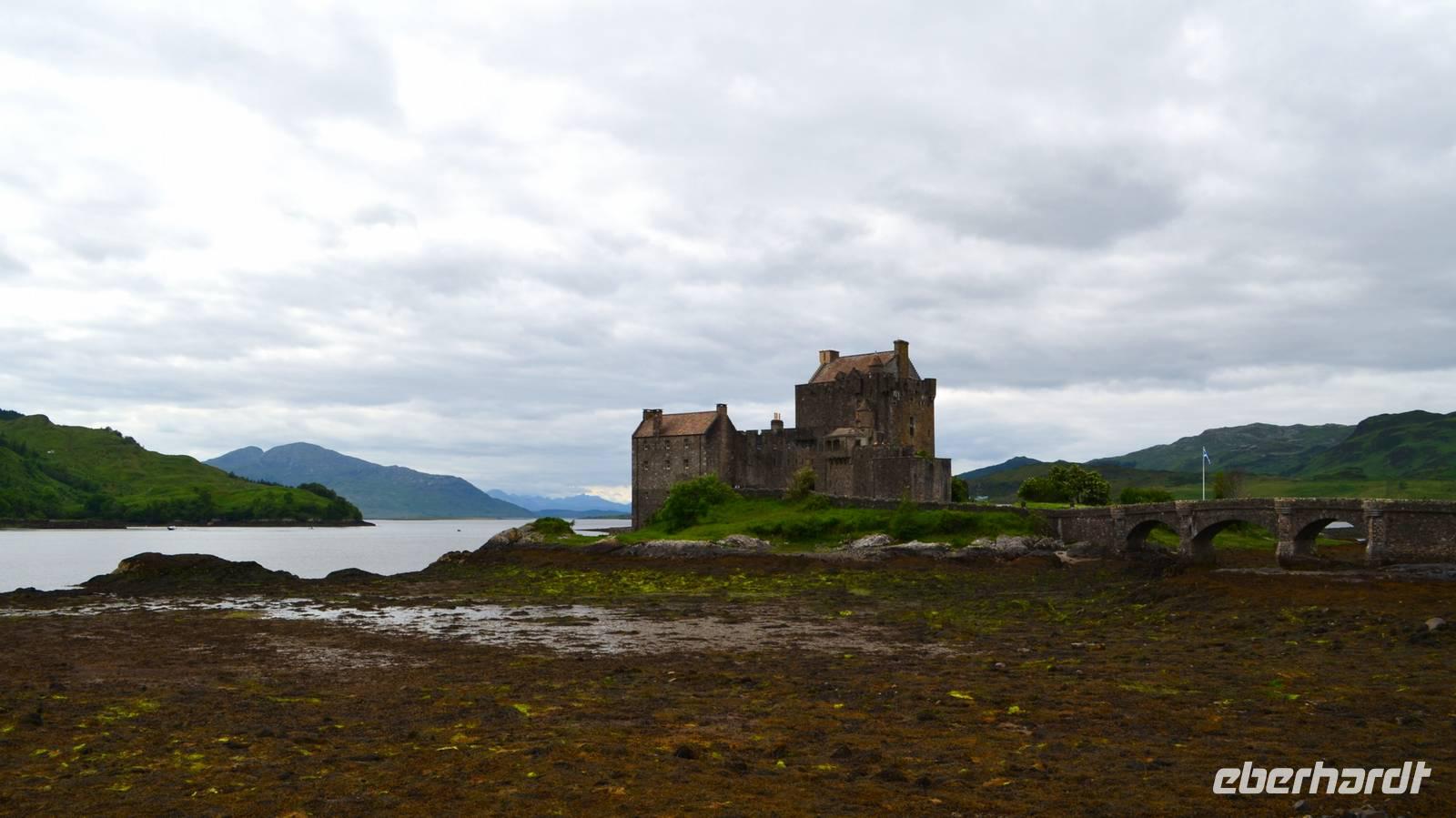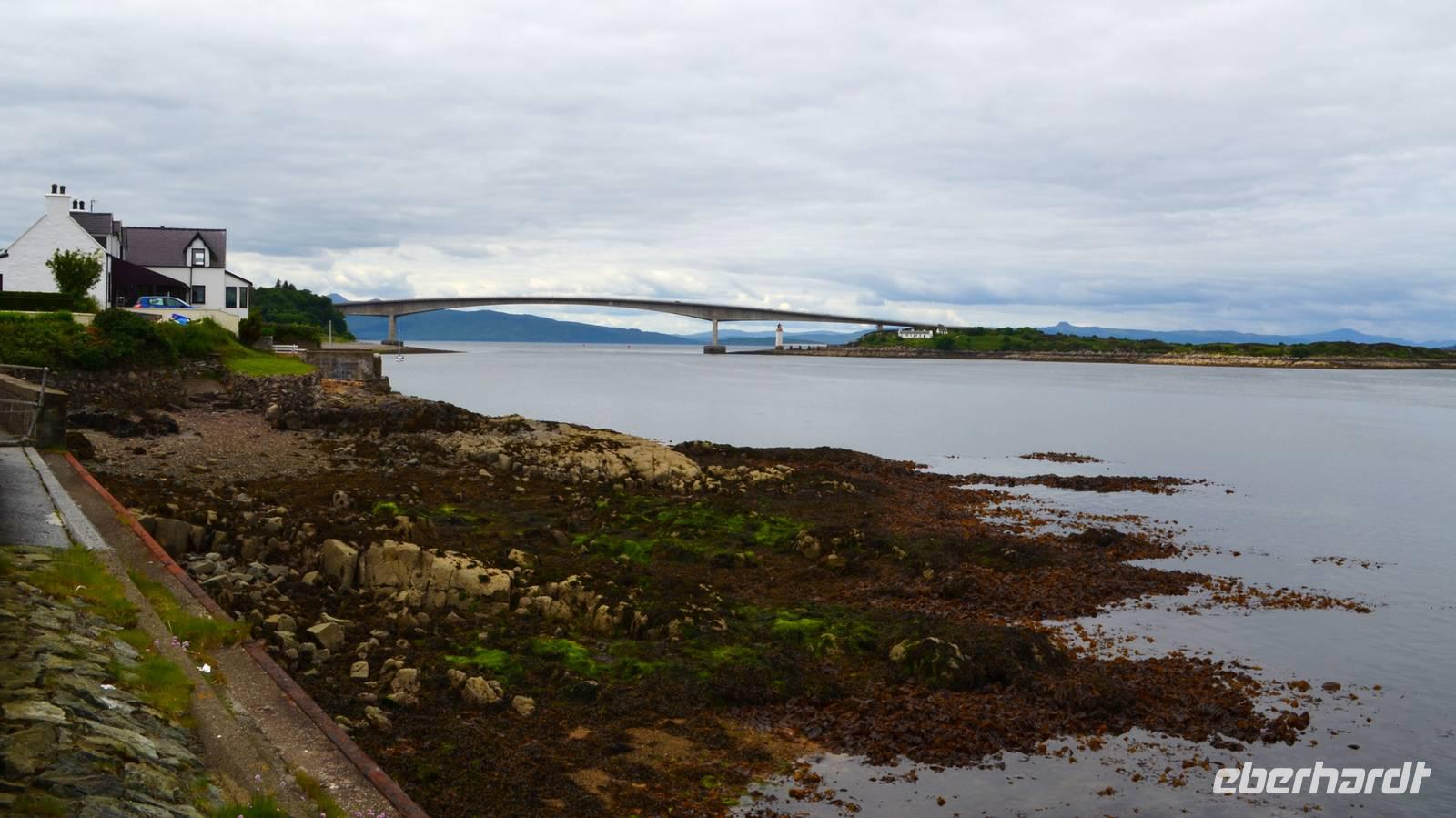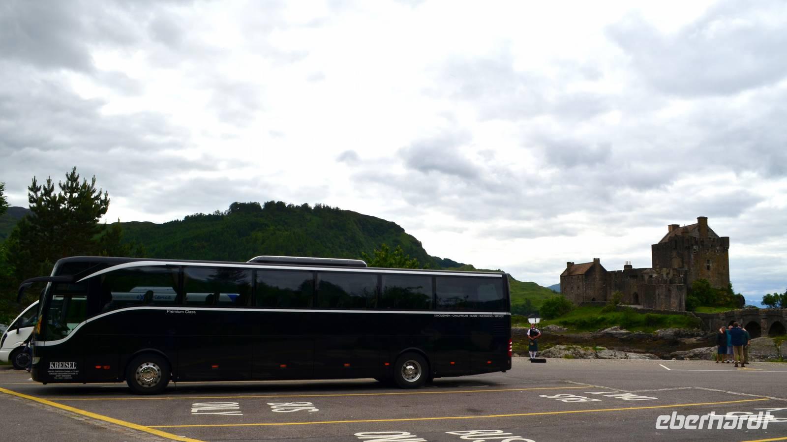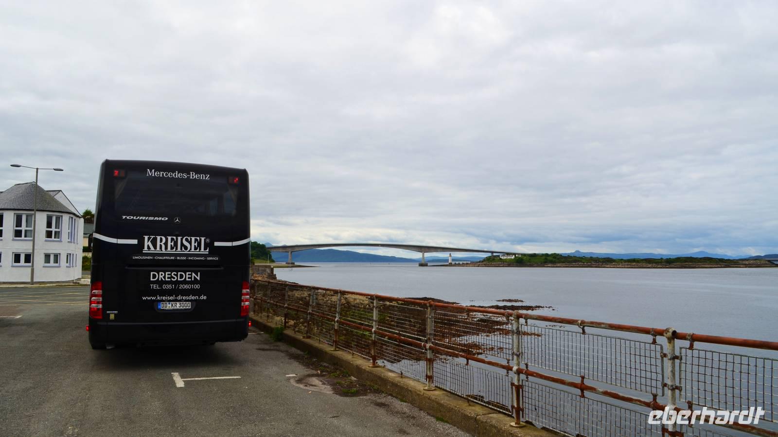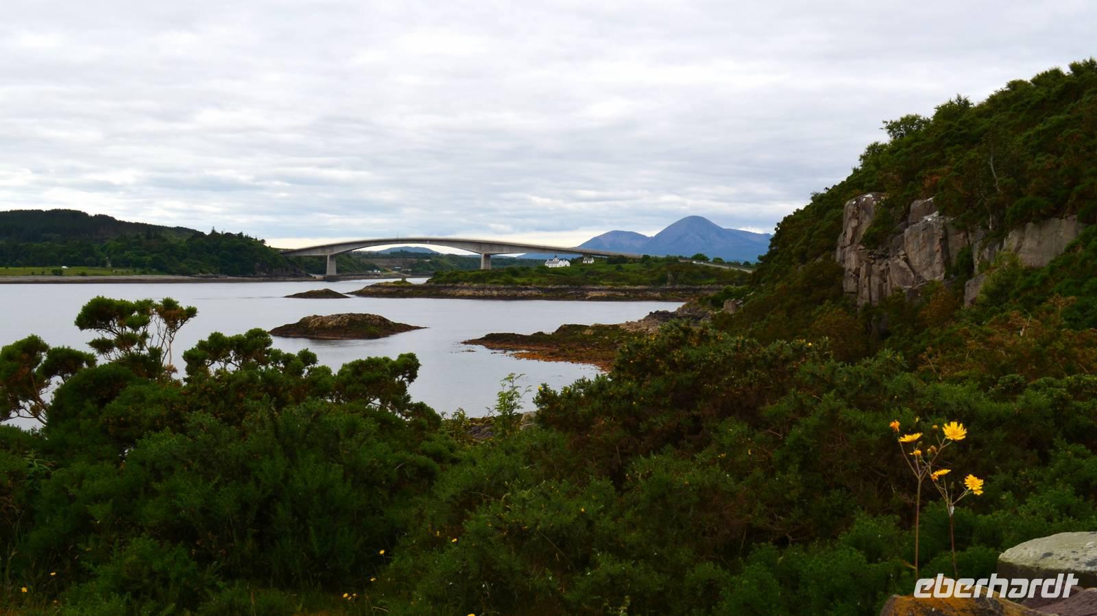 Am Nachmittag fahren wir durch die Landschaft nahe der Cuillin Hills nach Kyleakin, wo die Skyebridge, die imposant die Insel mit dem Festland verbindet, schön zu sehen ist, aber auch der Loch Alsh und sein Bergpanorama beeindrucken.. Gegenüber die kleine Burgruine des Ortes. Bevor es dann weiter zu unserem Hotel nach Balmacara geht, fahren wir noch ein Stück weiter, zum schottischen Wahrzeichen Eilean Donan Castle. Hier machen wir gemeinsam mit einem Piper unser Gruppenfoto.