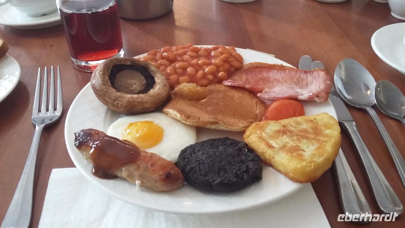 Nach einem ordentlichen Frühstück mit Black Pudding (gebackener Blutwurst), Spiegeleiern, gebackenen Bohnen und Haggis (gefüllter Schafsmagen- eine Spezialität in Schottland) ging es los Richtung Mallaig, von wo aus wir mit der Fähre zur Isle of Skye übersetzten. Das Wetter meinte es heute leider alles andere als gut mit uns, sodass wir uns- auf der Insel angekommen- erst einmal auf die Suche nach einem guten Pub zum Trocknen und Mittagessen begaben. In einem kleinen Küstenort mit äußerst engen Straßen wurden wir fündig. Und da heute Sonntag war, entschieden sich fast alle Gäste für den typisch Britischen „Sunday Roast" mit Roast Beef, Bratkartoffeln, Sommergemüse und Yorkshire Pudding (eine Art Blätterteig und sehr lecker)- dazu ein lokales Bier- und die Welt war in Ordnung! So hatten wir eine gute Grundlage, um uns anschließend die wunderschönen Gärten und die Ruine von Armadale Castle anzuschauen. Leicht durchnässt und schon ein wenig müde von den letzten Tagen der Reise, entschieden wir uns, heute etwas eher im Hotel einzuchecken. Eine gute Entscheidung: Im Kings Arms direkt am Wasser gelegen erwartete man uns bereits mit einer auf Deutsch übersetzen Speisekarte und der Ankündigung, dass heute Abend im Hotel schottische Live-Musik veranstaltet würde. Nach dem Abendessen ging es für viele Gäste wieder an die Whisky-Bar und viele ließen es sich zu Akkordeon-Klängen und bekannten Melodien nicht nehmen, den edelsten Tropfen der Isle of Skye zu verköstigen- den rauchig-torfigen Talisker...