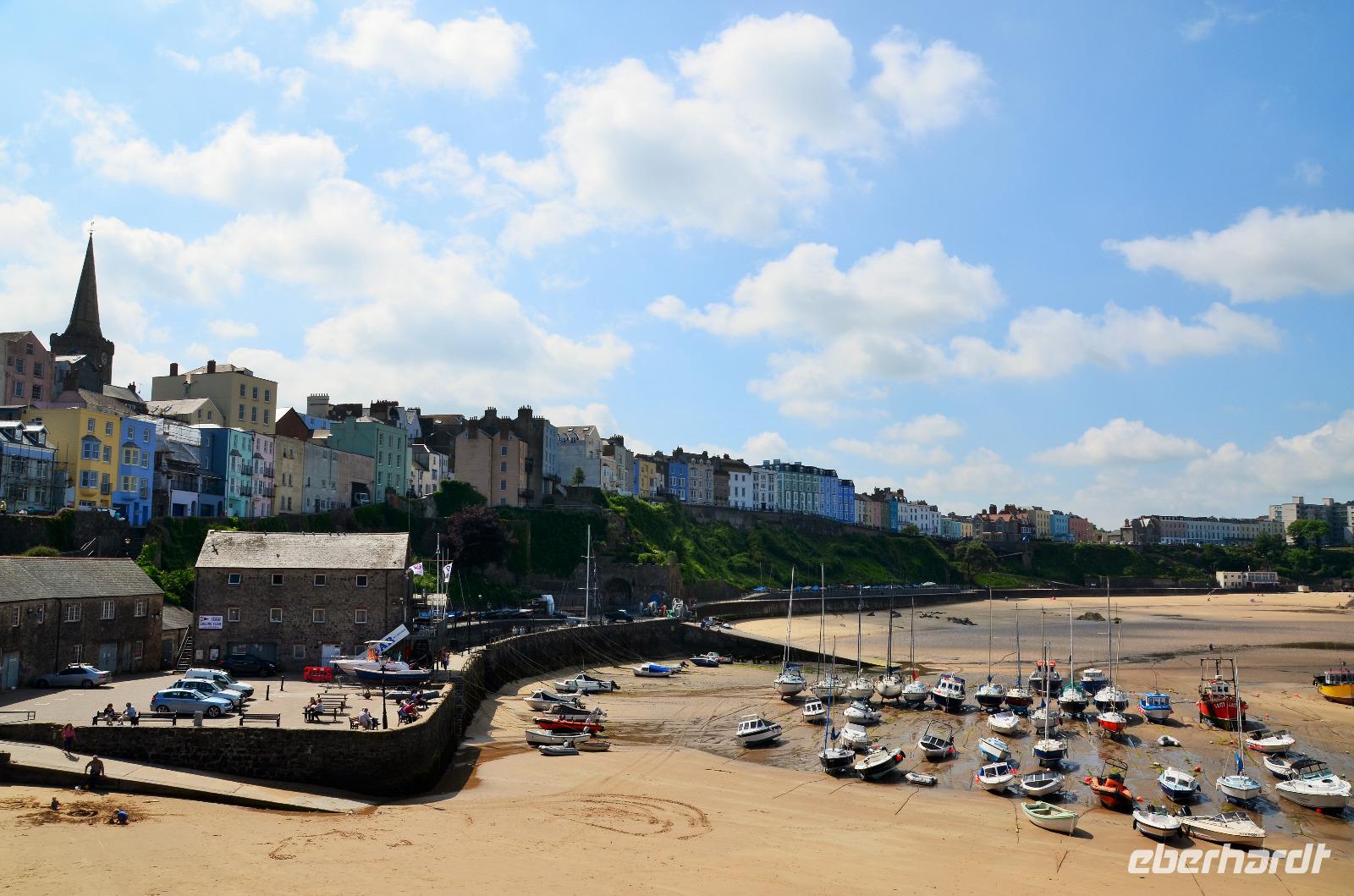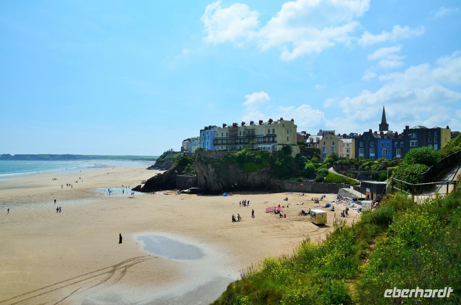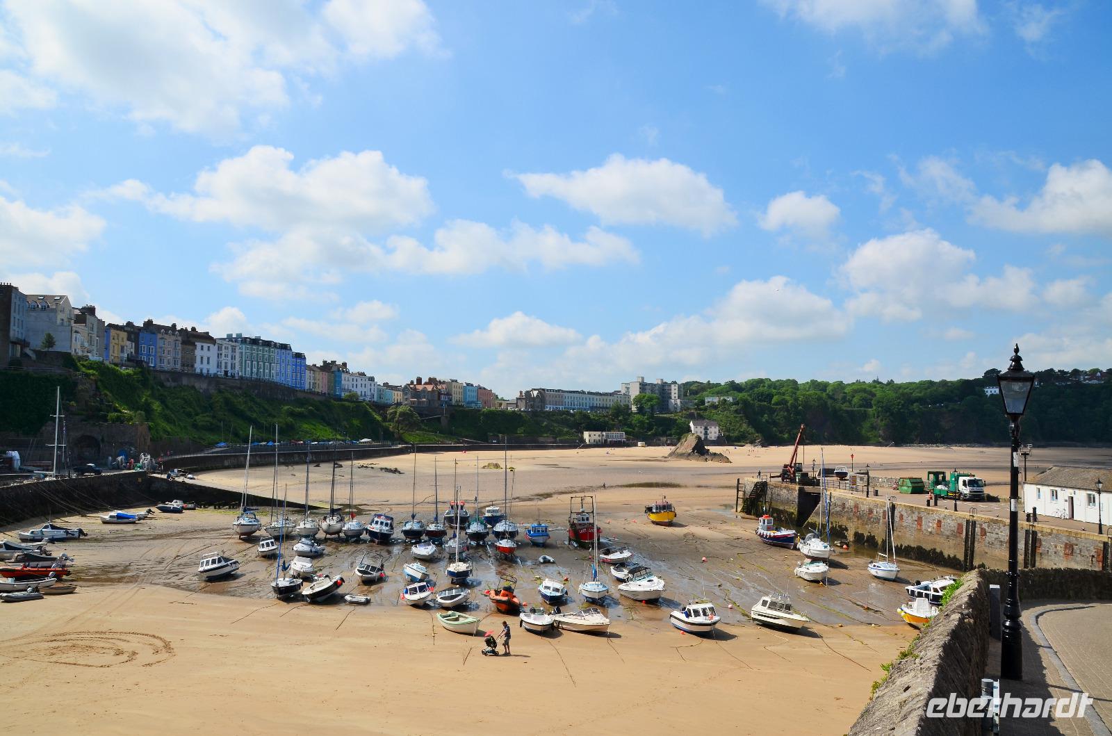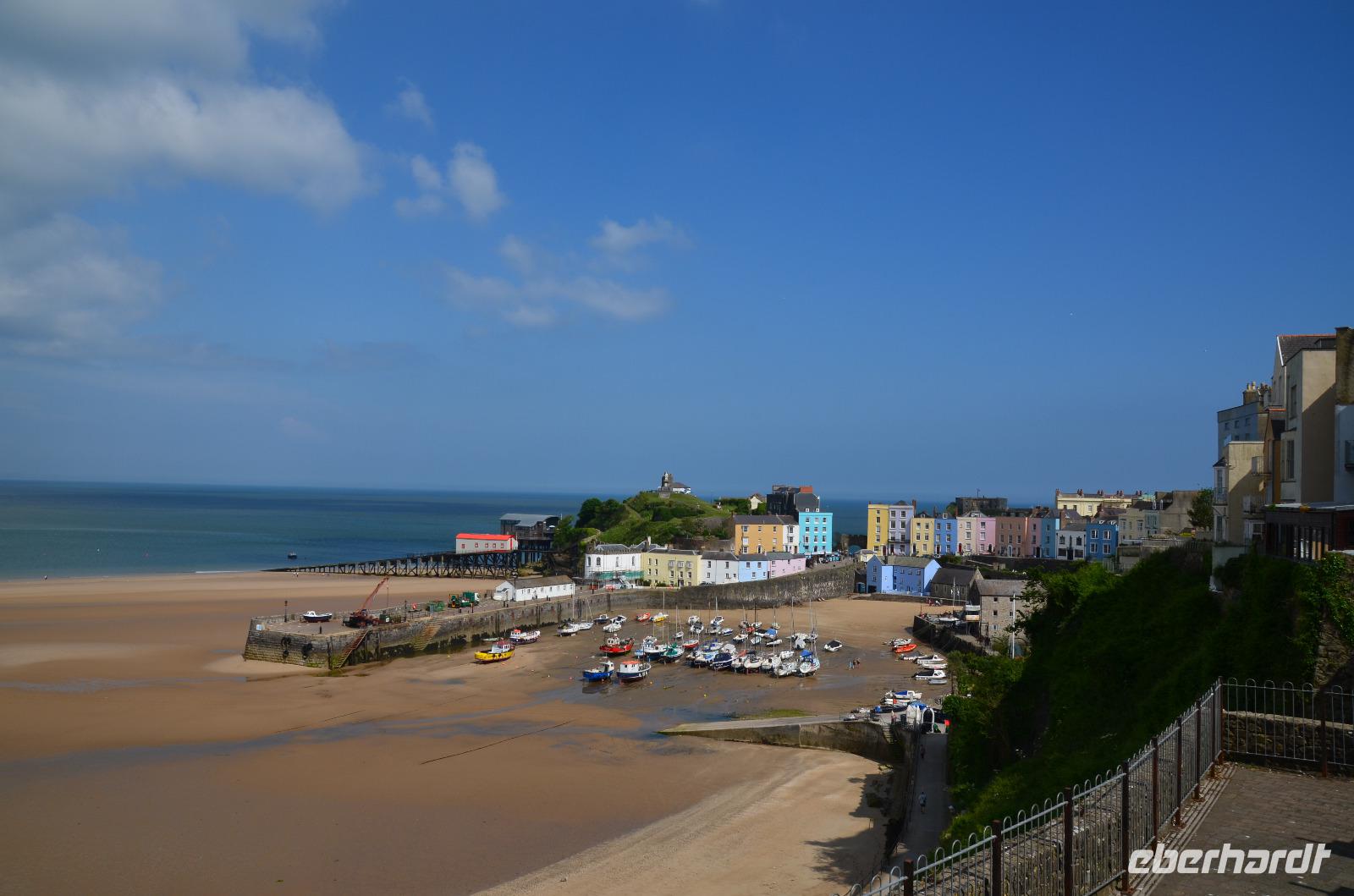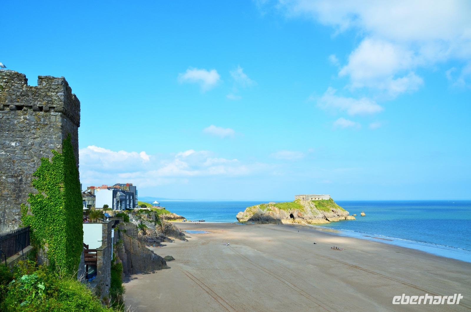 Nun lockt es uns aber auch noch an die romantische Küste und so fahren wir nach Tenby, an die walisische Riviera weiter. Tenby, ein hübscher Badeort mit alter Stadtmauer, hübschen belebten Gassen, einer alten Festung auf einem Felsvorsprung, herrlichen Stränden und felsiger Steilküste gefällt uns mit seinen bunten Häusern und lebendigen Gassen sofort. Die Ebbe lässt gerade viel Platz für einen Strandspaziergang.