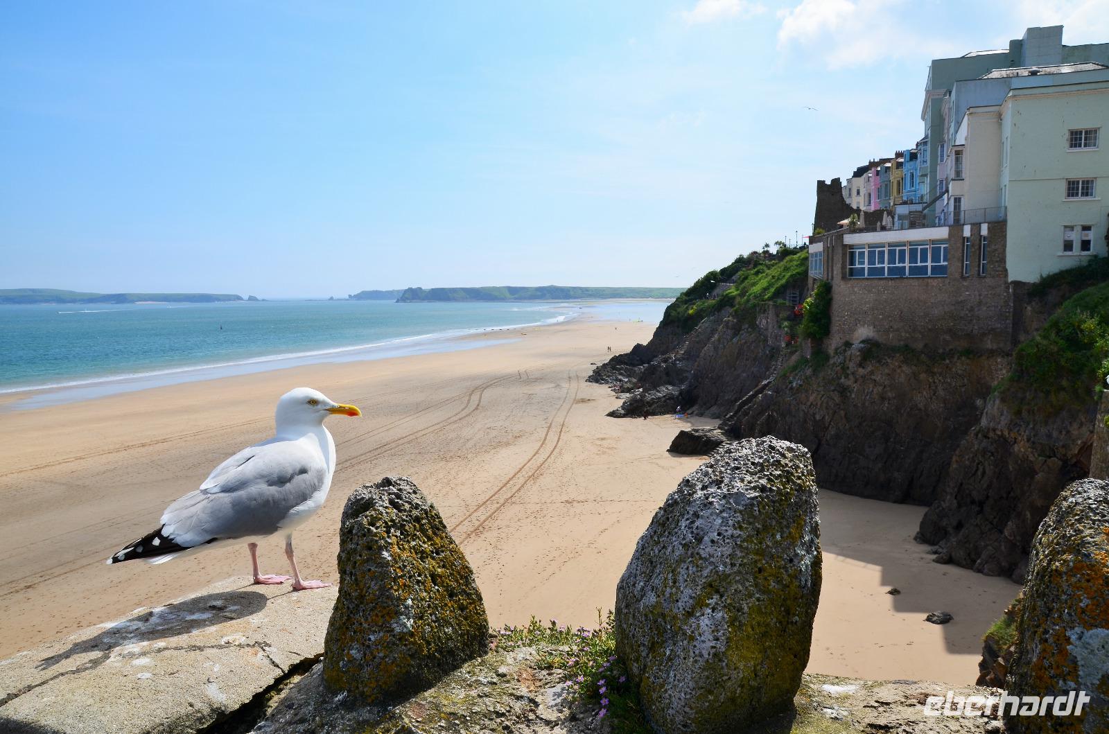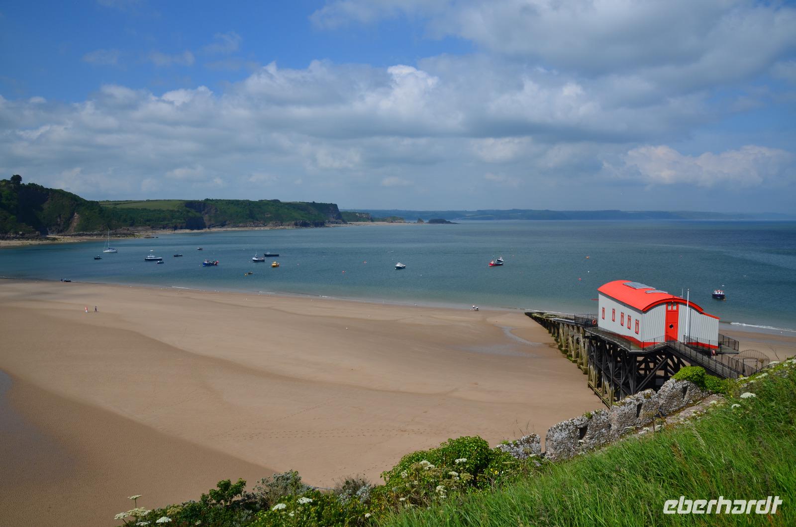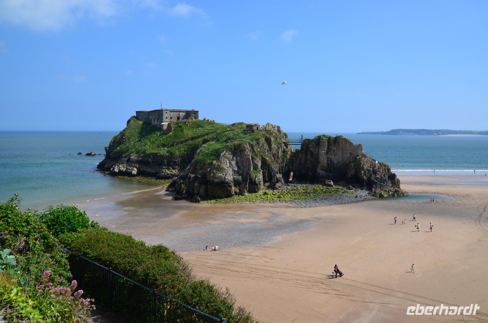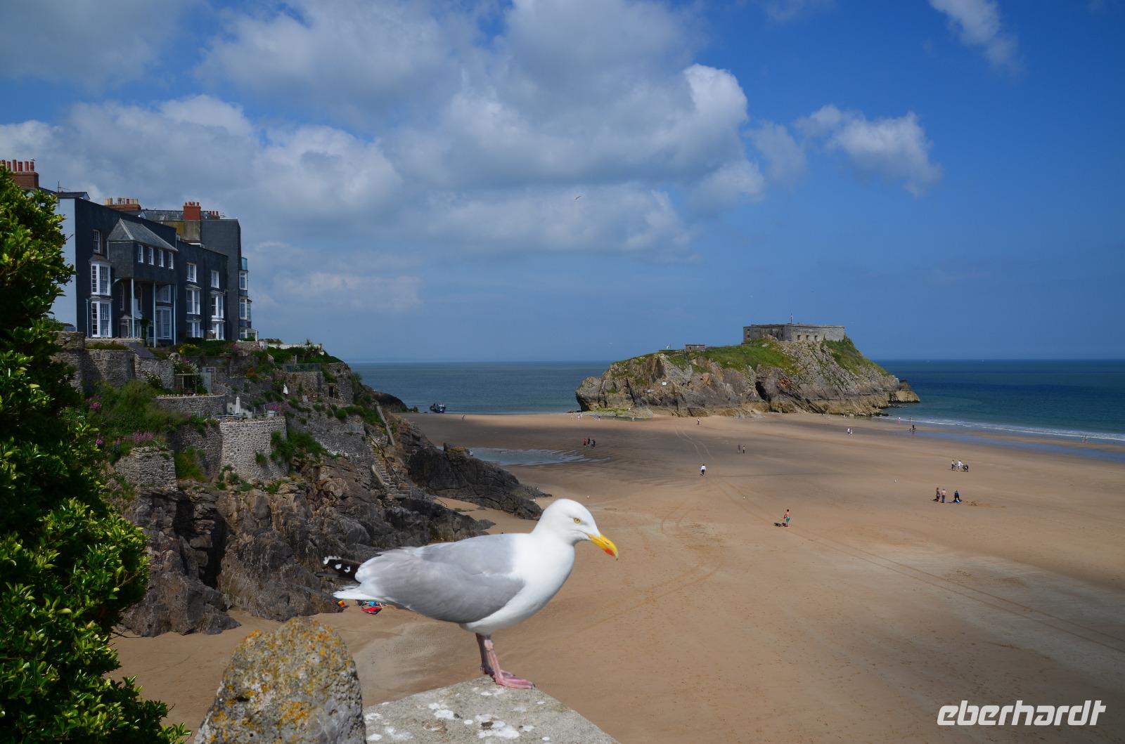 Nun lockt es uns aber auch noch an die romantische Küste und so fahren wir nach Tenby, an die walisische Riviera weiter. Tenby, ein hübscher Badeort mit alter Stadtmauer, hübschen belebten Gassen, einer alten Festung auf einem Felsvorsprung, herrlichen Stränden und felsiger Steilküste gefällt uns mit seinen bunten Häusern und lebendigen Gassen sofort. Die Ebbe lässt gerade viel Platz für einen Strandspaziergang.