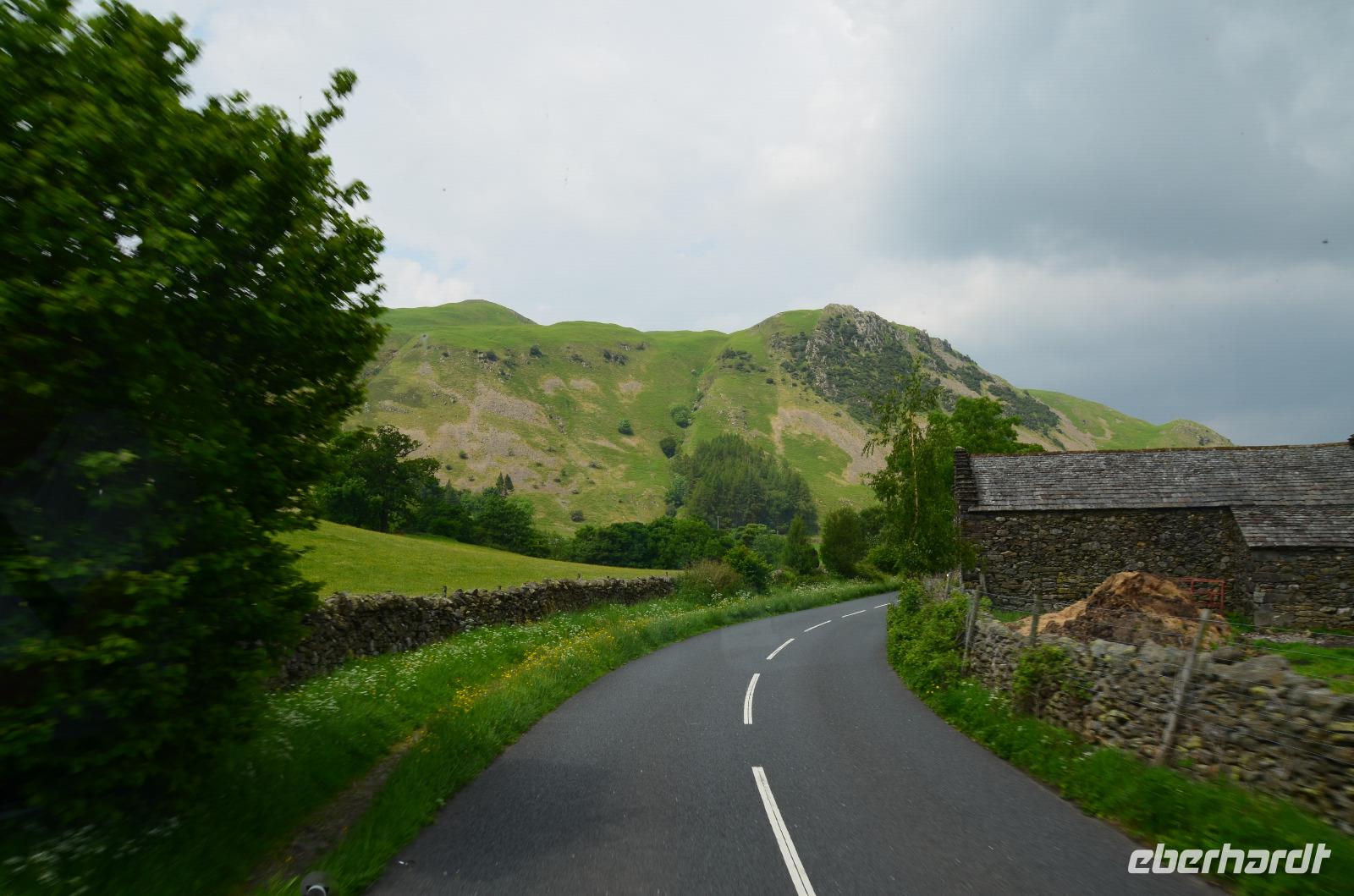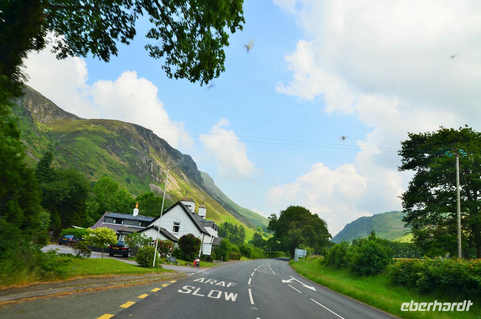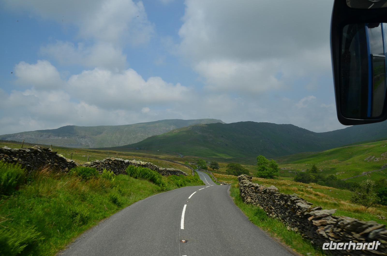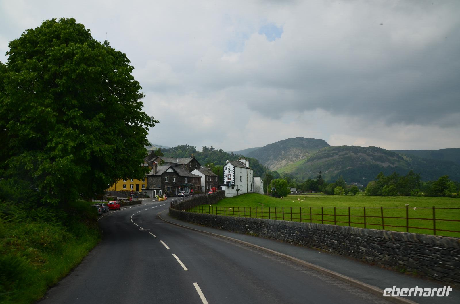 Vom Ufer diese hübschen Ortes geht die Weiterfahrt hinauf in die Berge und zum nördlichen Lake District. Zuerst zurück nach Windermere, dann links hinauf zum Kirkstone Pass, wo wir die Aussicht genießen und Mittag machen. Von hier geht es wieder hinab zu den Bruderseen und dann entlang am Lake Ullswater Richtung Penrith, schließlich nach Schottland - nach Gretna Green.