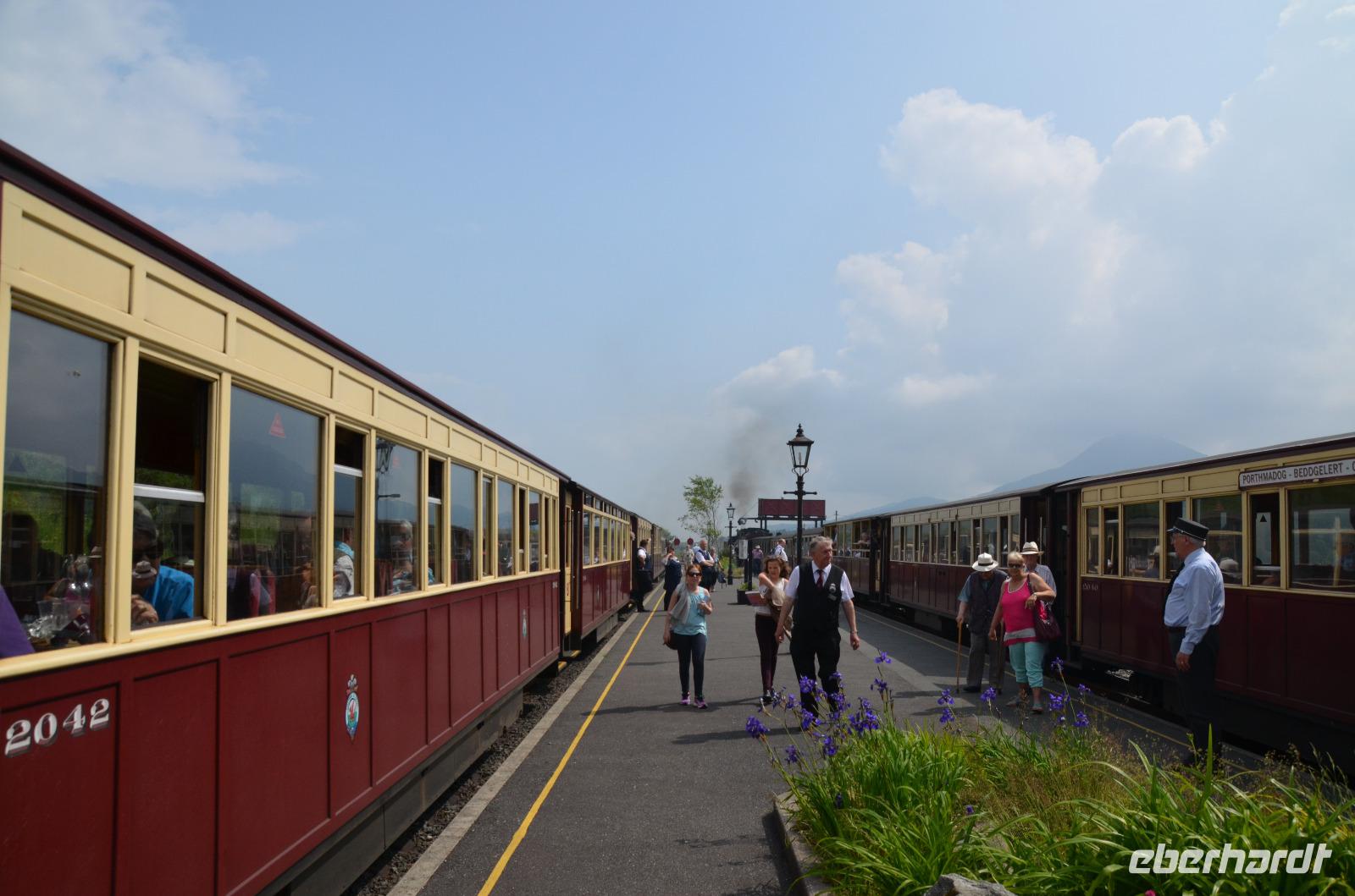 Im reservierten Wagen Nr. 2047, und dem Nachbarwagon finden alle Platz. Wir fahren über Bedgellert bis Caernarfon, der Stadt mit der Wohnburg Edward I. Eine wunderschöne Fahrt voller romantischer Film- und Fotomöglichkeiten, die wir am Ankunftsbahnhof auch noch einmal auskosten. Über die landschaftlich reizvolle Küstenstraße setzen wir dann unsere Reise mit dem Bus bis Conwy fort.