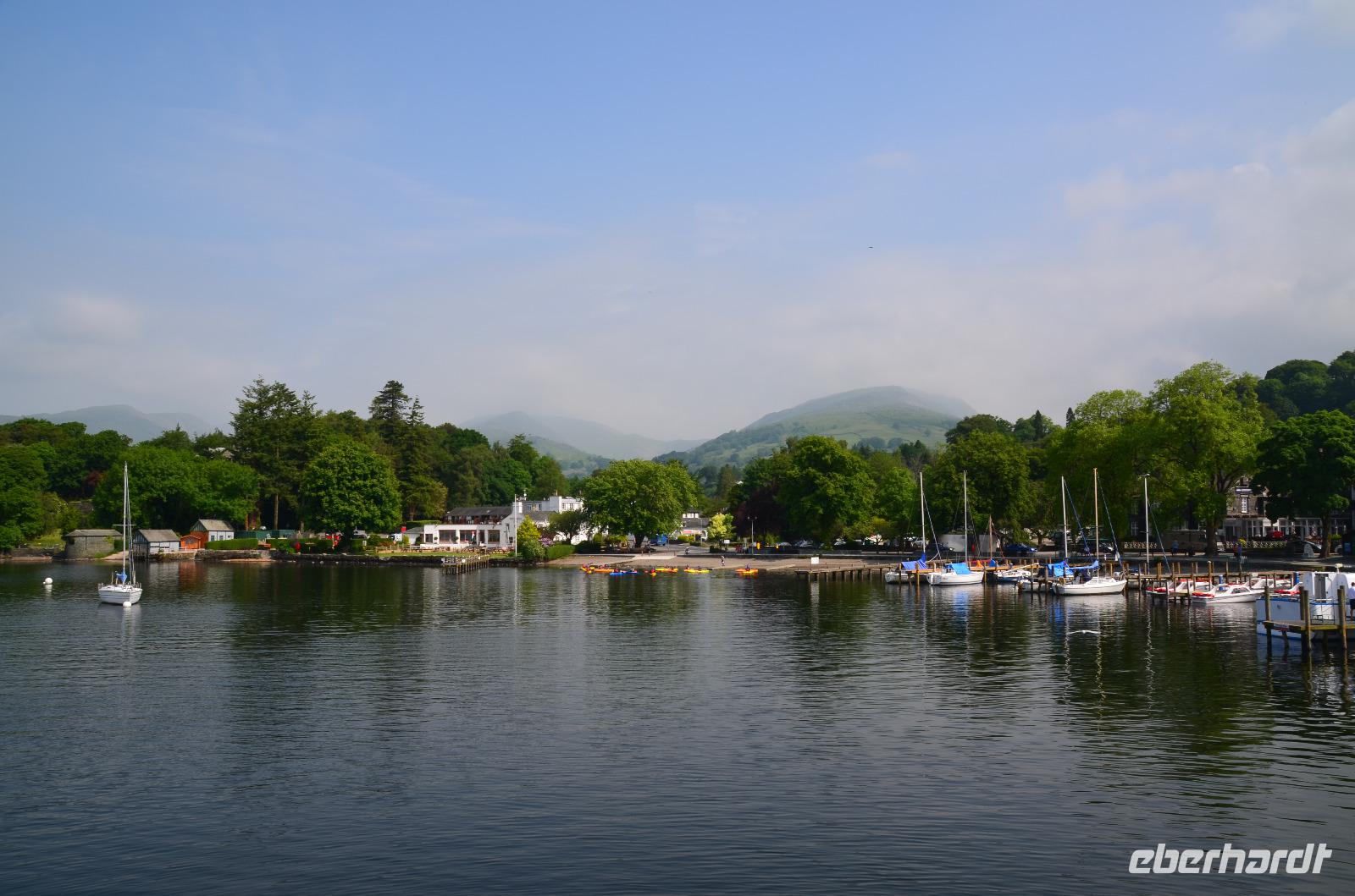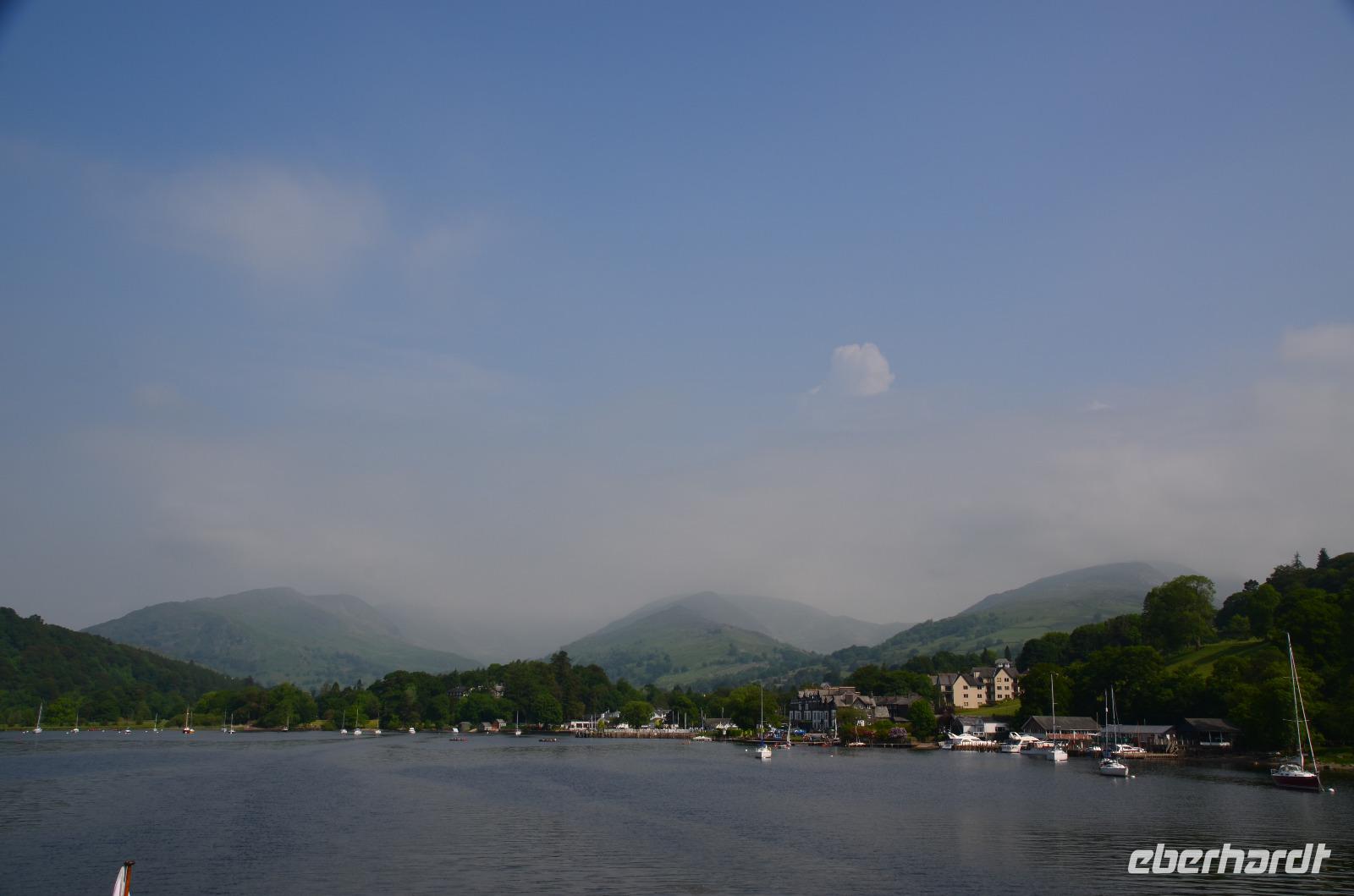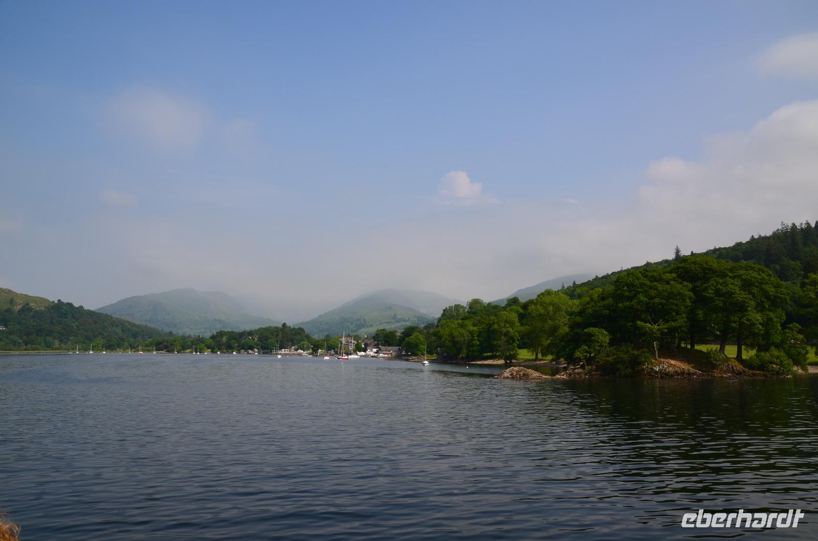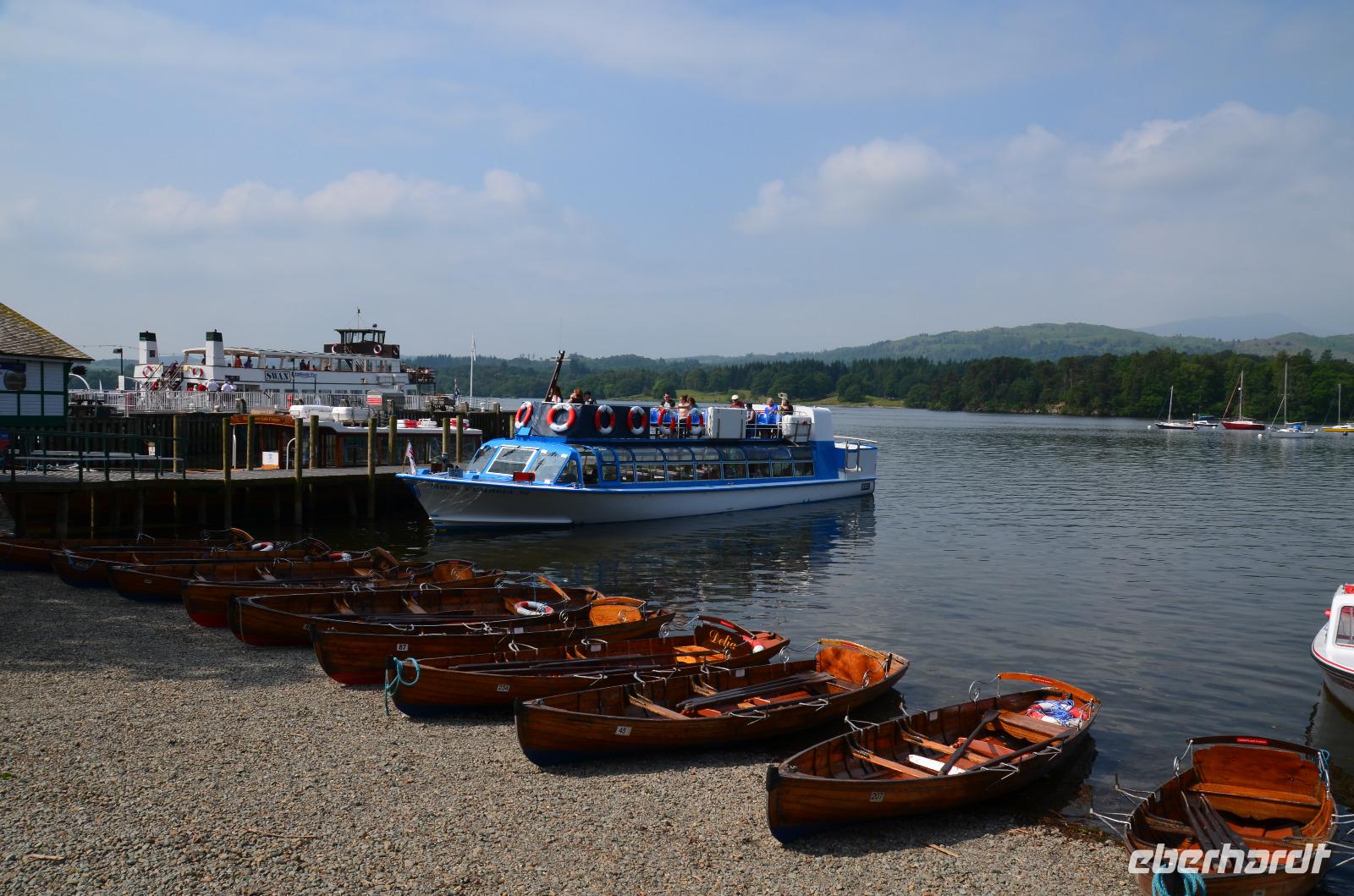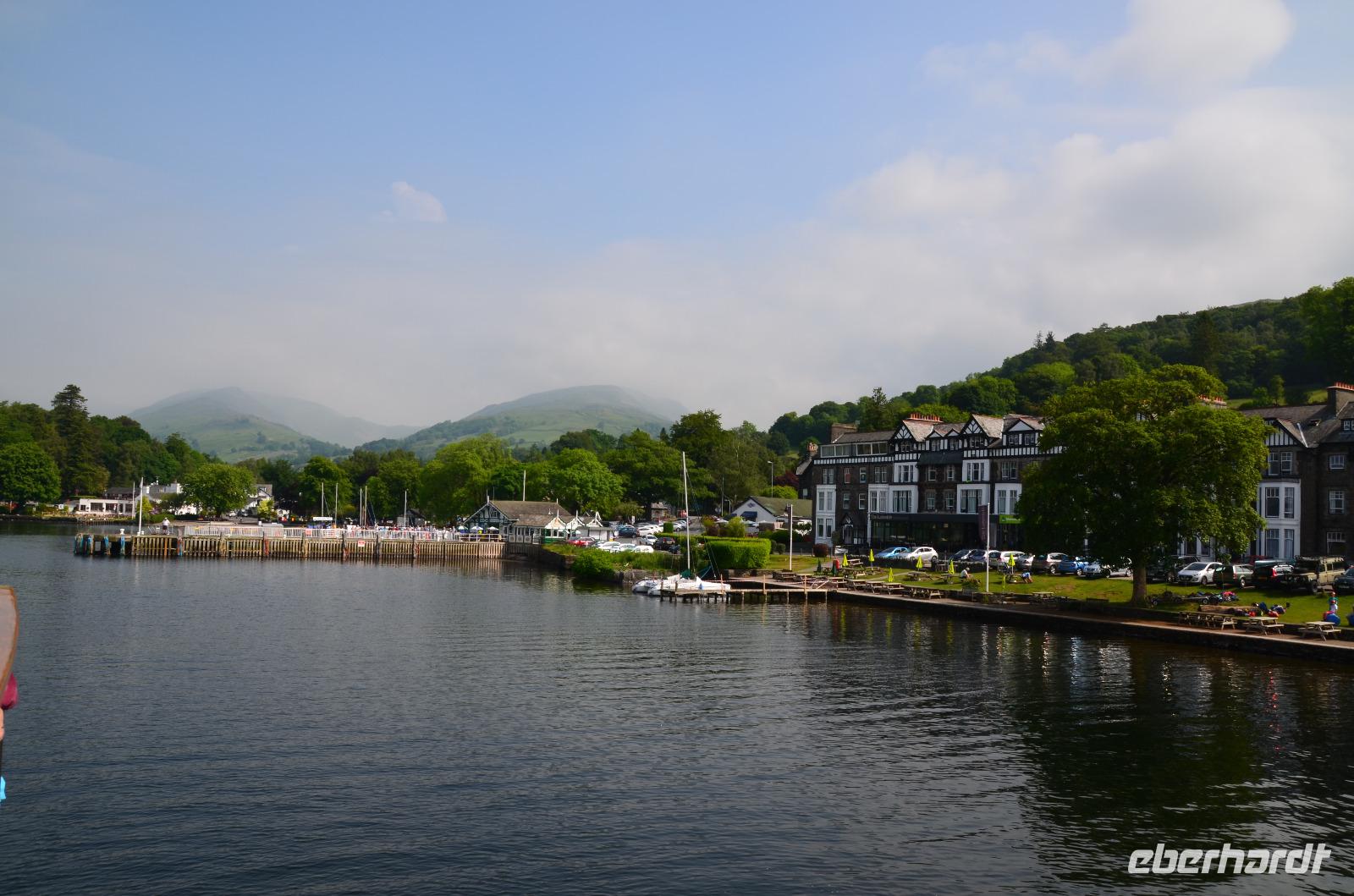 Weiter nach Norden, zum Lake District setzen wir unsere Rundreise fort. In Bowness on Windermere halten wir am Schiffsanleger der Lake Cruises und steigen auf unser Ausflugsschiff, mit dem wir gemächlich über den Lake Windermere schippern - von Bowness bis Ambleside. Hier scheint dann auch wieder die Sonne und auch der höchste Berg Englands, der Scafell Pike (978 m) lugt etwas aus den Wolken.