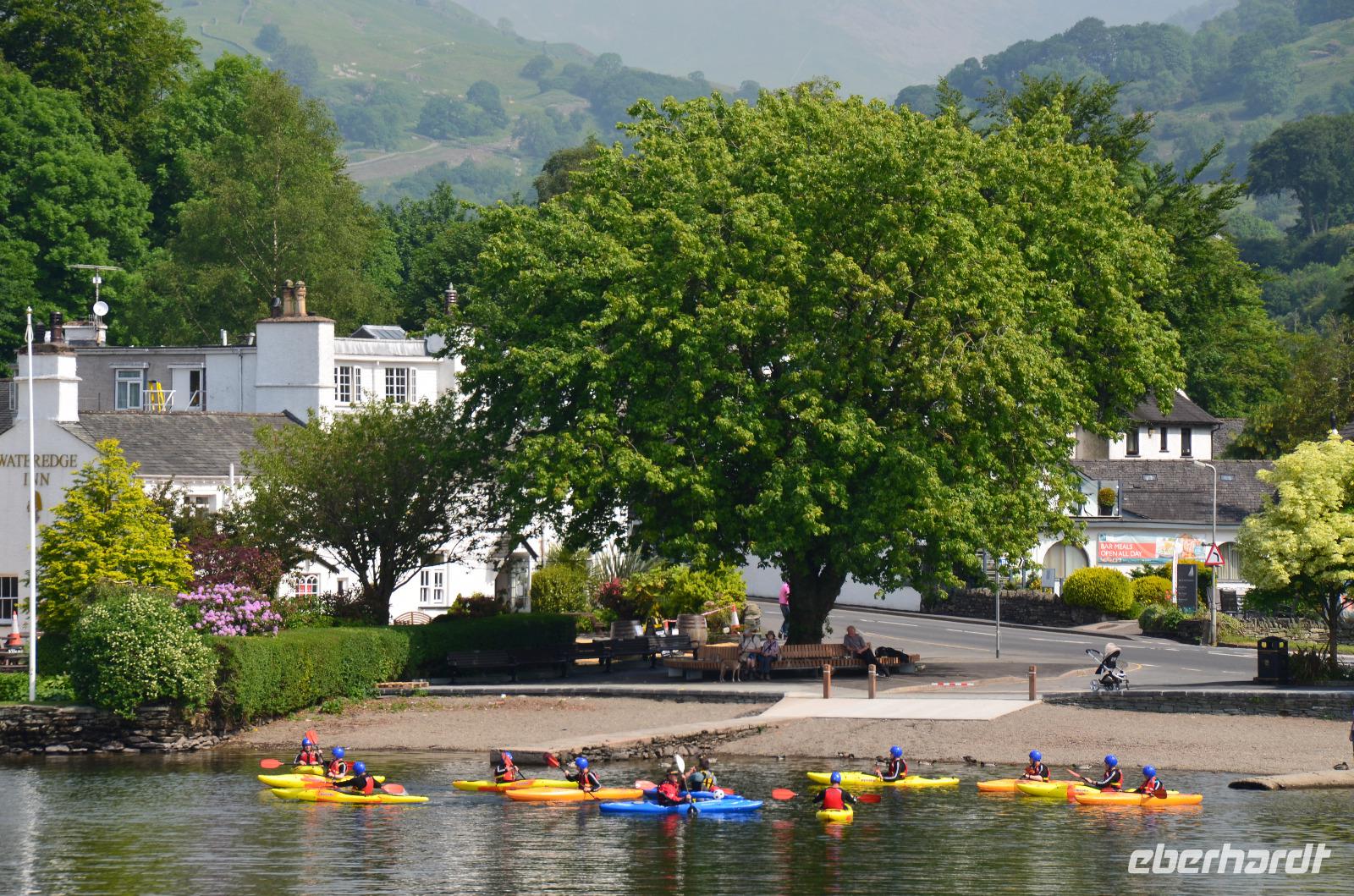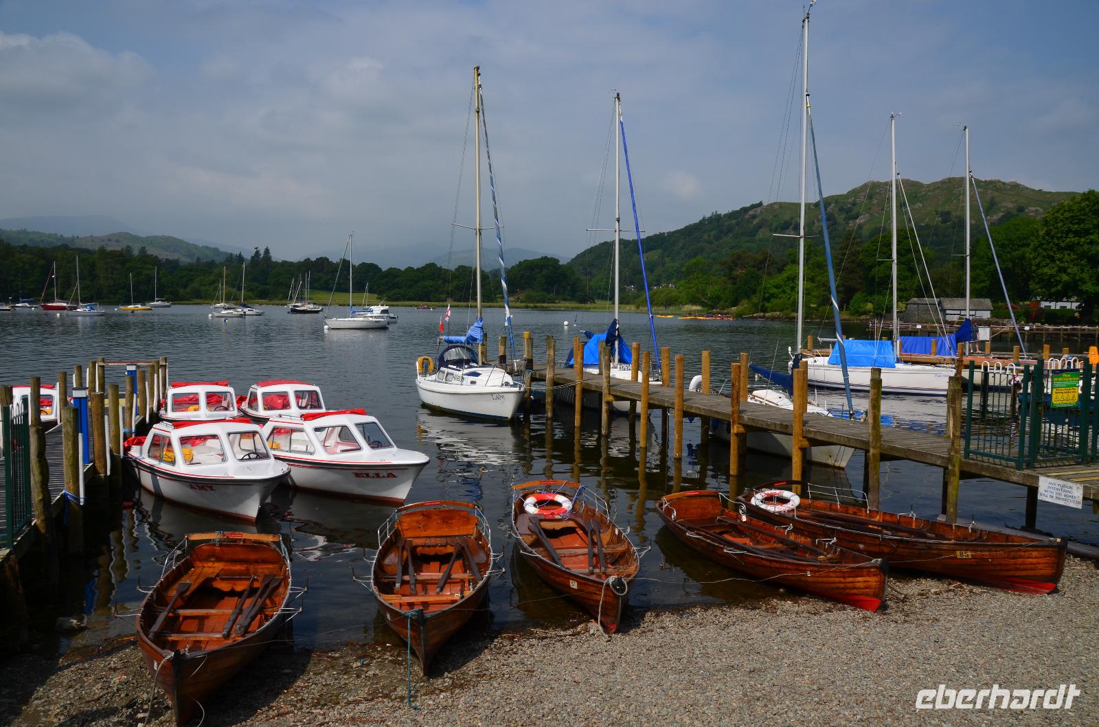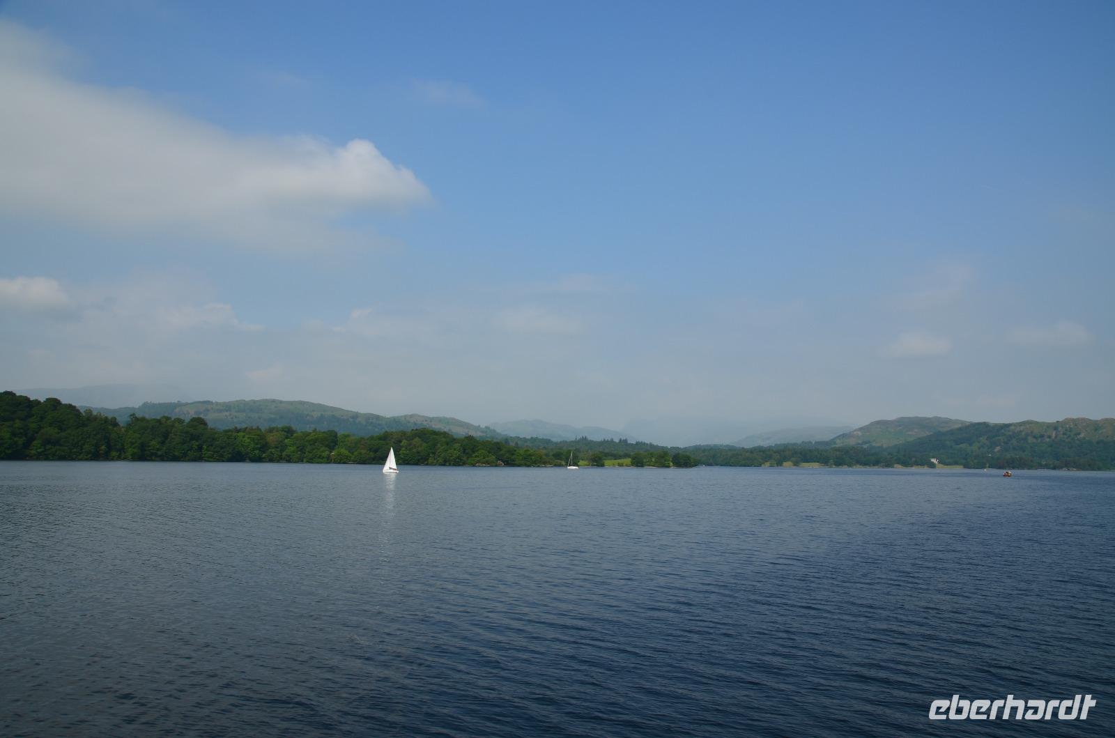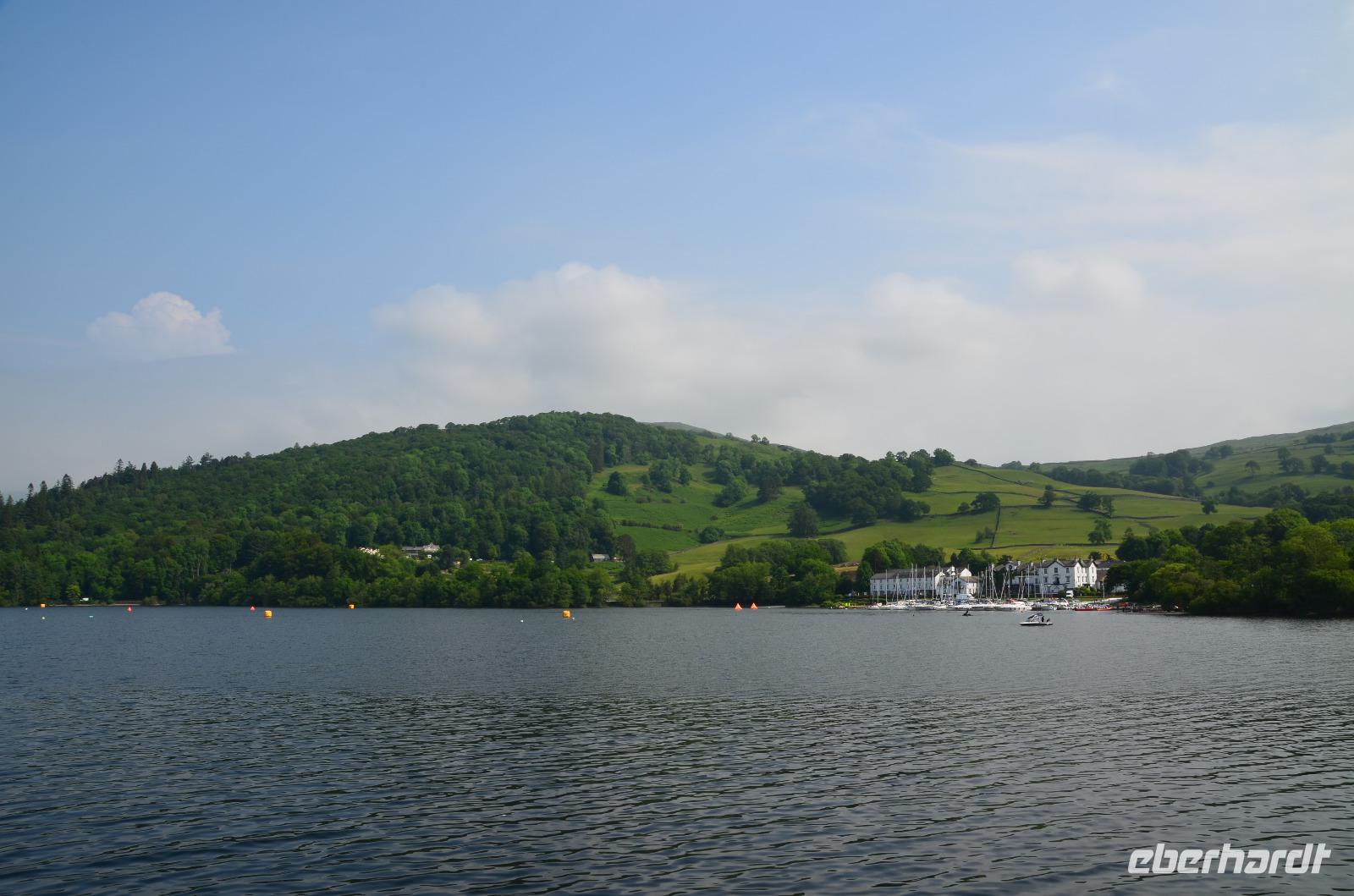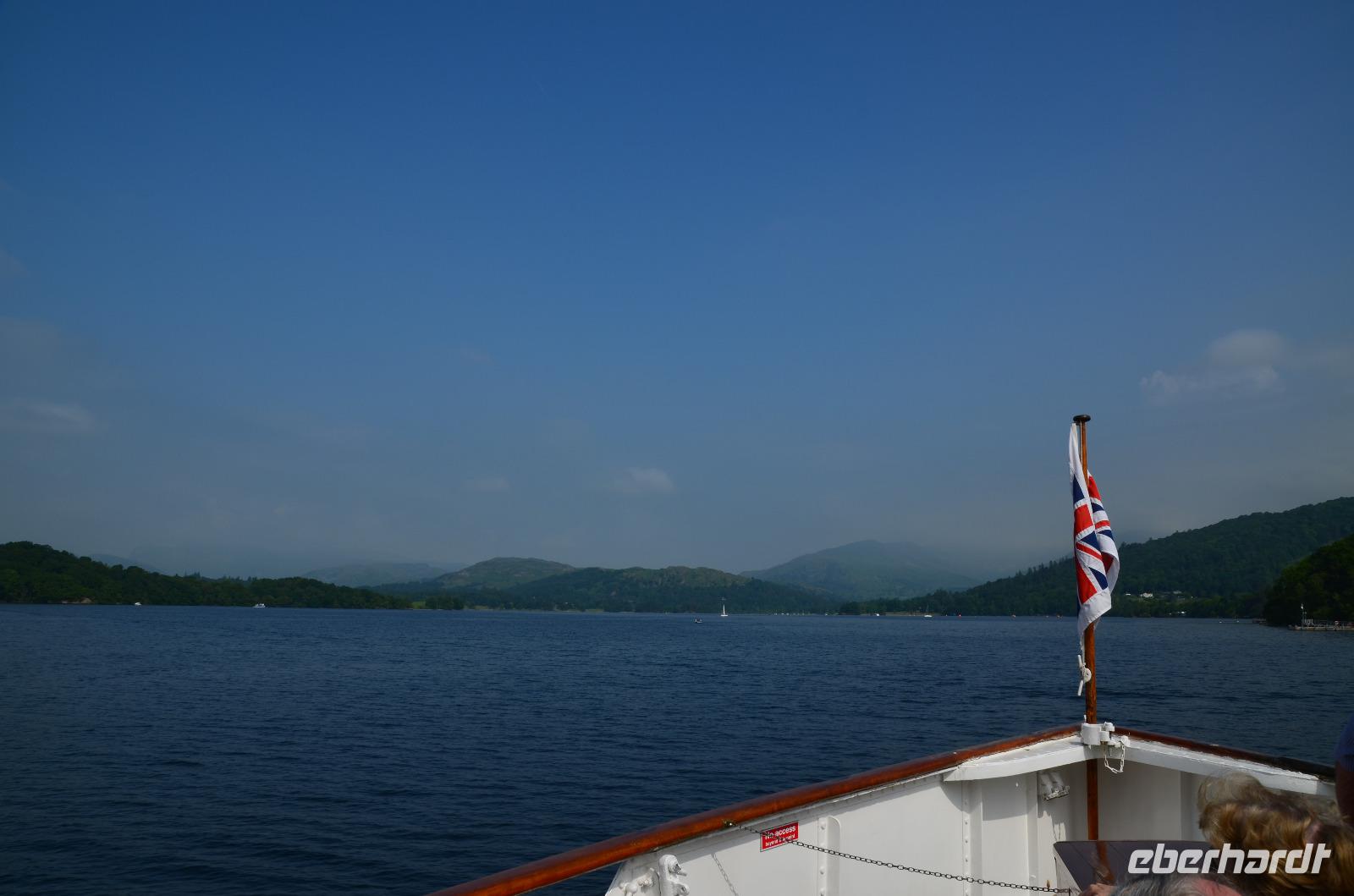 Weiter nach Norden, zum Lake District setzen wir unsere Rundreise fort. In Bowness on Windermere halten wir am Schiffsanleger der Lake Cruises und steigen auf unser Ausflugsschiff, mit dem wir gemächlich über den Lake Windermere schippern - von Bowness bis Ambleside. Hier scheint dann auch wieder die Sonne und auch der höchste Berg Englands, der Scafell Pike (978 m) lugt etwas aus den Wolken.