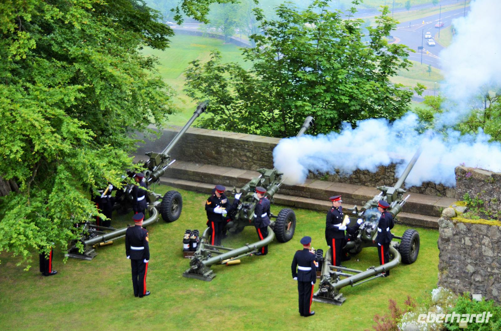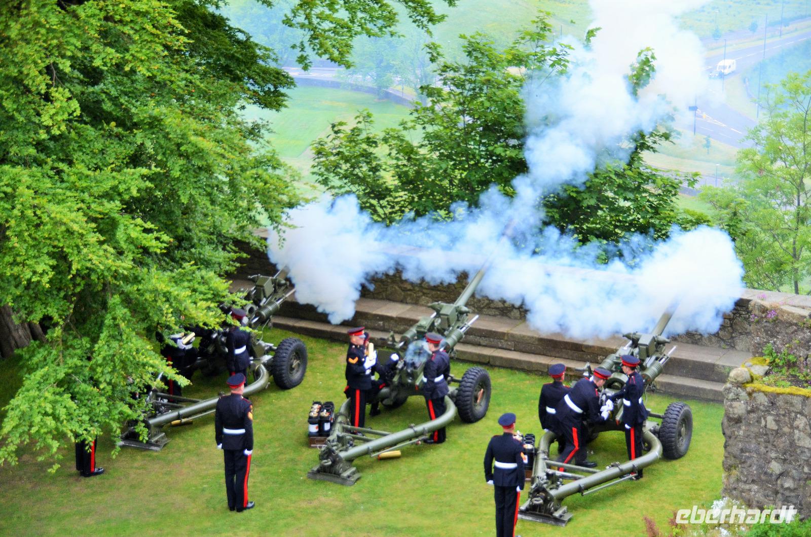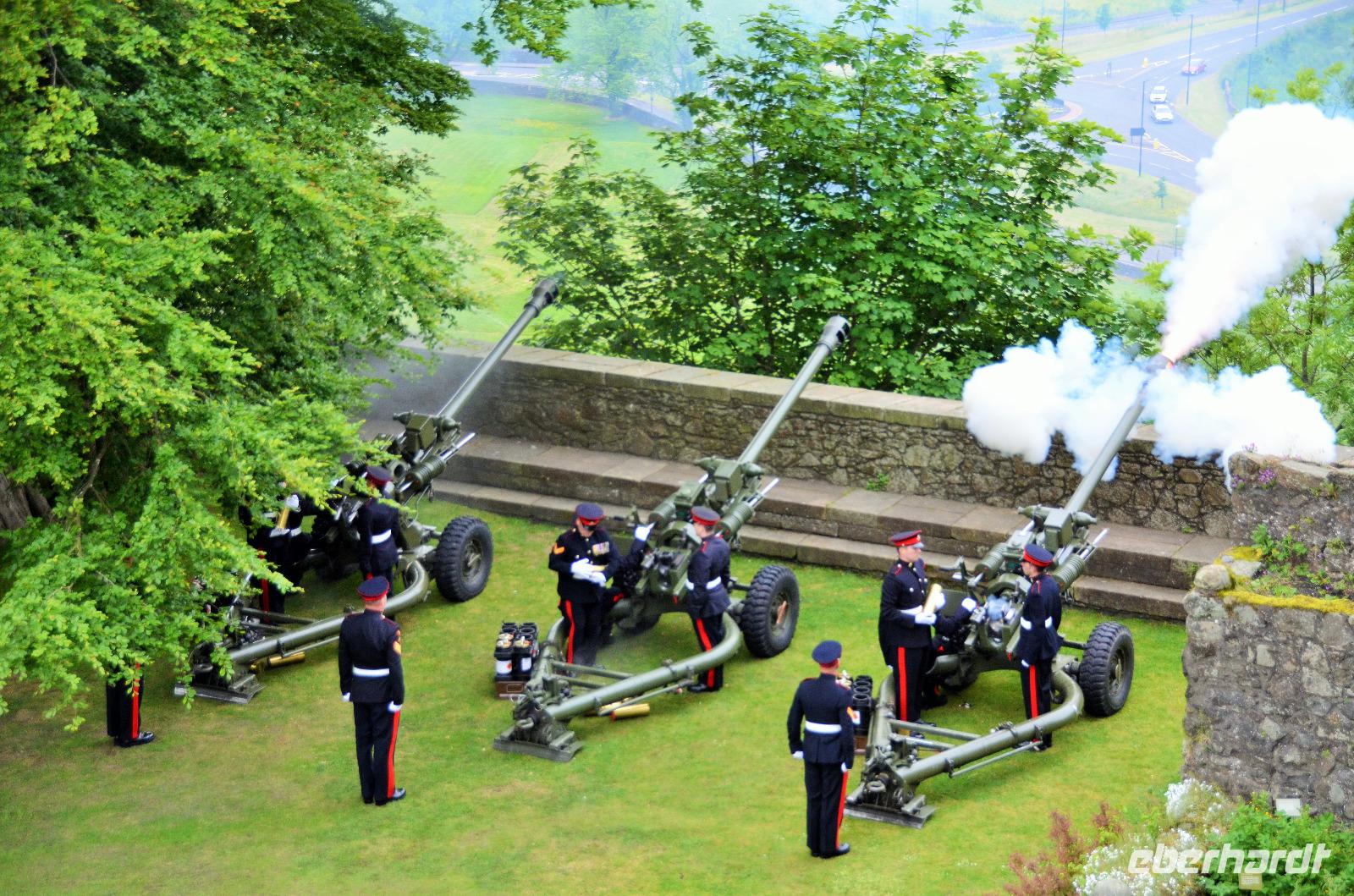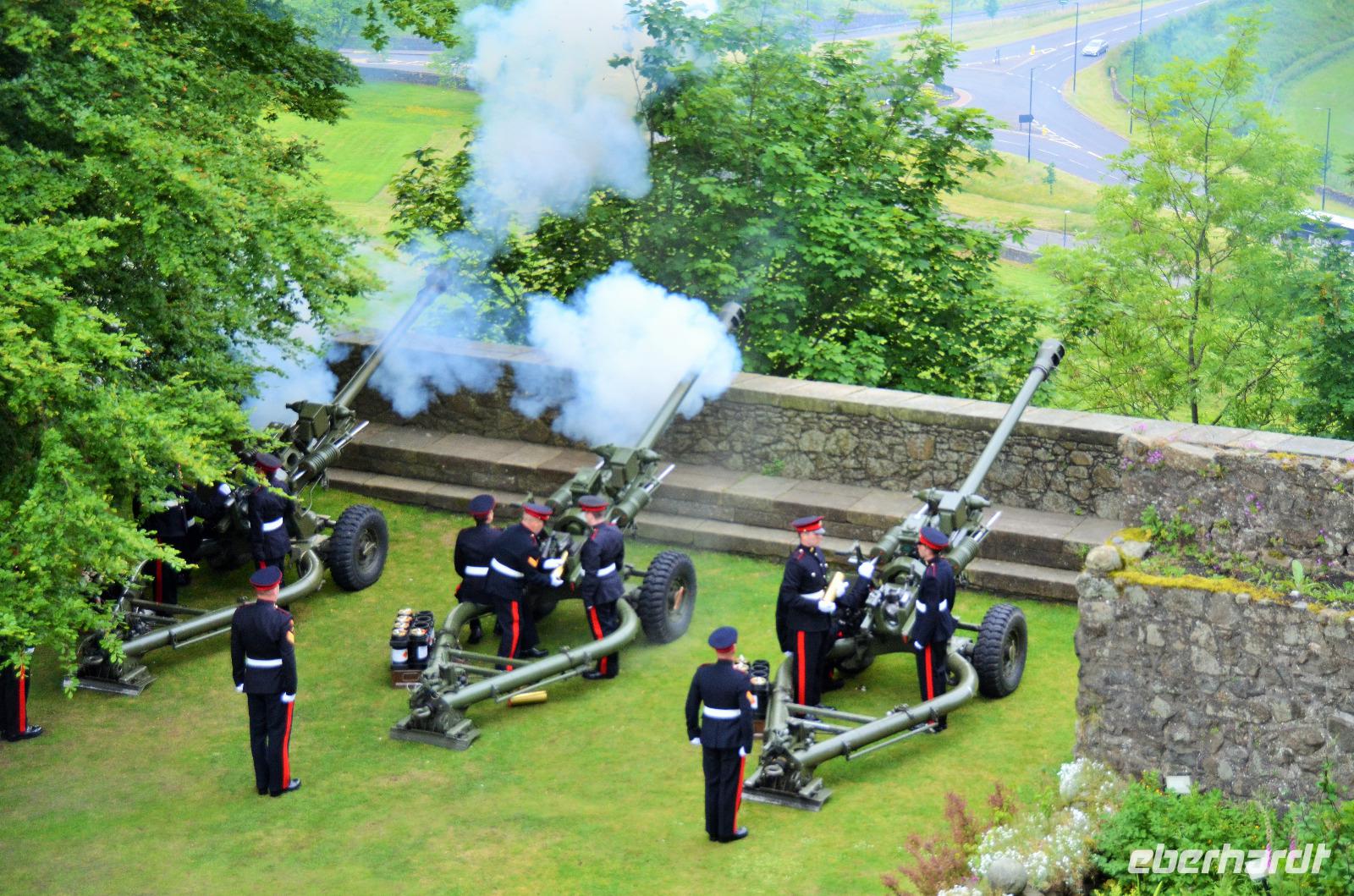 Den Abschluss unseres Besuchs auf der Burg bildet ein Ehrensalut von 21 Schuss aus drei Kanonen der Army anlässlich des Tronjubileums der Queen.