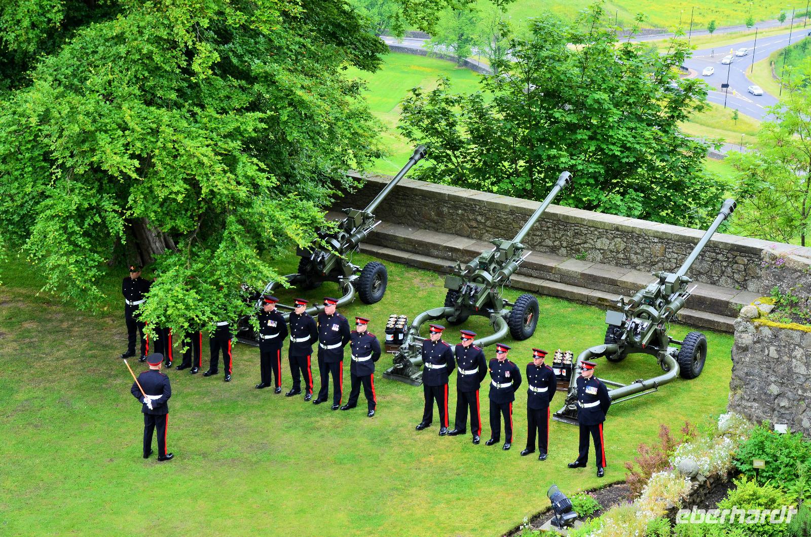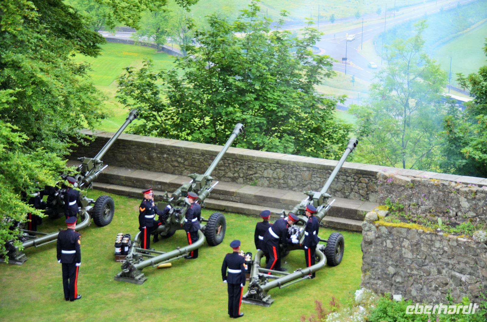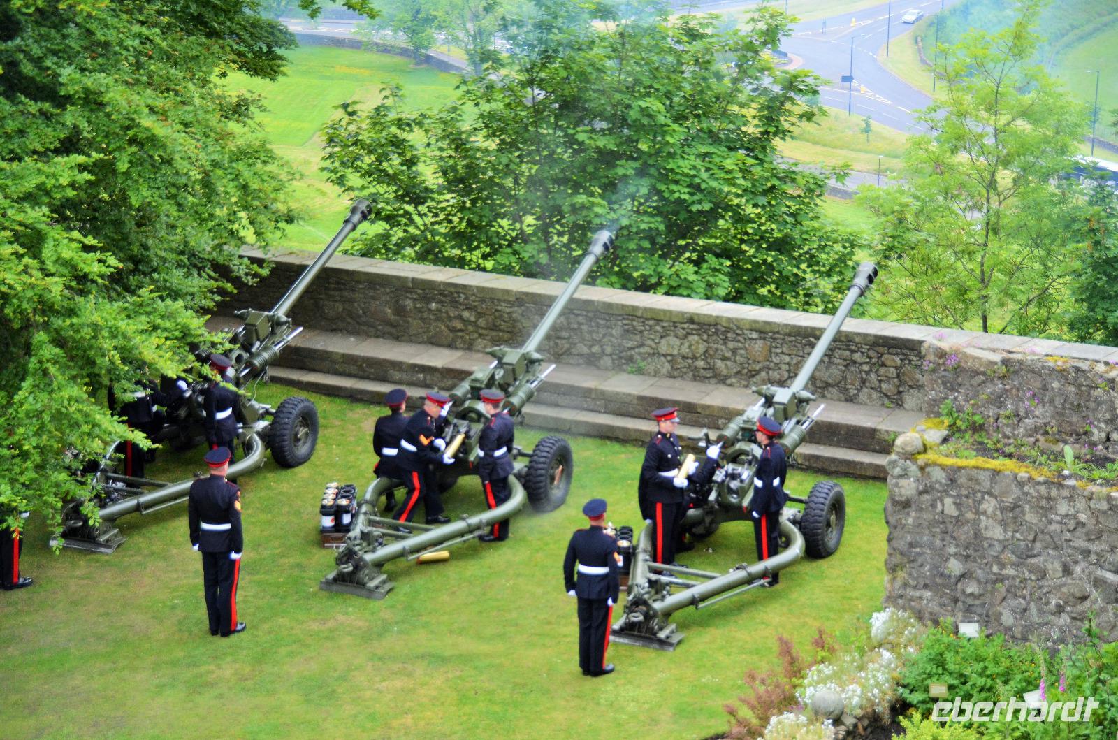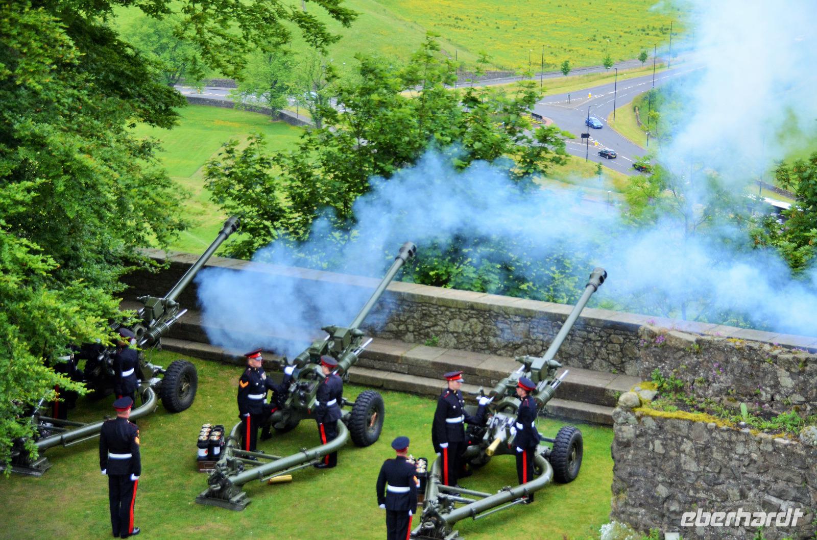 Den Abschluss unseres Besuchs auf der Burg bildet ein Ehrensalut von 21 Schuss aus drei Kanonen der Army anlässlich des Tronjubileums der Queen.