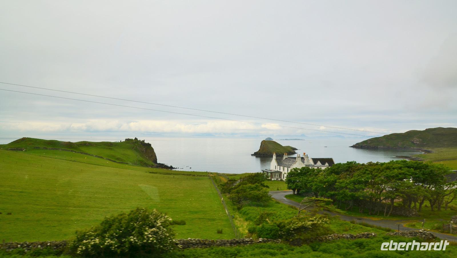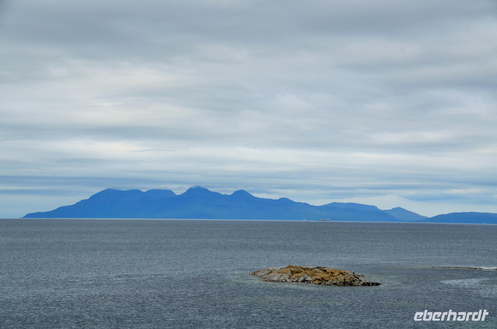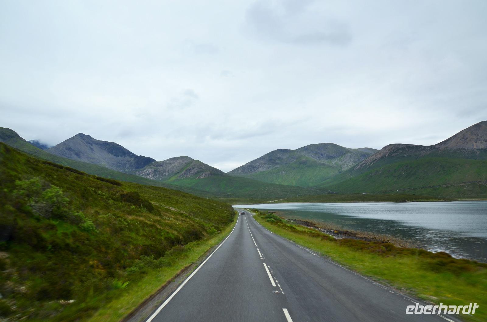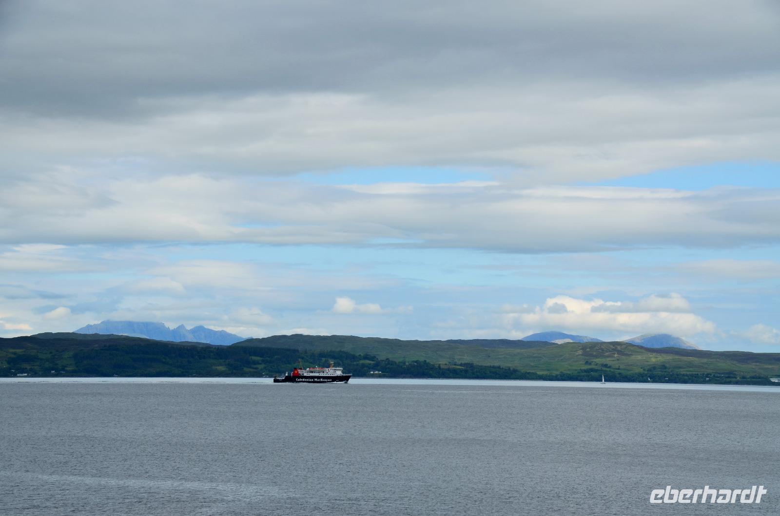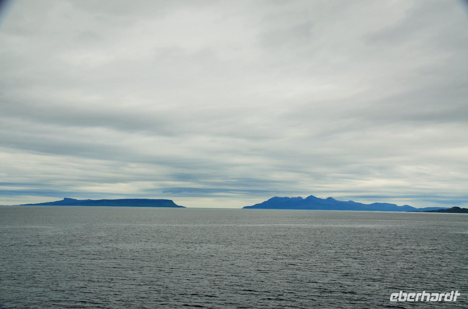 Schließlich erreichen wir die hüglige, von der letzten Eiszeit geformte Küstenlandschaft um Mallaig. An Europas größtem Krabbenumschlagplatz nehmen wir die Fähre hinüber nach Armadale/Advasar - auf die Insel Skye. Die Wolkeninsel präsentiert sich uns wolkenlos im Sonnenschein und entfaltet ihre ganze Schönheit, ebenso die benachbarten Hebrideninseln Rum und Eigg.