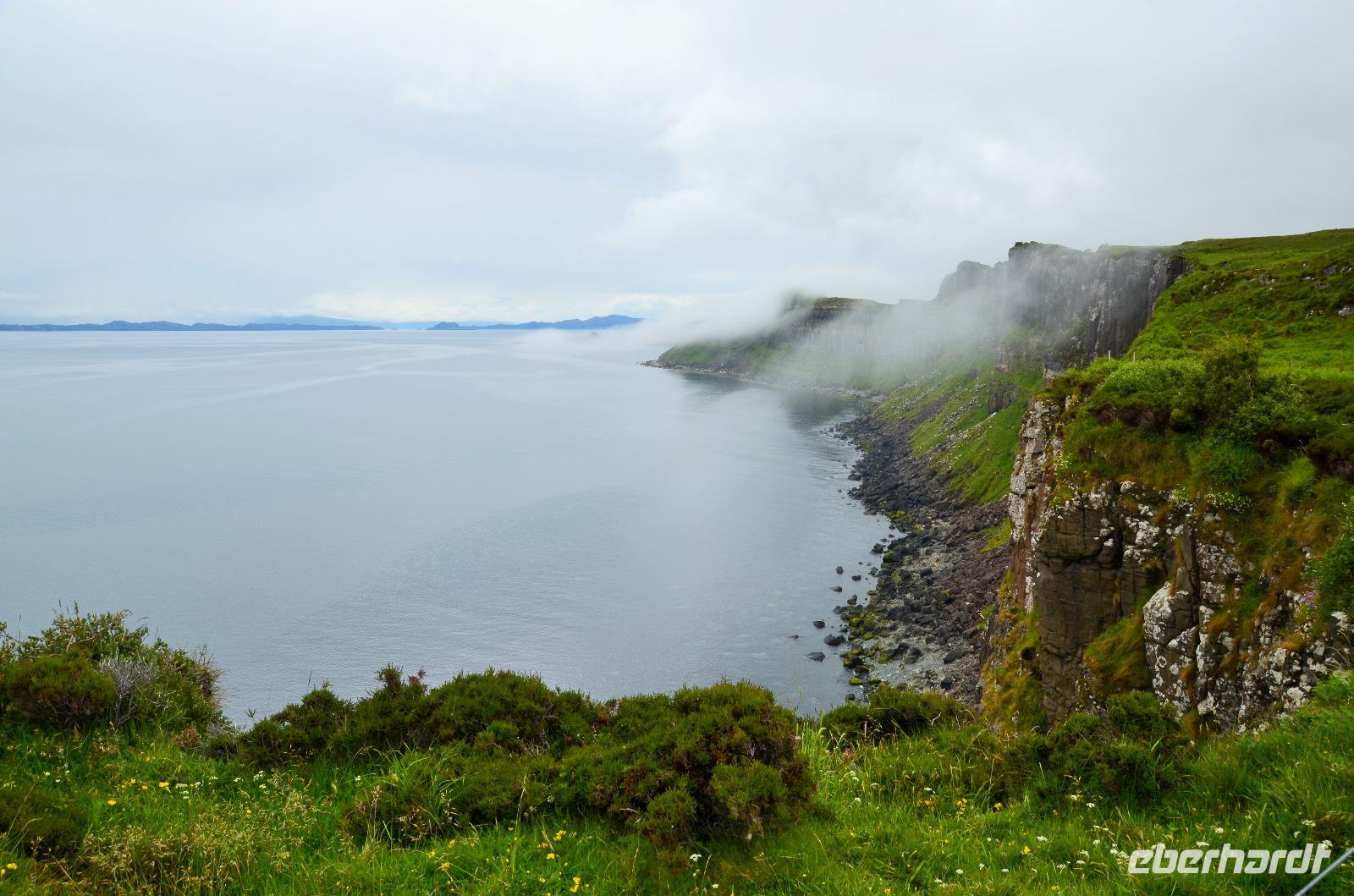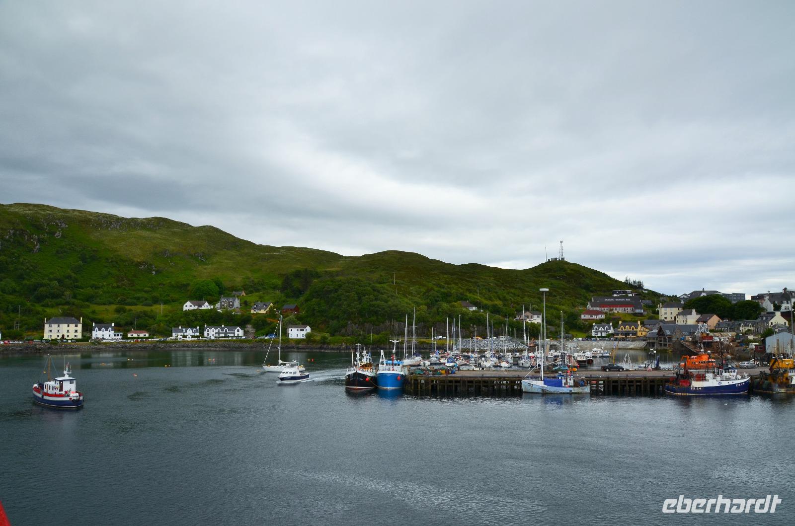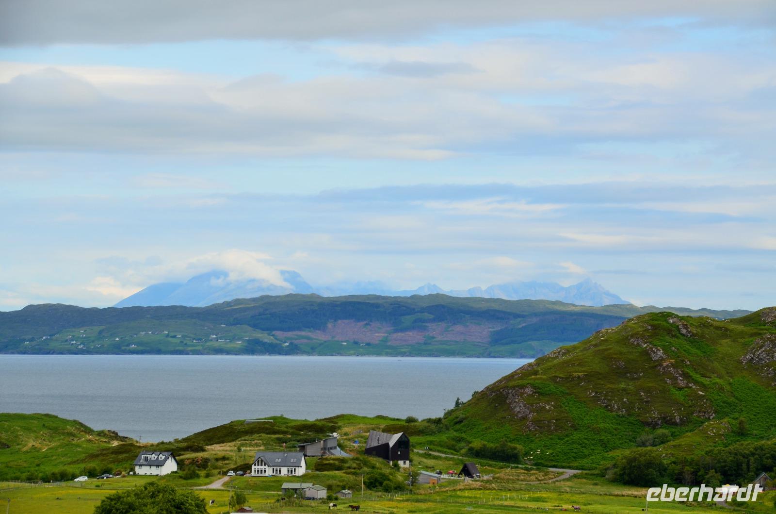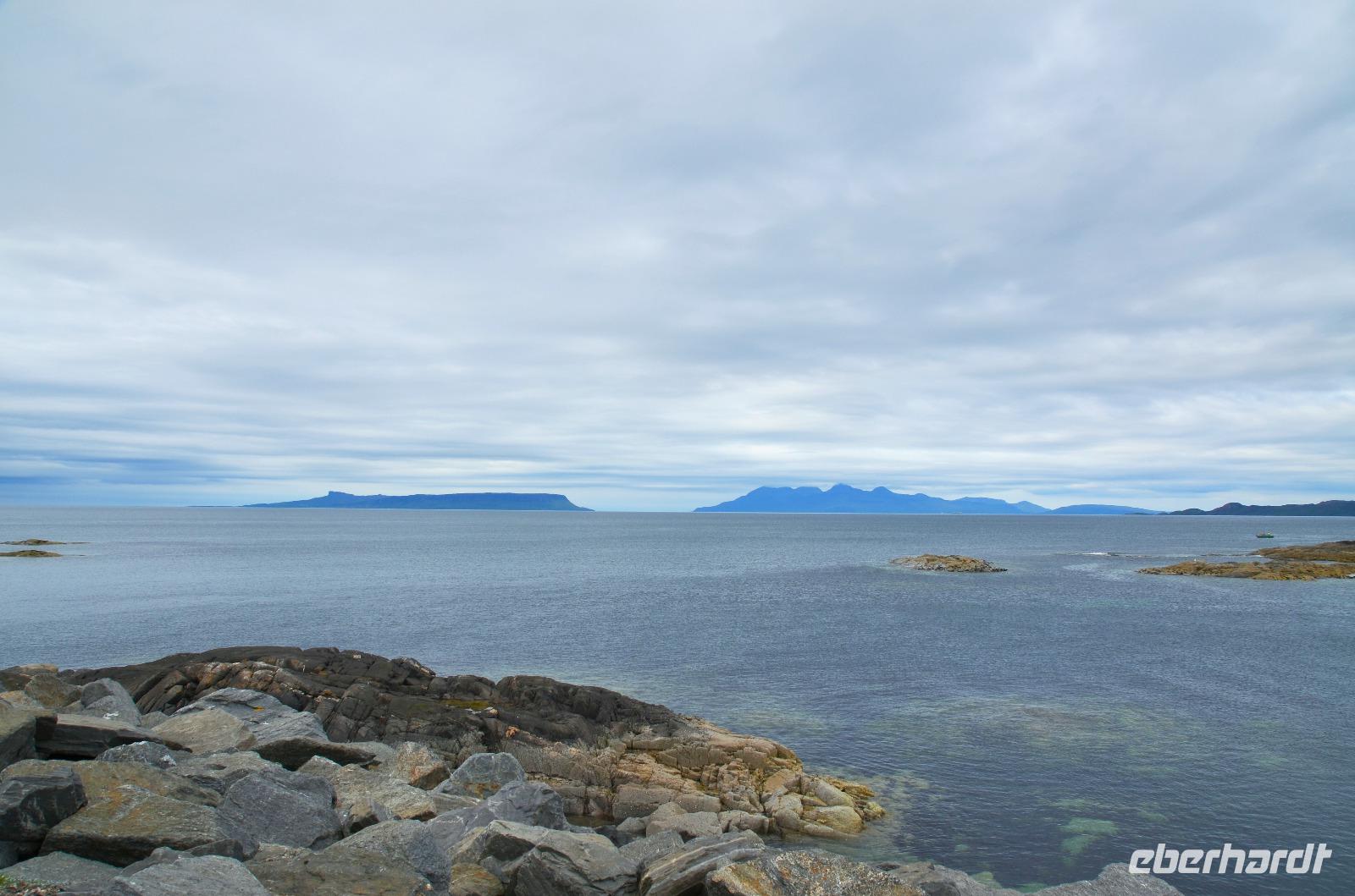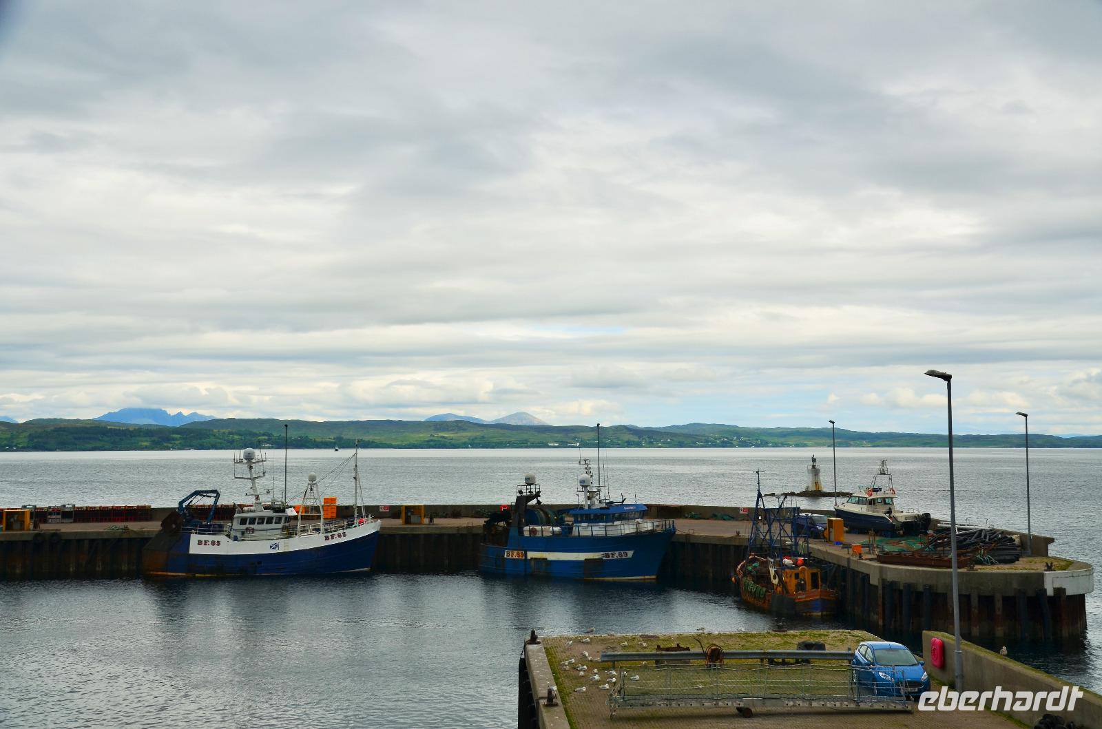 Schließlich erreichen wir die hüglige, von der letzten Eiszeit geformte Küstenlandschaft um Mallaig. An Europas größtem Krabbenumschlagplatz nehmen wir die Fähre hinüber nach Armadale/Advasar - auf die Insel Skye. Die Wolkeninsel präsentiert sich uns wolkenlos im Sonnenschein und entfaltet ihre ganze Schönheit, ebenso die benachbarten Hebrideninseln Rum und Eigg.