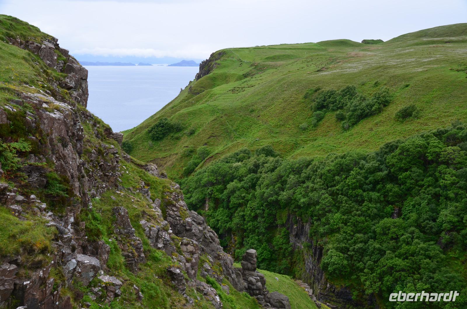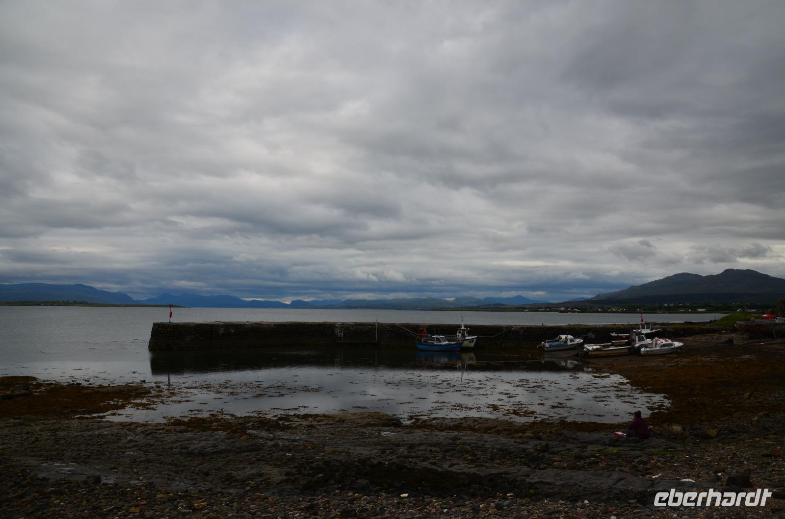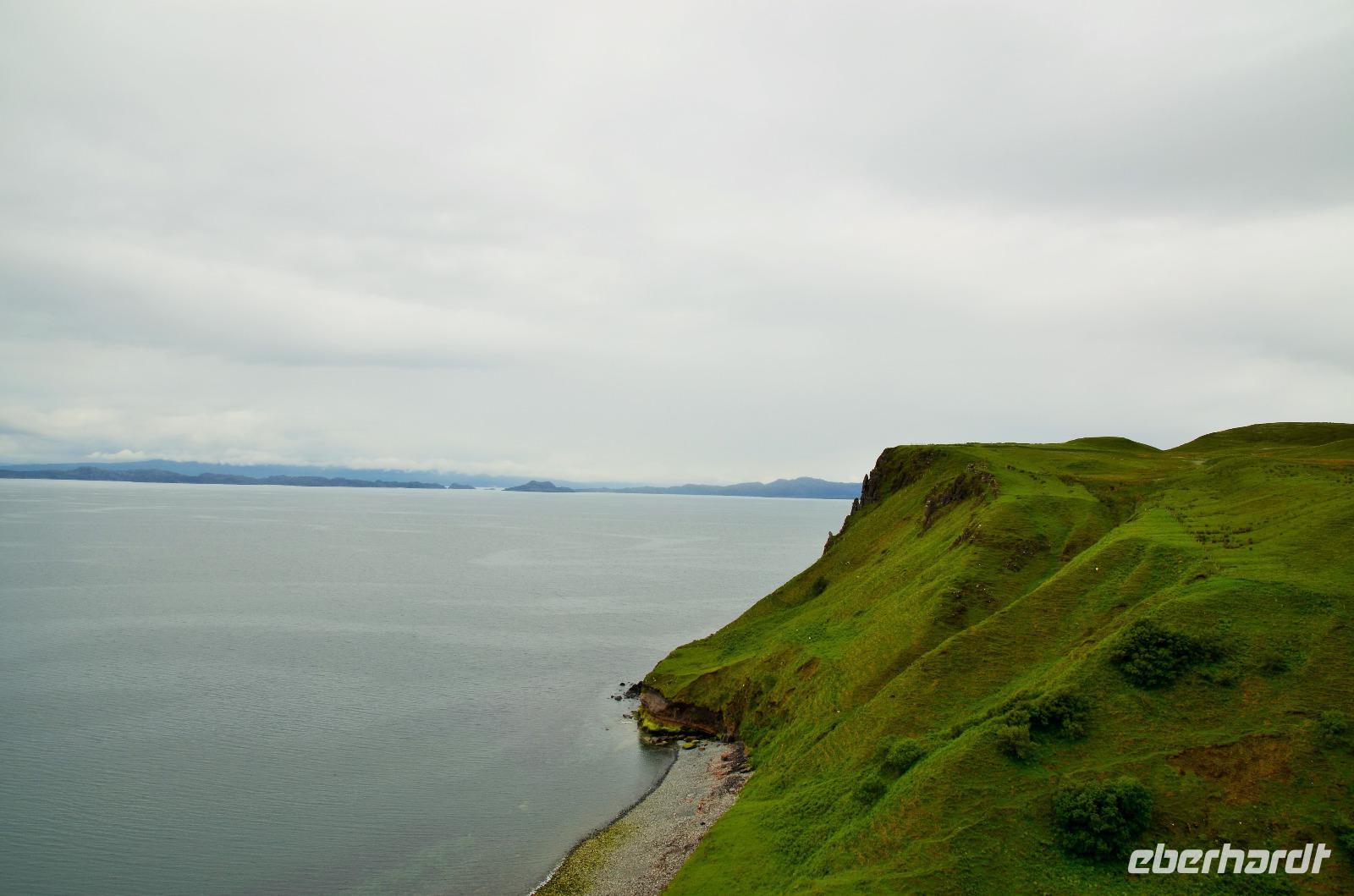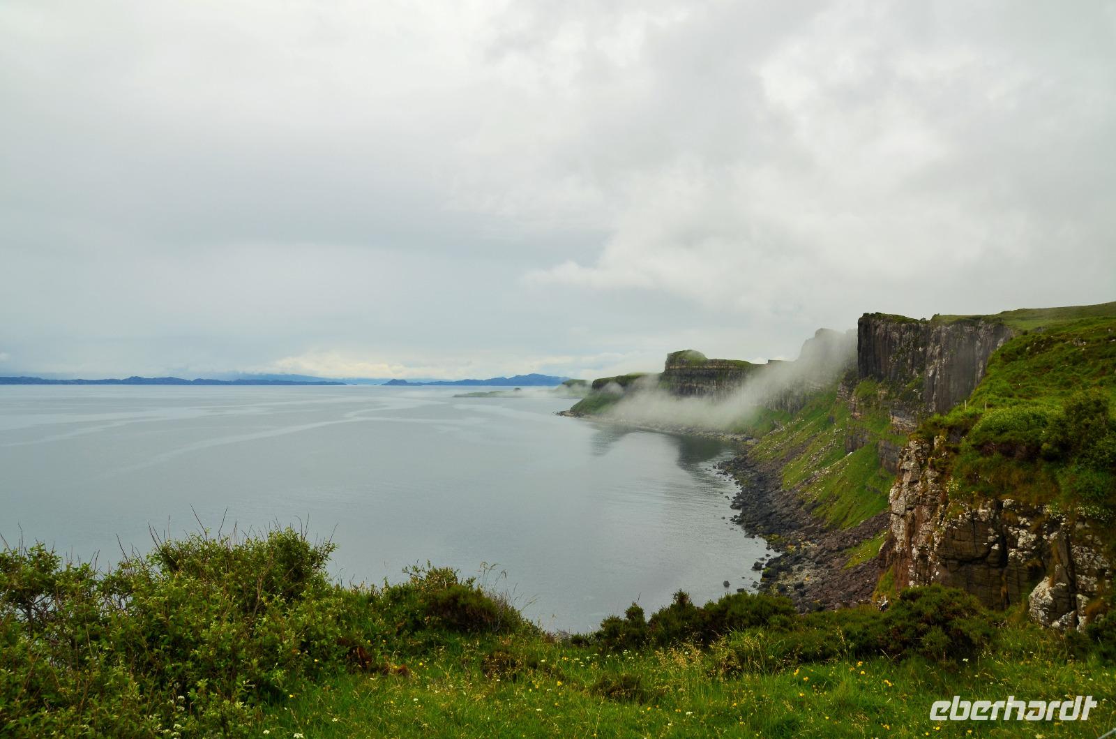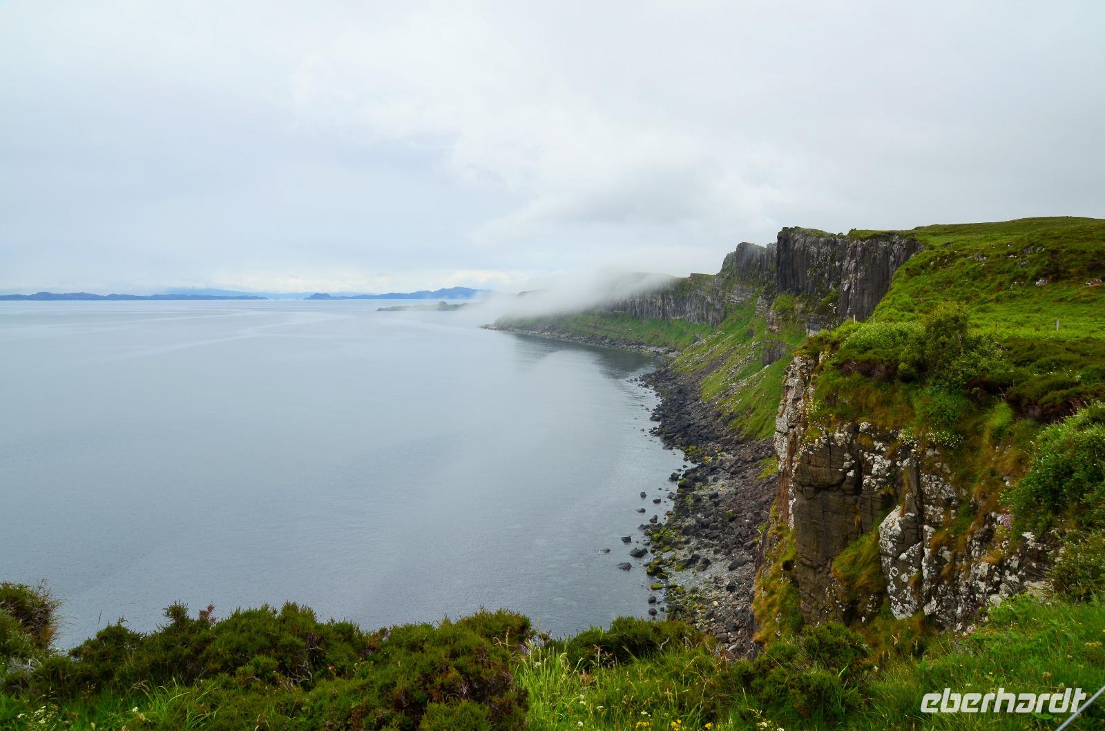 Schließlich erreichen wir die hüglige, von der letzten Eiszeit geformte Küstenlandschaft um Mallaig. An Europas größtem Krabbenumschlagplatz nehmen wir die Fähre hinüber nach Armadale/Advasar - auf die Insel Skye. Die Wolkeninsel präsentiert sich uns wolkenlos im Sonnenschein und entfaltet ihre ganze Schönheit, ebenso die benachbarten Hebrideninseln Rum und Eigg.