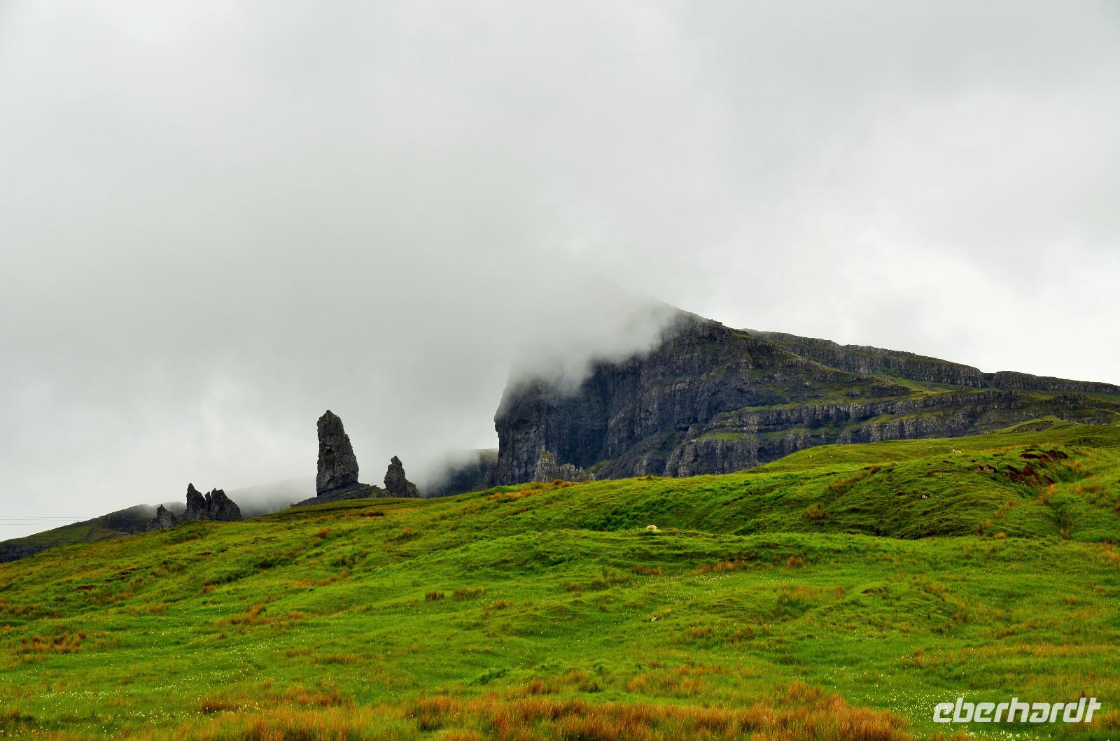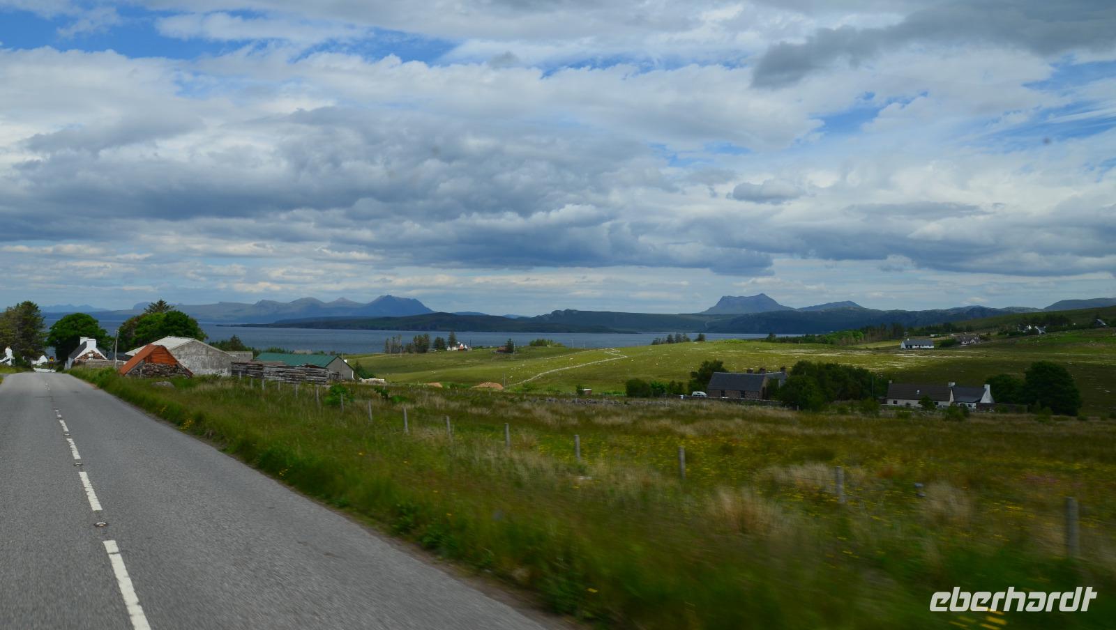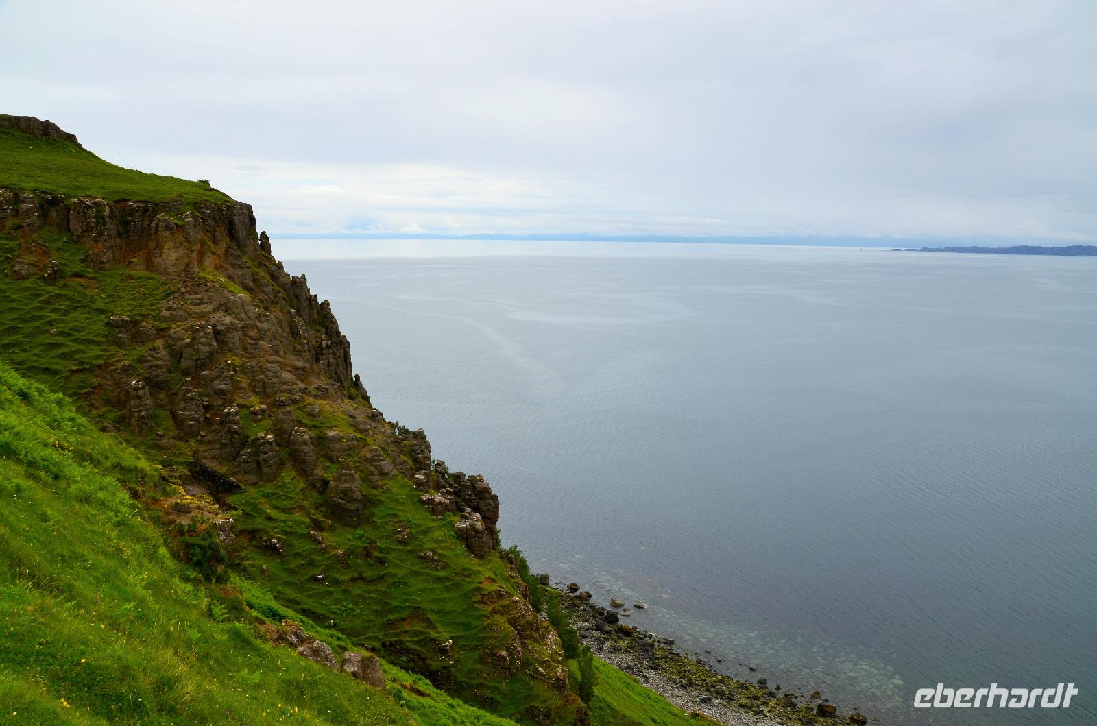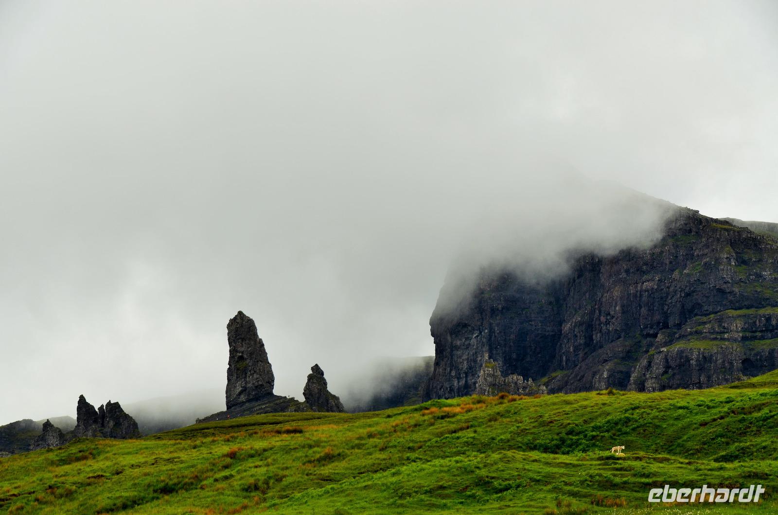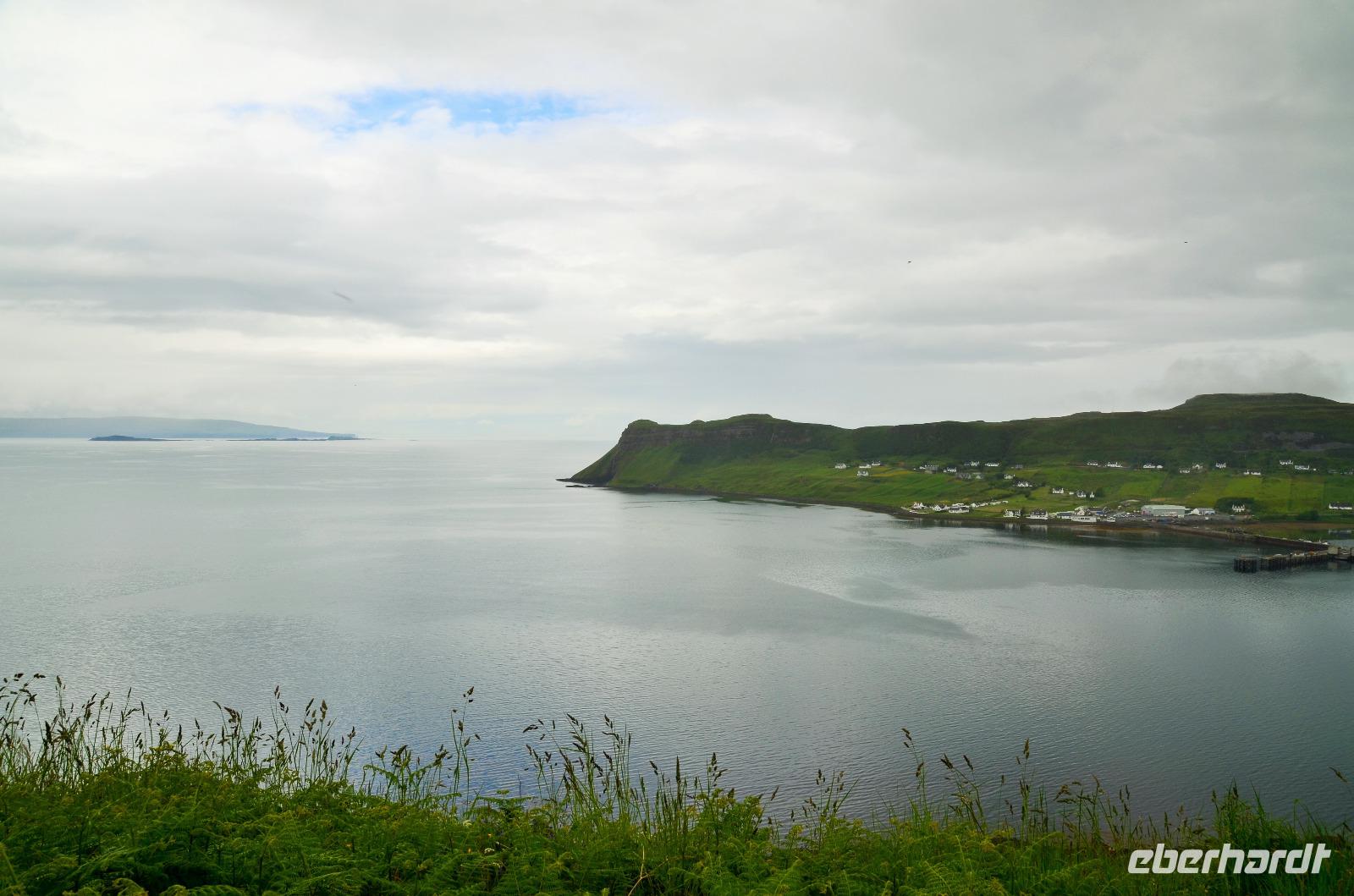 Schließlich erreichen wir die hüglige, von der letzten Eiszeit geformte Küstenlandschaft um Mallaig. An Europas größtem Krabbenumschlagplatz nehmen wir die Fähre hinüber nach Armadale/Advasar - auf die Insel Skye. Die Wolkeninsel präsentiert sich uns wolkenlos im Sonnenschein und entfaltet ihre ganze Schönheit, ebenso die benachbarten Hebrideninseln Rum und Eigg.