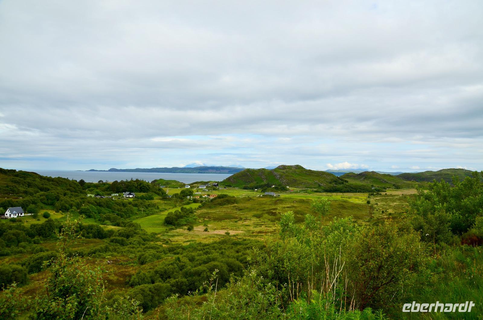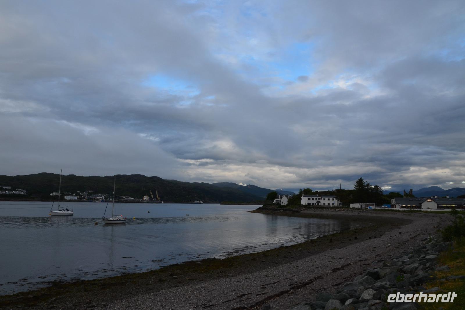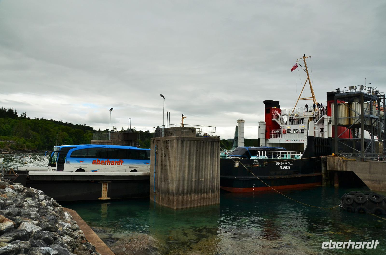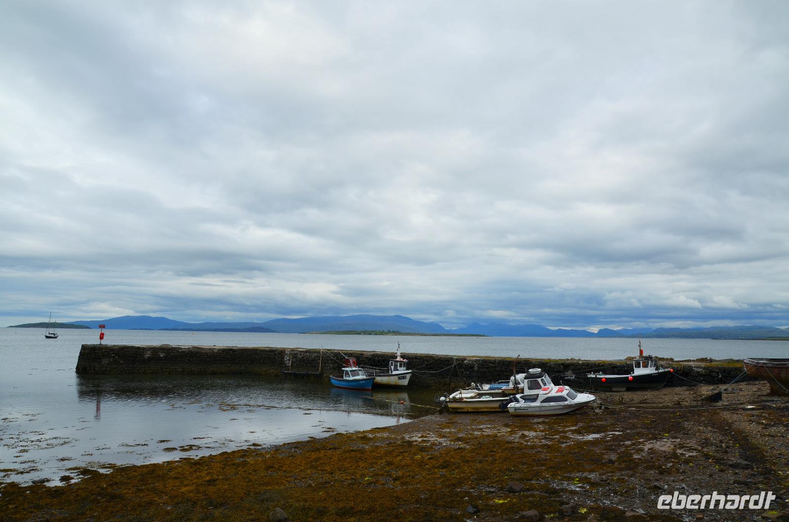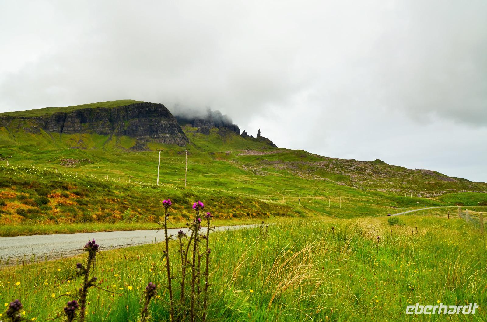 Schließlich erreichen wir die hüglige, von der letzten Eiszeit geformte Küstenlandschaft um Mallaig. An Europas größtem Krabbenumschlagplatz nehmen wir die Fähre hinüber nach Armadale/Advasar - auf die Insel Skye. Die Wolkeninsel präsentiert sich uns wolkenlos im Sonnenschein und entfaltet ihre ganze Schönheit, ebenso die benachbarten Hebrideninseln Rum und Eigg.