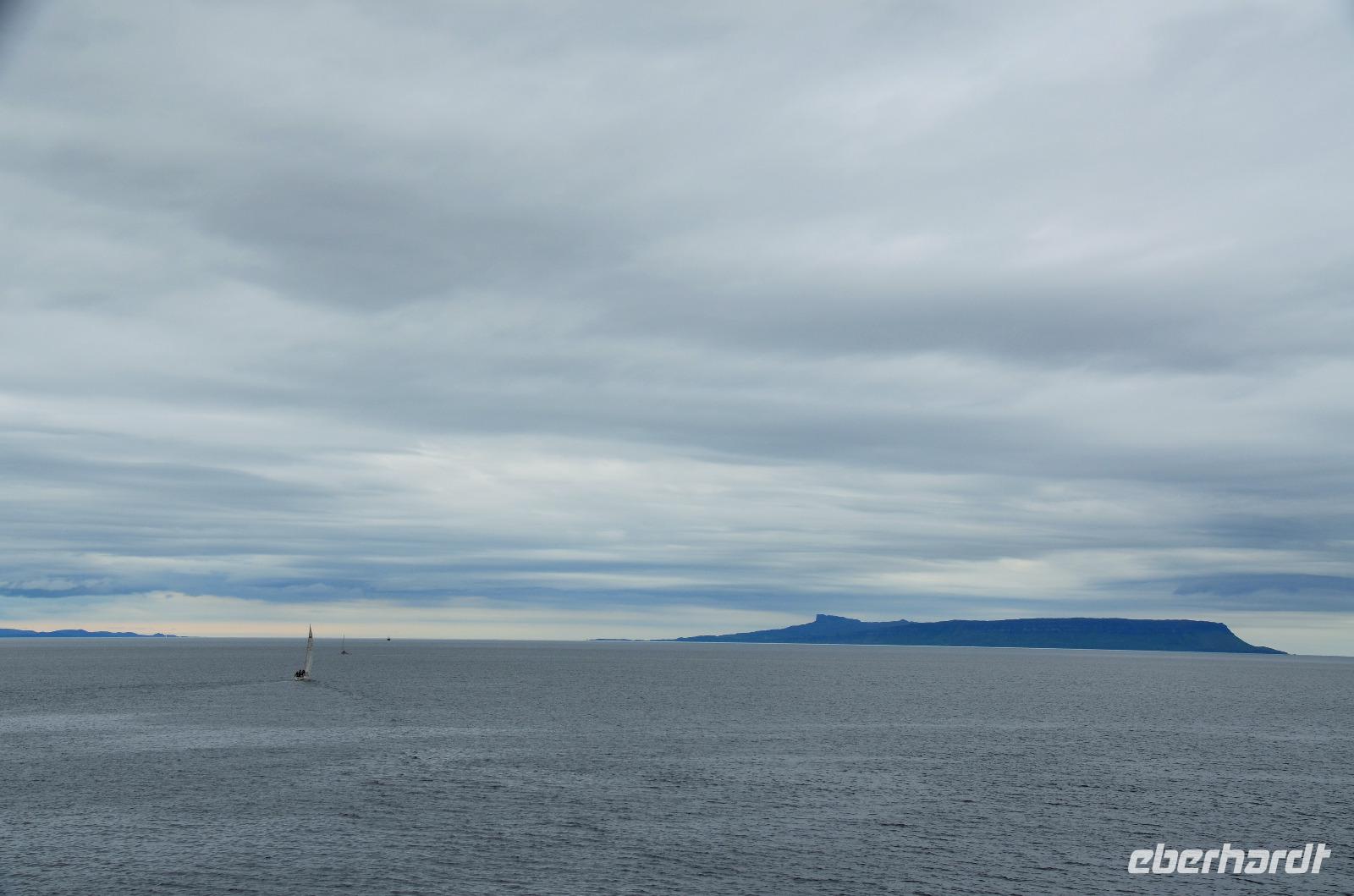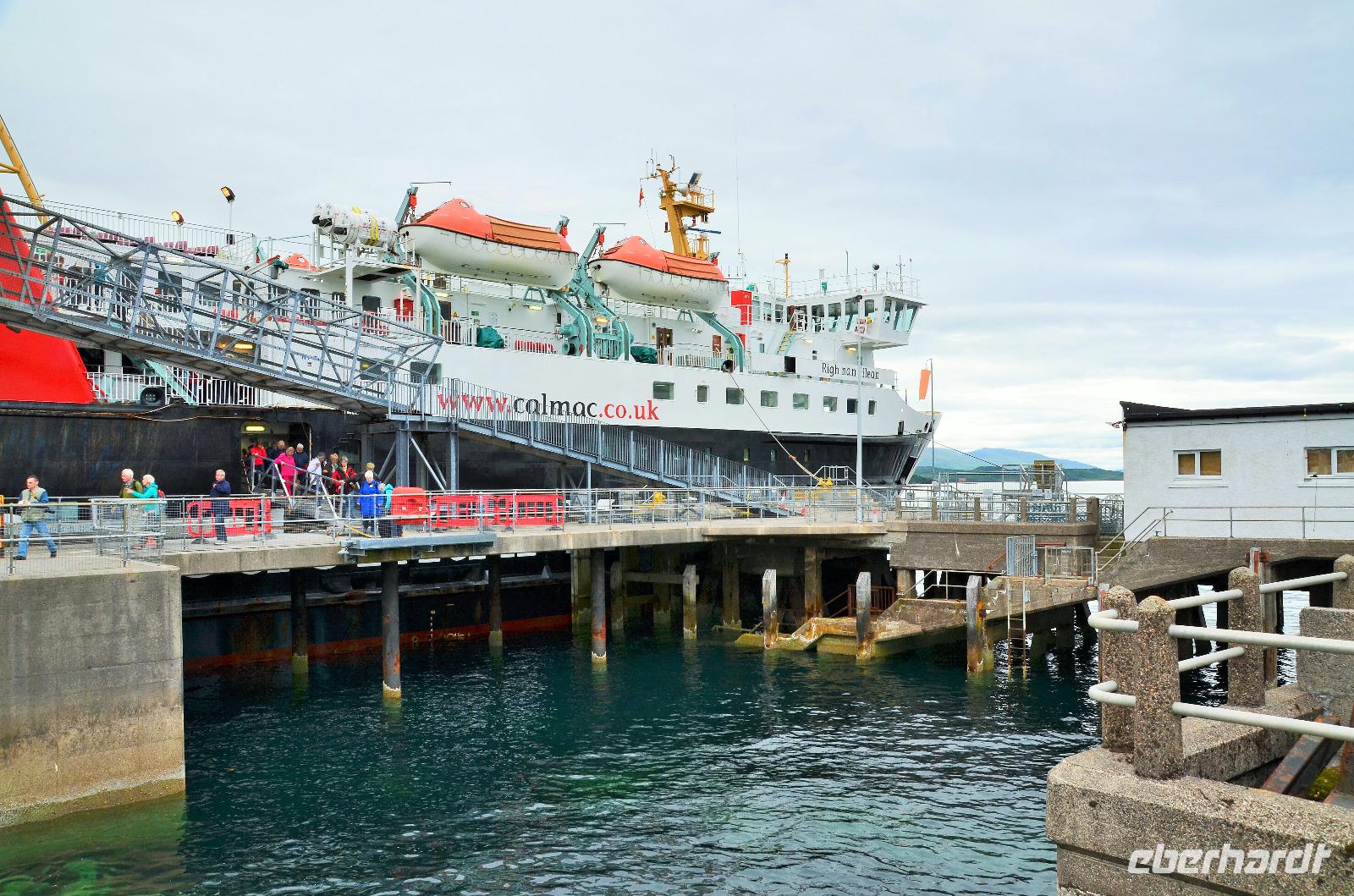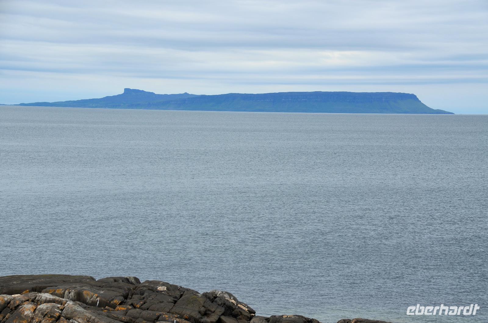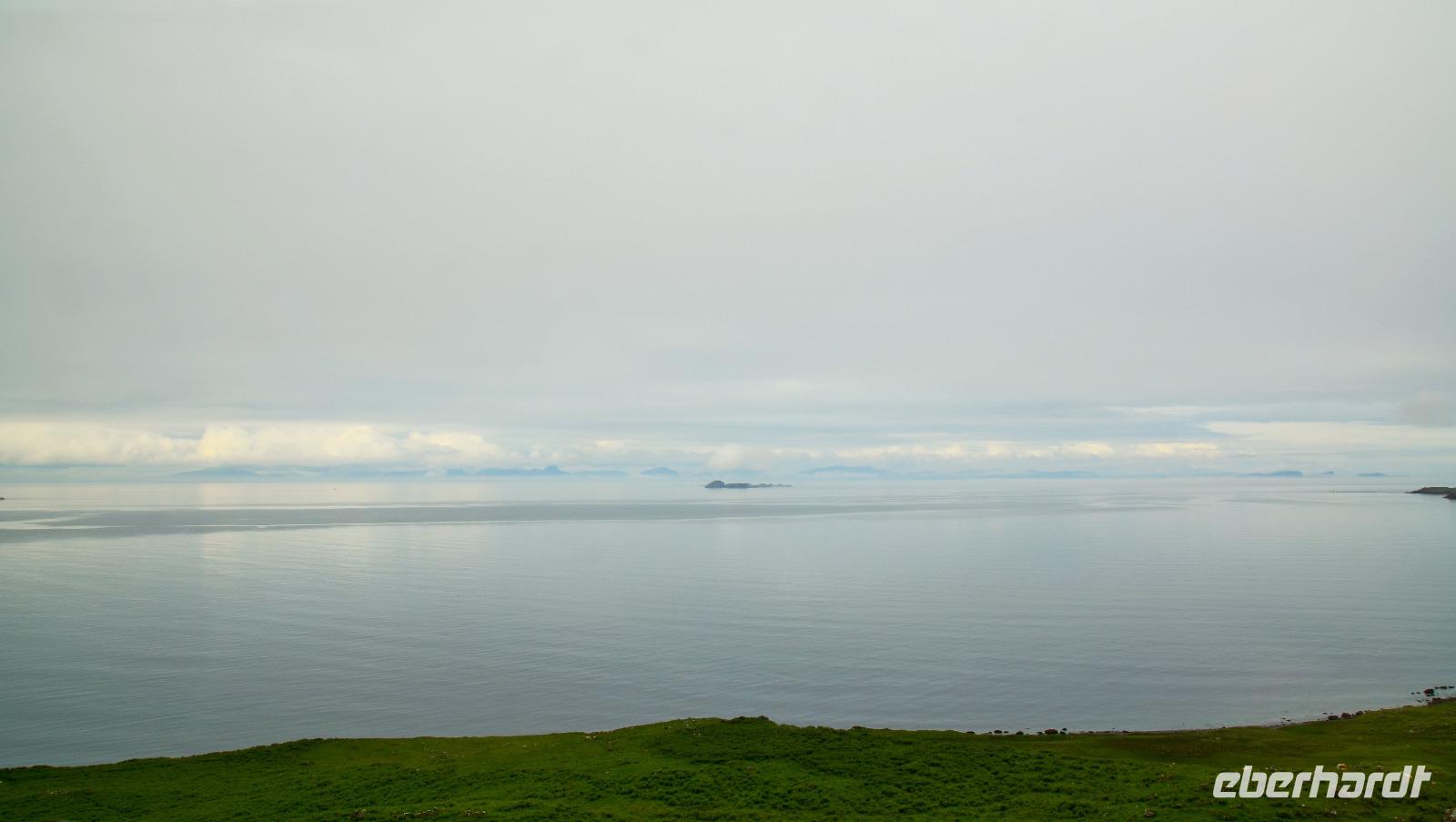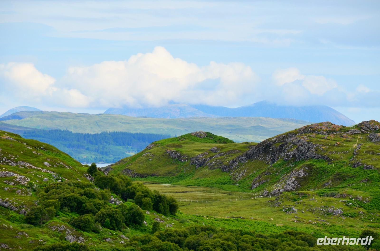 Schließlich erreichen wir die hüglige, von der letzten Eiszeit geformte Küstenlandschaft um Mallaig. An Europas größtem Krabbenumschlagplatz nehmen wir die Fähre hinüber nach Armadale/Advasar - auf die Insel Skye. Die Wolkeninsel präsentiert sich uns wolkenlos im Sonnenschein und entfaltet ihre ganze Schönheit, ebenso die benachbarten Hebrideninseln Rum und Eigg.
