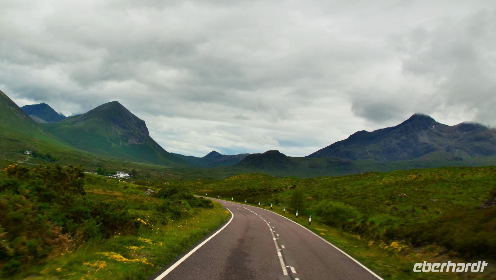 Über Uig geht es zum Westteil der Insel, dem Reich der Familie der MacLeods und zurück in die Cuillin Hills, dem höchsten Gebirge der Insel. Von hier ist es nicht mehr weit bis zur Skyebridge, neben der, in Kyleakin unser Hotel am Loch Alsh liegt.
