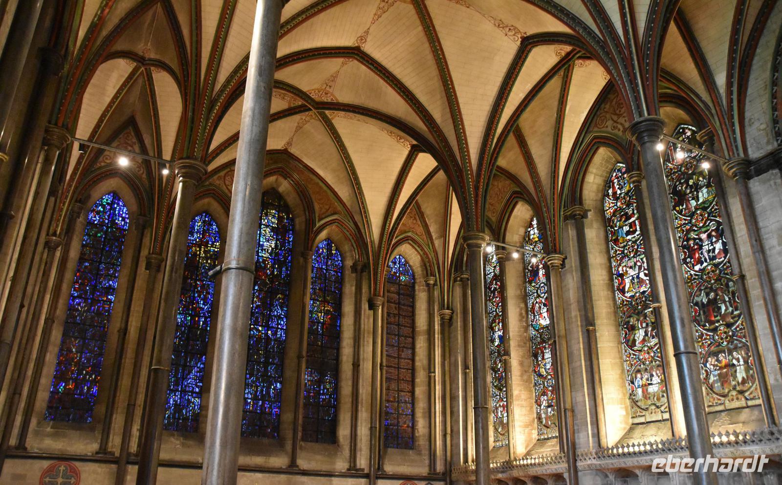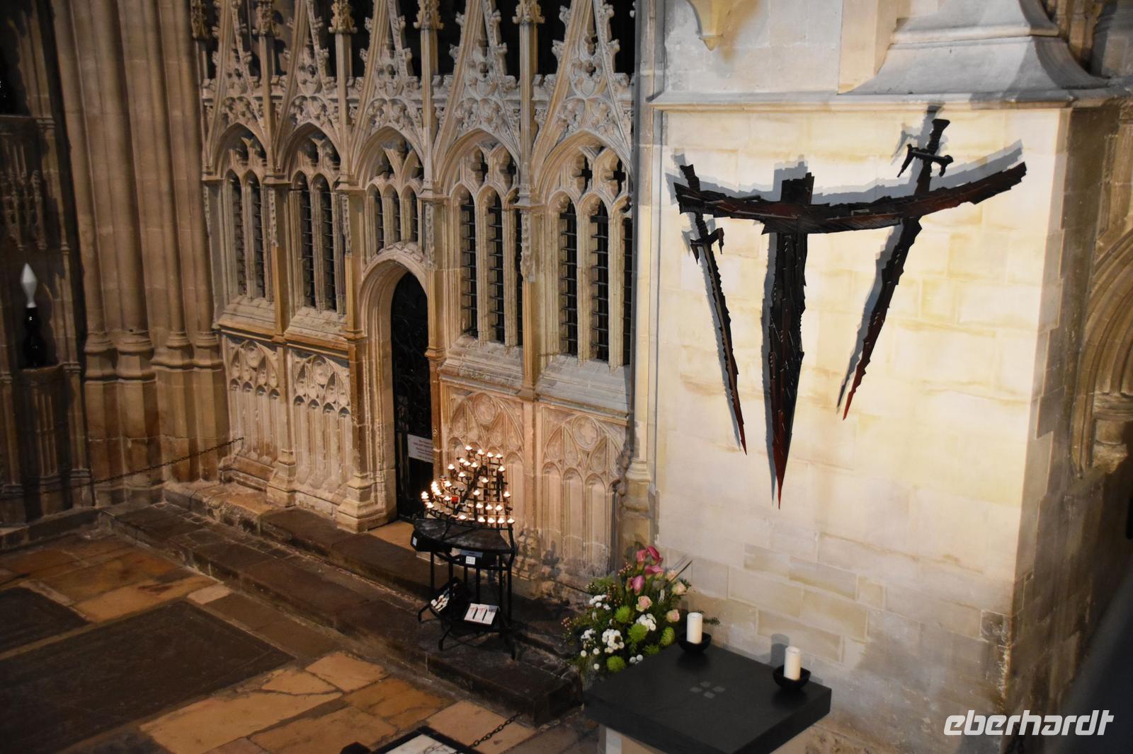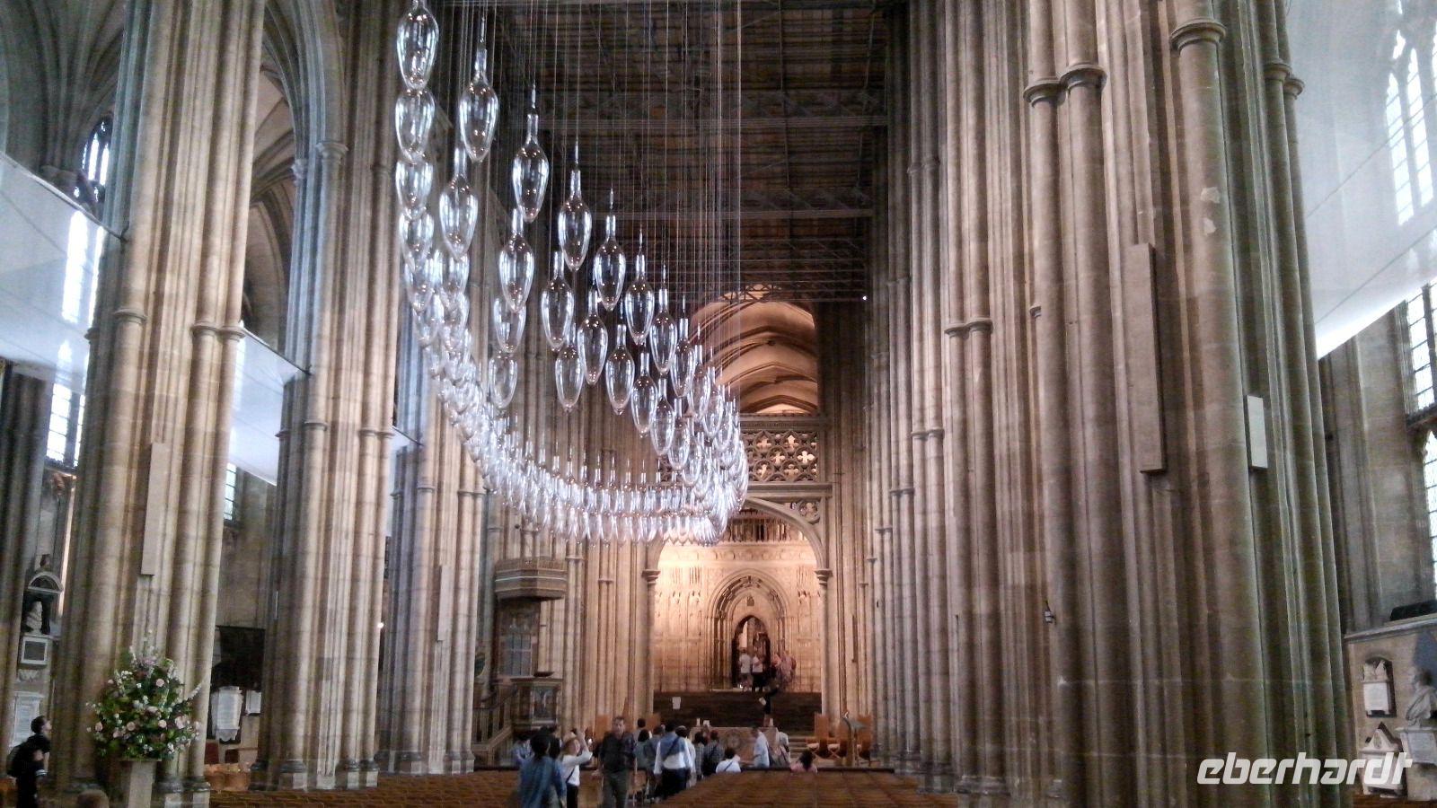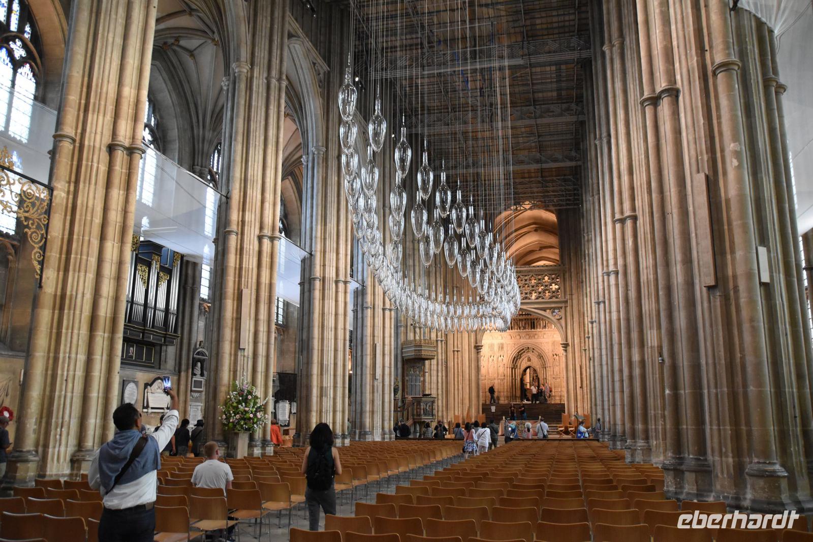 Die Canterbury Cathedral beeindruckte uns dann bei der Besichtigung mit ihrem riesigen Langhaus, dass durch eine schweizerische Glasinstallation noch schöner wirkte. Die herrlich bemalten Bleiglasfenster und die Ausstrahlung der verschiedenen Epochen der englischen Gotik, die diese herrliche Kirche beeindruckend widerspiegelt, sind einmalig.