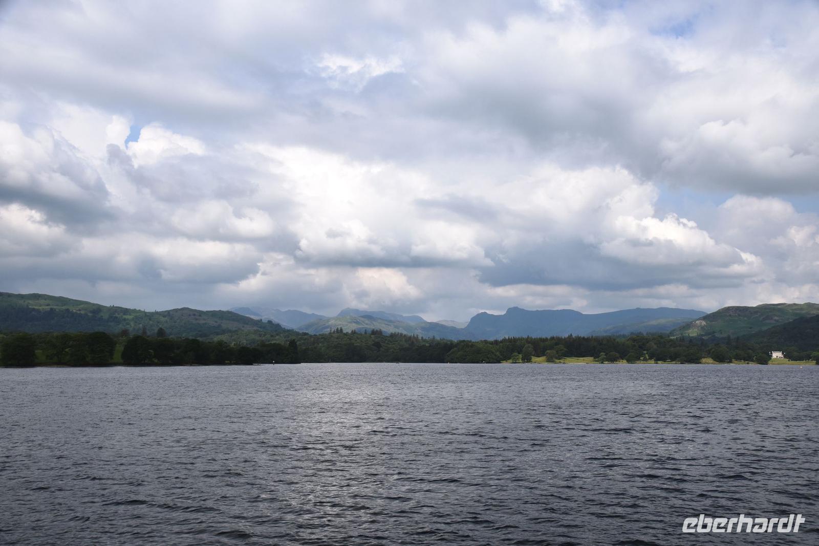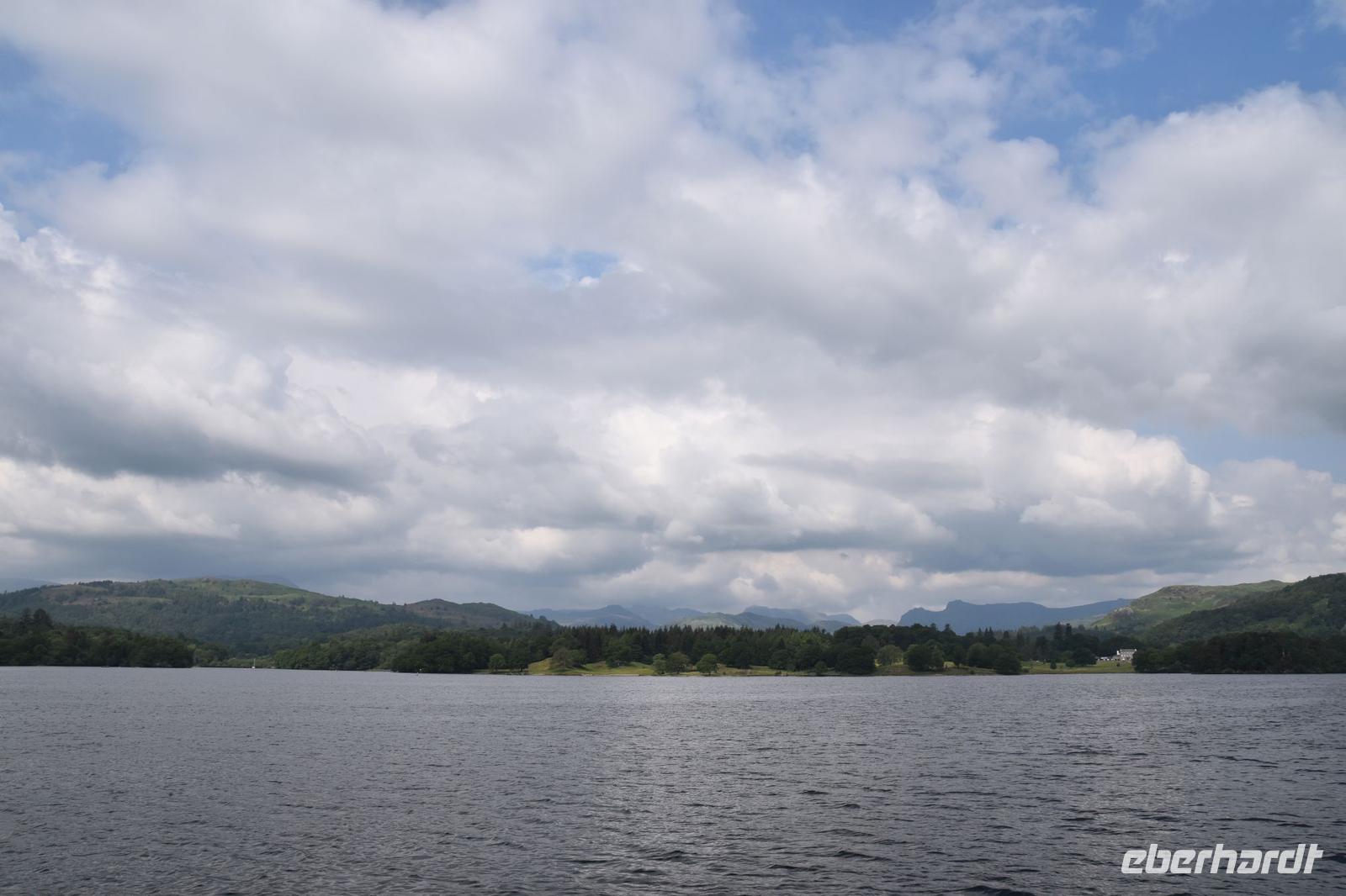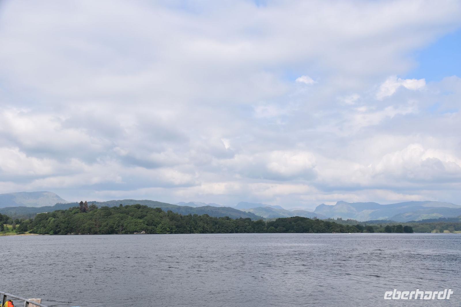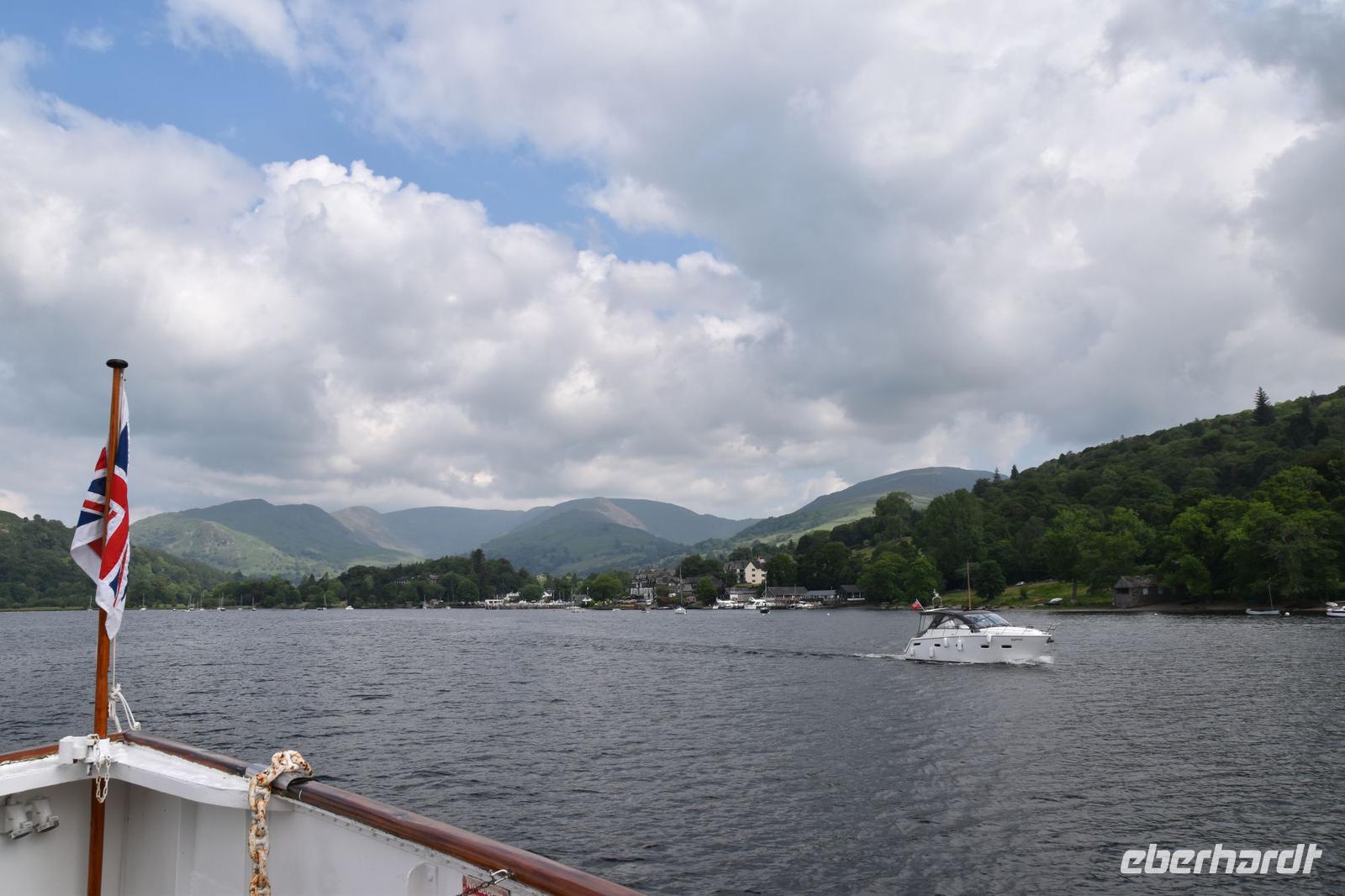 Weiter nach Norden, zum Lake District setzen wir unsere Rundreise fort. In Bowness on Windermere halten wir am Schiffsanleger der Lake Cruises und steigen auf unser Ausflugsschiff, mit dem wir gemächlich über den Lake Windermere schippern - von Bowness bis Ambleside. Hier scheint dann auch wieder die Sonne und auch der höchste Berg Englands, der Scafell Pike (978 m) lugt zu uns herüber.