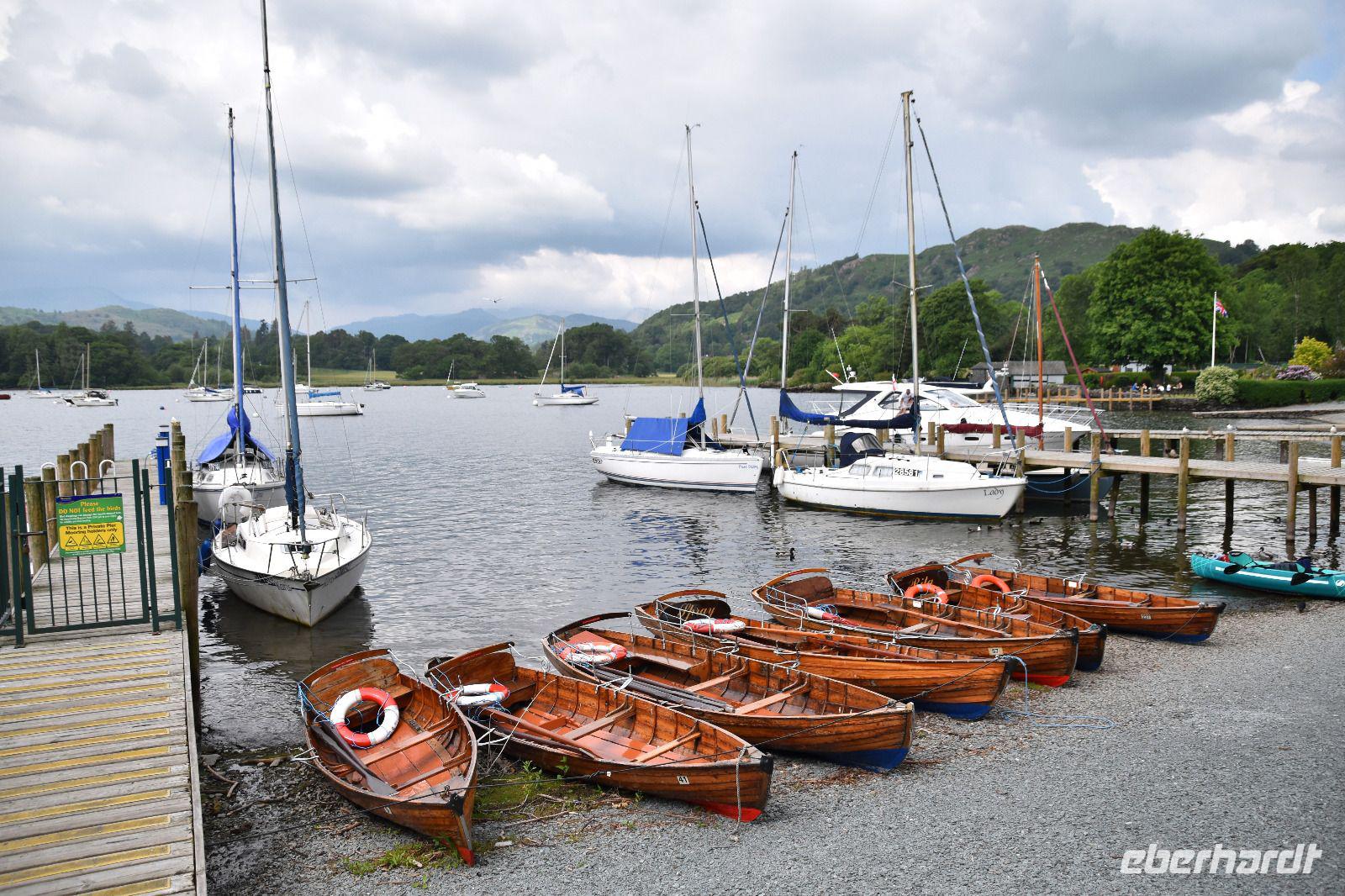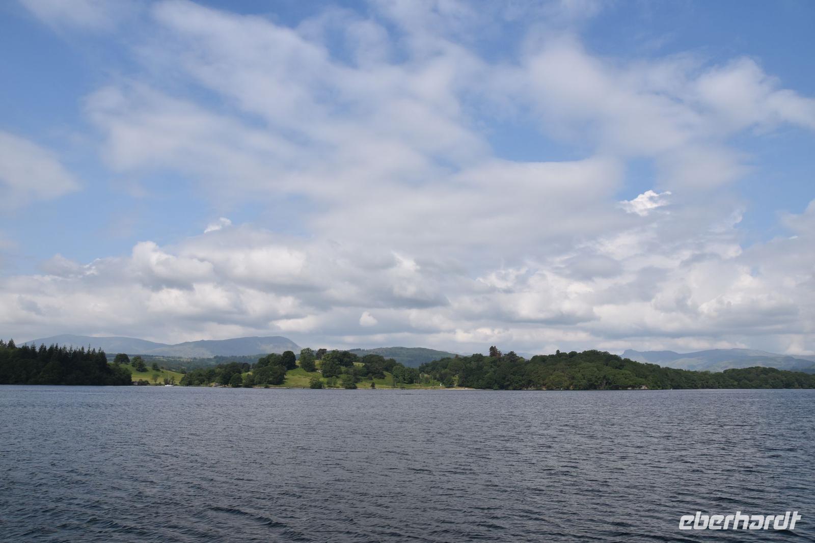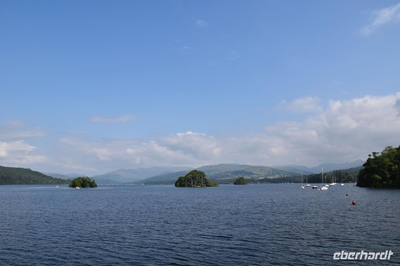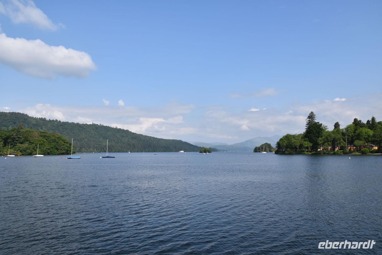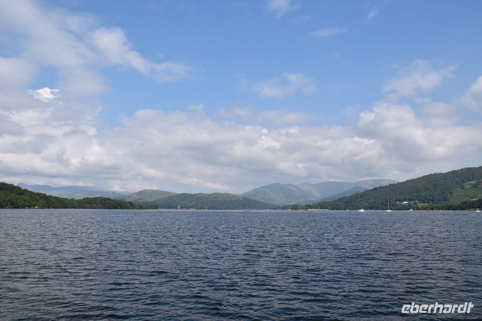 Weiter nach Norden, zum Lake District setzen wir unsere Rundreise fort. In Bowness on Windermere halten wir am Schiffsanleger der Lake Cruises und steigen auf unser Ausflugsschiff, mit dem wir gemächlich über den Lake Windermere schippern - von Bowness bis Ambleside. Hier scheint dann auch wieder die Sonne und auch der höchste Berg Englands, der Scafell Pike (978 m) lugt zu uns herüber.