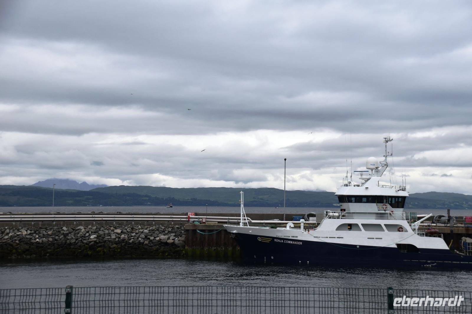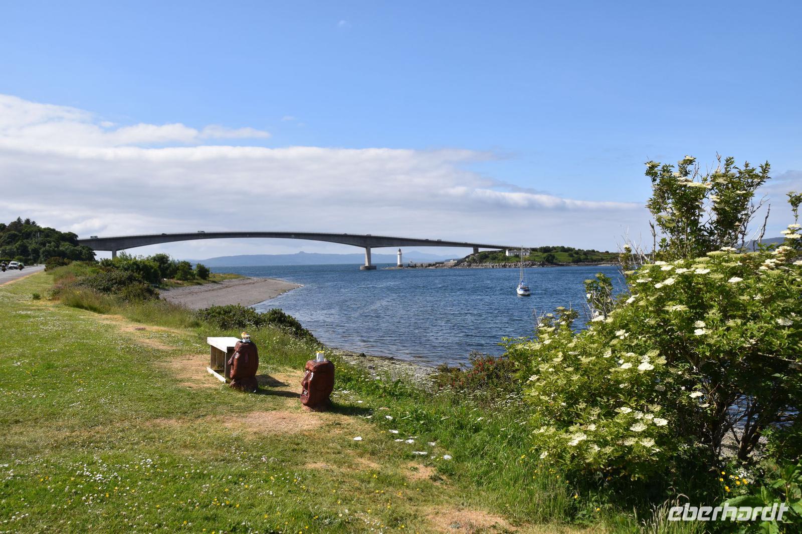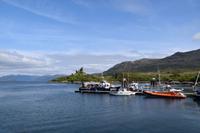 Schließlich erreichen wir die hüglige, von der letzten Eiszeit geformte Küstenlandschaft um Mallaig. An Europas größtem Krabbenumschlagplatz nehmen wir die Fähre hinüber nach Armadale/Advasar - auf die Insel Skye. Die Wolkeninsel präsentiert sich uns wolkenlos im Sonnenschein und entfaltet ihre ganze Schönheit.